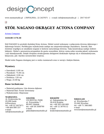 www.momastudio.pl | INFOLINIA.: 22 2437671 | e-mail: [email protected] | 2017-03-07 STÓŁ NAGANO OKRĄGŁY ACTONA COMPANY Actona Company 1410.00 1170.30 Stół NAGANO to produkt duńskiej firmy Actona. Mebel został wykonany z połączenia drewna dębowego i dębowego forniru. Perfekcyjne wykończenie nadaje mu niepowtarzalnego charakteru. Szeroki, blat świetnie współgra ze smukłymi nogami w kolorze naturalnego drewna. Taka konstrukcja nadaje stołowi lekkości. Mebel z pewnością przypadnie do gustu wszystkim, którzy cenią sobie wysoką jakość wykonania i styl skandynawski. Dzięki swojemu atrakcyjnemu designowi doskonale wpisuje się w minimalistyczne, klasyczne, jak i bardzo nowatorskie wnętrza. Model stołu Nagano dostępny jest w wielu rozmiarach oraz w wersji z białym blatem. Wymiary ● ● ● ● ● Szerokość: 0.00 cm Wysokość: 75.00 cm Głębokość: 0.00 cm Średnica: 120 cm Waga: 25.60 kg Dane techniczne ● ● ● Materiał podstawa: Lite drewno dębowe Materiał blat: Fornir drewniany Wykończenie: Olejowane WARSZAWA Al. Krakowska 6a 05-090 Janki k/Warszawy tel: +48 22 2437671 +48 664 890 337 e-mail: [email protected] GDAŃSK CH RENTAL PARK ul. Przywidzka 7 80-001 Gdańsk tel: +48 58 3508790 e-mail: [email protected] KRAKÓW ul. Zakopiańska 56 30-418 Kraków tel: +48 505 436 669 tel: +48 12 3070112 e-mail: [email protected] WROCŁAW ul. Wrocławska 7 55-040 Wrocław tel: +48 71 3461885 e-mail: [email protected]