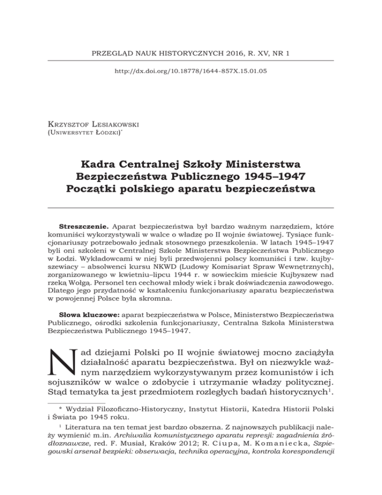 PRZEGLĄD NAUK HISTORYCZNYCH 2016, R. XV, NR 1 http://dx.doi.org/10.18778/1644-857X.15.01.05 K rzysztof Lesiakowski (Uniwersytet Ł ódzki)* Kadra Centralnej Szkoły Ministerstwa Bezpieczeństwa Publicznego 1945–1947 Początki polskiego aparatu bezpieczeństwa Streszczenie. Aparat bezpieczeństwa był bardzo ważnym narzędziem, które komuniści wykorzystywali w walce o władzę po II wojnie światowej. Tysiące funkcjonariuszy potrzebowało jednak stosownego przeszkolenia. W latach 1945–1947 byli oni szkoleni w Centralnej Szkole Ministerstwa Bezpieczeństwa Publicznego w Łodzi. Wykładowcami w niej byli przedwojenni polscy komuniści i tzw. kujbyszewiacy – absolwenci kursu NKWD (Ludowy Komisariat Spraw Wewnętrznych), zorganizowanego w kwietniu–lipcu 1944 r. w sowieckim mieście Kujbyszew nad rzeką Wołgą. Personel ten cechował młody wiek i brak doświadczenia zawodowego. Dlatego jego przydatność w kształceniu funkcjonariuszy aparatu bezpieczeństwa w powojennej Polsce była skromna. Słowa kluczowe: aparat bezpieczeństwa w Polsce, Ministerstwo Bezpieczeństwa Publicznego, ośrodki szkolenia funkcjonariuszy, Centralna Szkoła Ministerstwa Bezpieczeństwa Publicznego 1945–1947. N ad dziejami Polski po II wojnie światowej mocno zaciążyła działalność aparatu bezpieczeństwa. Był on niezwykle ważnym narzędziem wykorzystywanym przez komunistów i ich sojuszników w walce o zdobycie i utrzymanie władzy politycznej. Stąd tematyka ta jest przedmiotem rozległych badań historycznych1. * Wydział Filozoficzno-Historyczny, Instytut Historii, Katedra Historii Polski i Świata po 1945 roku. Literatura na ten temat jest bardzo obszerna. Z najnowszych publikacji należy wymienić m.in. Archiwalia komunistycznego aparatu represji: zagadnienia źródłoznawcze, red. F. Musiał, Kraków 2012; R. C i u p a, M. K o m a n i e c k a, Szpiegowski arsenał bezpieki: obserwacja, technika operacyjna, kontrola korespondencji 1 156 K rzysztof L esiakowski Analizowane są struktury bezpieki i ich działalność, a także kwestie personalne. Trudno jednak zrozumieć funkcjonowanie aparatu bezpieczeństwa bez refleksji dotyczącej kwestii szkolenia funkcjonariuszy. Sprawa nie była szczególnie skomplikowana w okresie, gdy aparat już okrzepł i stworzył własne ośrodki szkoleniowe. Jednak pytanie: jak to wyglądało na początku, ciągle jest intrygujące. Liczne zastępy funkcjonariuszy z chwilą podjęcia służby – w 1945 r. było to już blisko 27 tys. – musiały przecież być przeszkolone, choćby w bardzo ograniczonym zakresie. Zatem gdzie i kto ich szkolił? Przedmiotem poniższego tekstu będzie poszukiwanie odpowiedzi na powyższe pytanie ze szczególnym uwzględnieniem jego drugiego segmentu – tzn. kim były osoby, które stanowiły trzon kadry istniejącej w latach 1945–1947 Centralnej Szkoły (CS) Ministerstwa Bezpieczeństwa Publicznego (MBP). Problem ten jest ciekawy z uwagi na to, że z oczywistych względów nowa władza nie mogła skorzystać z przedwojennych kadr policyjnych czy kontrwywiadu wojskowego, które zajmowały się zwalczaniem nielegalnych organizacji politycznych. Czy zatem wykładowcami byli – jakby należało przypuszczać – wyłącznie oficerowie sowieckich służb specjalnych, a może osoby polskiego pochodzenia wcześniej odpowiednio przygotowane do roli „pierwszych nauczycieli” tworzonej bezpieki? W tym drugim wypadku chodzi głównie o tzw. kujbyszewiaków, czyli absolwentów szkolenia zorganizowanego w kwietniu–lipcu 1944 r. w Kujbyszewie w Związku Socjalistycznych Republik Radzieckich (ZSRR)2. Powstanie CS MBP CS MBP powstała na bazie utworzonej 17 października 1944 r. w Lublinie Szkoły Oficerów Bezpieczeństwa przy Resorcie Bezpieczeństwa Publicznego. W związku z rozpoczęciem w styczniu następnego roku wielkiej ofensywy przez wojska sowieckie zapadła decyzja o przeniesieniu placówki do Łodzi3. Wynikało ono z tego, że jako środki pracy Służby Bezpieczeństwa PRL, Katowice 2011; Historyczno-prawna analiza struktur organów bezpieczeństwa Polski Ludowej (1944–1990): zbiór studiów, red. A. Jusupović, R. Leśkiewicz, Warszawa 2013; R. T e r l e c k i, Miecz i tarcza komunizmu: historia aparatu bezpieczeństwa w Polsce 1944–1990, Kraków 2013; Wokół teczek bezpieki: zagadnienia metodologiczno-źródłoznawcze, red. F. Musiał, Kraków 2006; „Zwyczajny resort”. Studia o aparacie bezpieczeństwa 1944–1956, red. K. Krajewski, T. Łabuszewski, Warszawa 2005. 2 M. K o r k u ć, „Kujbyszewiacy” – awangarda UB, „Arcana” 2002, z. 46–47, s. 74–95. 3 Wyższa Szkoła Oficerska MSW im. F. Dzierżyńskiego. Rodowód, powstanie i działalność, Warszawa 1983, s. 10. Por. też A. F r ą c z e k, Wspomnienia absolwenta, Kadra Centralnej Szkoły MBP… 157 w zniszczonej stolicy nie było odpowiednich warunków lokalowych. Warto wspomnieć, że na takie rozwiązanie na okres przejściowy zdecydowało się wiele instytucji kulturalnych, prasowo-wydawniczych i gospodarczych. Podobnie było z niektórymi szkołami, w tym z tymi o charakterze specjalnym. W 1945 r. w Łodzi zaczęły też działać: Szkoła Oficerów Polityczno-Wychowawczych Wojska Polskiego (WP), Szkoła Oficerska Intendentury WP; Szkoła Oficerów Liniowych Milicji Obywatelskiej (MO) – Kurs Przeszkolenia Kierowników Jednostek (później Ośrodek Szkolenia Oficerów MO), Centralna Szkoła Oficerów Polityczno-Wychowawczych MO oraz Centralna Szkoła Partyjna i Centralna Szkoła Związku Walki Młodych, a w podłódzkim Andrzejowie od kwietnia 1945 r. zaczęło działać Centrum Wyszkolenia Wojsk Wewnętrznych (później Oficerska Szkoła Korpusu Bezpieczeństwa Wewnętrznego)4. W tej sytuacji zmiana lokalizacji Szkoły Oficerów Bezpieczeństwa nie było niczym wyjątkowym. Z chwilą przeniesienia – dokładniej 5 marca 1945 r. – została zmieniona jej nazwa na Centralną Szkołę MBP5, co było zbieżne – jak wynika z nazw wymien