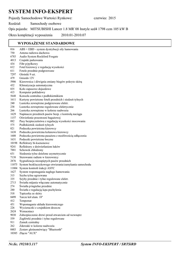 SYSTEM INFO-EKSPERT Pojazdy Samochodowe Wartości Rynkowe: czerwiec 2015 Rozdział: Samochody osobowe Opis pojazdu: MITSUBISHI Lancer 1.8 MR`08 Instyle sed4 1798 ccm 105 kW B Okres kompletacji wyposażenia 2010.01-2010.07 WYPOSAŻENIE STANDARDOWE 016 750 6783 4013 434 612 611 7297 479 5906 432 835 415 5648 1611 240 238 266 1629 1157 082 575 021 1638 1608 1631 10198 9241 7881 631 7138 2876 11075 11804 1627 315 335 2713 274 280 518 8499 412 451 226 2624 9030 559 911 262 0483 10385 ABS + EBD - system dystrybucji siły hamowania Antena radiowa dachowa Audio System Rockford Fosgate Czujniki parkowania Filtr p/pyłkowy Fotel kierowcy z regulacją wysokości Fotele przednie podgrzewane Głośniki 9 szt. Gniazdo 12V Kierownica i dźwignia zmiany biegów pokryte skórą Klimatyzacja automatyczna Koło zapasowe dojazdowe Komputer pokładowy Konsola centralna z podłokietnikiem Kurtyny powietrzne foteli przednich i siedzeń tylnych Lusterka zewnętrzne podgrzewane elektr. Lusterka zewnętrzne regulowane elektrycznie Lusterka zewnętrzne w kolorze nadwozia Napinacze przednich pasów bezp. z kontrolą naciągu Oświetlenie przestrzeni bagażowej Pasy bezpieczeństwa z regulacją wysokości mocowania Podłokietnik siedzeń tylnych Poduszka powietrzna kierowcy Poduszka powietrzna kolanowa kierowcy Poduszka powietrzna pasażera z możliwością odłączenia Poduszki powietrzne boczne Reflektory bi-ksenonowe Reflektory z doświetlaniem luków Schowek chłodzony Siedzenia tylne dzielone asymetrycznie Sterowanie radiem w kierownicy Sygnalizacja niezapiętych pasów przednich System bezkluczykowego otwierania/zamykania samochodu System kontroli trakcji ASTC System wspomagania nagłego hamowania Szyba tylna ogrzewana Szyby przednie i tylne regulowane elektr. Światła mijania włączane automatycznie Światła p/mgielne przednie Światła z regulacją kąta pochylenia Tapicerka ze skóry Tarcze kół alum. 18" Tempomat Wspomaganie układu kierowniczego Wycieraczki z czujnikiem deszczu Wzmacniacz Zabezpieczenie drzwi przed otwarciem od wewnątrz Zagłówki przednie i tylne regulowane Zamek centralny Zderzaki w kolorze nadwozia Zestaw głośnomówiący "Bluetooth" Złącze "AUX" Nr.lic. 19210/3.117 System INFO-EKSPERT / SRTSiRD WYPOSAŻENIE DODATKOWE OFEROWANE PRZEZ PRODUCENTA 210 219 150 Lakier metalizowany Lakier perłowy Skrzynia biegów automatyczna Nr.lic. 19210/3.117 System INFO-EKSPERT / SRTSiRD