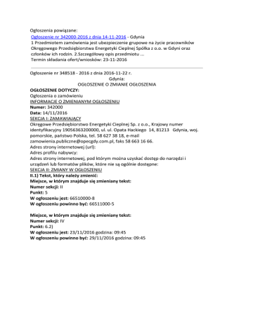 Ogłoszenia powiązane: Ogłoszenie nr 342000-2016 z dnia 14-11-2016 - Gdynia 1 Przedmiotem zamówienia jest ubezpieczenie grupowe na życie pracowników Okręgowego Przedsiębiorstwa Energetyki Cieplnej Spółka z o.o. w Gdyni oraz członków ich rodzin. 2.Szczegółowy opis przedmiotu ... Termin składania ofert/wniosków: 23-11-2016 Ogłoszenie nr 348518 - 2016 z dnia 2016-11-22 r. Gdynia: OGŁOSZENIE O ZMIANIE OGŁOSZENIA OGŁOSZENIE DOTYCZY: Ogłoszenia o zamówieniu INFORMACJE O ZMIENIANYM OGŁOSZENIU Numer: 342000 Data: 14/11/2016 SEKCJA I: ZAMAWIAJĄCY Okręgowe Przedsiębiorstwo Energetyki Cieplnej Sp. z o.o., Krajowy numer identyfikacyjny 19056363200000, ul. ul. Opata Hackiego 14, 81213 Gdynia, woj. pomorskie, państwo Polska, tel. 58 627 38 18, e-mail [email protected], faks 58 663 16 66. Adres strony internetowej (url): Adres profilu nabywcy: Adres strony internetowej, pod którym można uzyskać dostęp do narzędzi i urządzeń lub formatów plików, które nie są ogólnie dostępne: SEKCJA II: ZMIANY W OGŁOSZENIU II.1) Tekst, który należy zmienić: Miejsce, w którym znajduje się zmieniany tekst: Numer sekcji: II Punkt: 5 W ogłoszeniu jest: 66510000-8 W ogłoszeniu powinno być: 66511000-5 Miejsce, w którym znajduje się zmieniany tekst: Numer sekcji: IV Punkt: 6.2) W ogłoszeniu jest: 23/11/2016 godzina: 09:45 W ogłoszeniu powinno być: 29/11/2016 godzina: 09:45
