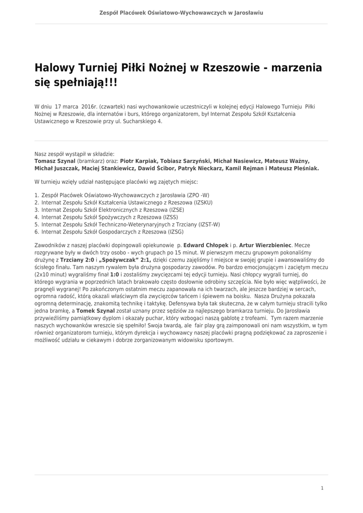Zespół Placówek Oświatowo-Wychowawczych w Jarosławiu Halowy Turniej Piłki Nożnej w Rzeszowie - marzenia się spełniają!!! W dniu 17 marca 2016r. (czwartek) nasi wychowankowie uczestniczyli w kolejnej edycji Halowego Turnieju Piłki Nożnej w Rzeszowie, dla internatów i burs, którego organizatorem, był Internat Zespołu Szkół Kształcenia Ustawicznego w Rzeszowie przy ul. Sucharskiego 4. Nasz zespół wystąpił w składzie: Tomasz Szynal (bramkarz) oraz: Piotr Karpiak, Tobiasz Sarzyński, Michał Nasiewicz, Mateusz Ważny, Michał Juszczak, Maciej Stankiewicz, Dawid Ścibor, Patryk Nieckarz, Kamil Rejman i Mateusz Pleśniak. W turnieju wzięły udział następujące placówki wg zajętych miejsc: 1. 2. 3. 4. 5. 6. Zespół Placówek Oświatowo-Wychowawczych z Jarosławia (ZPO -W) Internat Zespołu Szkół Kształcenia Ustawicznego z Rzeszowa (IZSKU) Internat Zespołu Szkół Elektronicznych z Rzeszowa (IZSE) Internat Zespołu Szkół Spożywczych z Rzeszowa (IZSS) Internat Zespołu Szkół Techniczno-Weterynaryjnych z Trzciany (IZST-W) Internat Zespołu Szkół Gospodarczych z Rzeszowa (IZSG) Zawodników z naszej placówki dopingowali opiekunowie p. Edward Chłopek i p. Artur Wierzbieniec. Mecze rozgrywane były w dwóch trzy osobo - wych grupach po 15 minut. W pierwszym meczu grupowym pokonaliśmy drużynę z Trzciany 2:0 i „Spożywczak” 2:1, dzięki czemu zajęliśmy I miejsce w swojej grupie i awansowaliśmy do ścisłego finału. Tam naszym rywalem była drużyna gospodarzy zawodów. Po bardzo emocjonującym i zaciętym meczu (2x10 minut) wygraliśmy finał 1:0 i zostaliśmy zwycięzcami tej edycji turnieju. Nasi chłopcy wygrali turniej, do którego wygrania w poprzednich latach brakowało często dosłownie odrobiny szczęścia. Nie było więc wątpliwości, że pragnęli wygranej! Po zakończonym ostatnim meczu zapanowała na ich twarzach, ale jeszcze bardziej w sercach, ogromna radość, którą okazali właściwym dla zwycięzców tańcem i śpiewem na boisku. Nasza Drużyna pokazała ogromną determinację, znakomitą technikę i taktykę. Defensywa była tak skuteczna, że w całym turnieju stracili tylko jedna bramkę, a Tomek Szynal został uznany przez sędziów za najlepszego bramkarza turnieju. Do Jarosławia przywieźliśmy pamiątkowy dyplom i okazały puchar, który wzbogaci naszą gablotę z trofeami. Tym razem marzenie naszych wychowanków wreszcie się spełniło! Swoja twardą, ale fair play grą zaimponowali oni nam wszystkim, w tym również organizatorom turnieju, którym dyrekcja i wychowawcy naszej placówki pragną podziękować za zaproszenie i możliwość udziału w ciekawym i dobrze zorganizowanym widowisku sportowym. 1