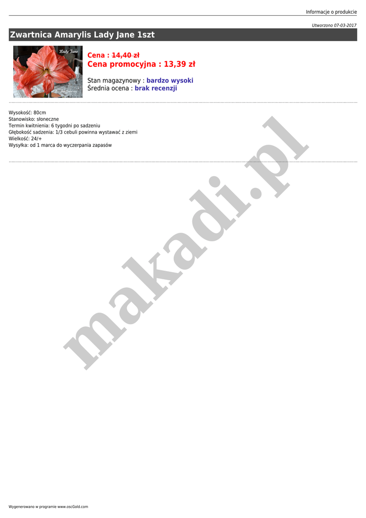Informacje o produkcie Utworzono 07-03-2017 Zwartnica Amarylis Lady Jane 1szt Cena : 14,40 zł Cena promocyjna : 13,39 zł Stan magazynowy : bardzo wysoki Średnia ocena : brak recenzji m ak ad i.p l Wysokość: 80cm Stanowisko: słoneczne Termin kwitnienia: 6 tygodni po sadzeniu Głębokość sadzenia: 1/3 cebuli powinna wystawać z ziemi Wielkość: 24/+ Wysyłka: od 1 marca do wyczerpania zapasów Wygenerowano w programie www.oscGold.com