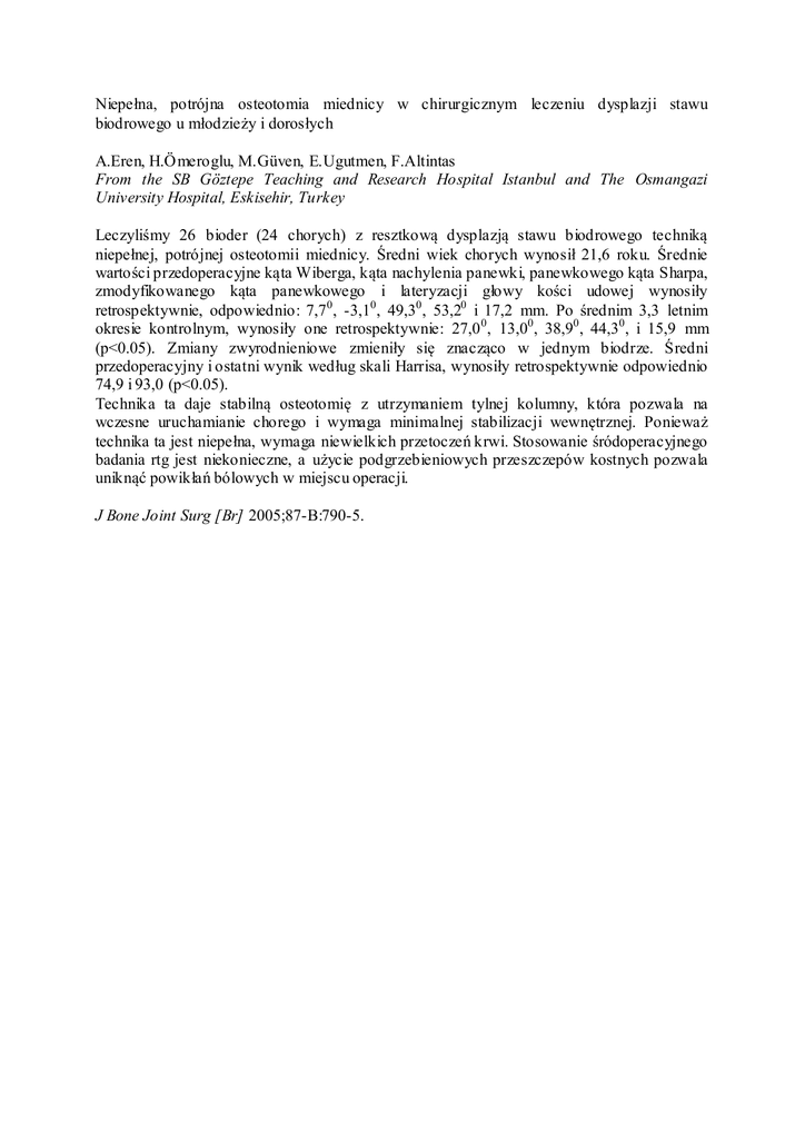 Niepełna, potrójna osteotomia miednicy w chirurgicznym leczeniu dysplazji stawu biodrowego u młodzieży i dorosłych A.Eren, H.Ömeroglu, M.Güven, E.Ugutmen, F.Altintas From the SB Göztepe Teaching and Research Hospital Istanbul and The Osmangazi University Hospital, Eskisehir, Turkey Leczyliśmy 26 bioder (24 chorych) z resztkową dysplazją stawu biodrowego techniką niepełnej, potrójnej osteotomii miednicy. Średni wiek chorych wynosił 21,6 roku. Średnie wartości przedoperacyjne kąta Wiberga, kąta nachylenia panewki, panewkowego kąta Sharpa, zmodyfikowanego kąta panewkowego i lateryzacji głowy kości udowej wynosiły retrospektywnie, odpowiednio: 7,70 , -3,10 , 49,30 , 53,20 i 17,2 mm. Po średnim 3,3 letnim okresie kontrolnym, wynosiły one retrospektywnie: 27,0 0 , 13,00 , 38,90 , 44,30 , i 15,9 mm (p<0.05). Zmiany zwyrodnieniowe zmieniły się znacząco w jednym biodrze. Średni przedoperacyjny i ostatni wynik według skali Harrisa, wynosiły retrospektywnie odpowiednio 74,9 i 93,0 (p<0.05). Technika ta daje stabilną osteotomię z utrzymaniem tylnej kolumny, która pozwala na wczesne uruchamianie chorego i wymaga minimalnej stabilizacji wewnętrznej. Ponieważ technika ta jest niepełna, wymaga niewielkich przetoczeń krwi. Stosowanie śródoperacyjnego badania rtg jest niekonieczne, a użycie podgrzebieniowych przeszczepów kostnych pozwala uniknąć powikłań bólowych w miejscu operacji. J Bone Joint Surg [Br] 2005;87-B:790-5.