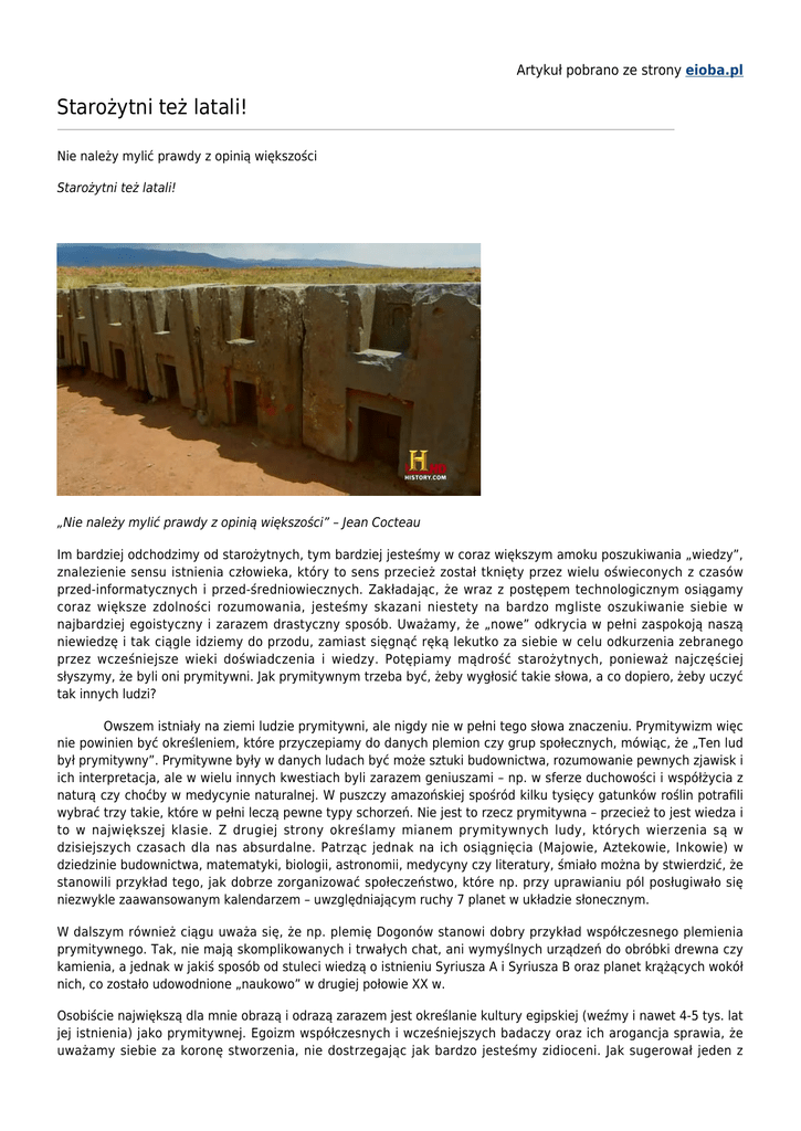 Artykuł pobrano ze strony eioba.pl Starożytni też latali! Nie należy mylić prawdy z opinią większości Starożytni też latali! „Nie należy mylić prawdy z opinią większości” – Jean Cocteau Im bardziej odchodzimy od starożytnych, tym bardziej jesteśmy w coraz większym amoku poszukiwania „wiedzy”, znalezienie sensu istnienia człowieka, który to sens przecież został tknięty przez wielu oświeconych z czasów przed-informatycznych i przed-średniowiecznych. Zakładając, że wraz z postępem technologicznym osiągamy coraz większe zdolności rozumowania, jesteśmy skazani niestety na bardzo mgliste oszukiwanie siebie w najbardziej egoistyczny i zarazem drastyczny sposób. Uważamy, że „nowe” odkrycia w pełni zaspokoją naszą niewiedzę i tak ciągle idziemy do przodu, zamiast sięgnąć ręką lekutko za siebie w celu odkurzenia zebranego przez wcześniejsze wieki doświadczenia i wiedzy. Potępiamy mądrość starożytnych, ponieważ najczęściej słyszymy, że byli oni prymitywni. Jak prymitywnym trzeba być, żeby wygłosić takie słowa, a co dopiero, żeby uczyć tak innych ludzi? Owszem istniały na ziemi ludzie prymitywni, ale nigdy nie w pełni tego słowa znaczeniu. Prymitywizm więc nie powinien być określeniem, które przyczepiamy do danych plemion czy grup społecznych, mówiąc, że „Ten lud był prymitywny”. Prymitywne były w danych ludach być może sztuki budownictwa, rozumowanie pewnych zjawisk i ich interpretacja, ale w wielu innych kwestiach byli zarazem geniuszami – np. w sferze duchowości i współżycia z naturą czy choćby w medycynie naturalnej. W puszczy amazońskiej spośród kilku tysięcy gatunków roślin potrafili wybrać trzy takie, które w pełni leczą pewne typy schorzeń. Nie jest to rzecz prymitywna – przecież to jest wiedza i to w największej klasie. Z drugiej strony określamy mianem prymitywnych ludy, których wierzenia są w dzisiejszych czasach dla nas absurdalne. Patrząc jednak na ich osiągnięcia (Majowie, Aztekowie, Inkowie) w dziedzinie budownictwa, matematyki, biologii, astronomii, medycyny czy literatury, śmiało można by stwierdzić, że stanowili przykład tego, jak dobrze zorganizować społeczeństwo, które np. przy uprawianiu pól posługiwało się niezwykle zaawansowanym kalendarzem – uwzględniającym ruchy 7 planet w układzie słonecznym. W dalszym również ciągu uważa się, że np. plemię Dogonów stanowi dobry przykład współczesnego plemienia prymitywnego. Tak, nie mają skomplikowanych i trwałych chat, ani wymyślnych urządzeń do obróbki drewna czy kamienia, a jednak w jakiś sposób od stuleci wiedzą o istnieniu Syriusza A i Syriusza B oraz planet krążących wokół nich, co zostało udowodnione „naukowo” w drugiej połowie XX w. Osobiście największą dla mnie obrazą i odrazą zarazem jest określanie kultury egipskiej (weźmy i nawet 4-5 tys. lat jej istnienia) jako prymitywnej. Egoizm współczesnych i wcześniejszych badaczy oraz ich arogancja sprawia, że uważamy siebie za koronę stworzenia, nie dostrzegając jak bardzo jesteśmy zidioceni. Jak sugerował jeden z badaczy zajmujących się zidentyfikowaniem narzędzi i techniki budowania piramid, Egipcjanie używali w tym celu m.in. młotka oraz różnej wielkości kulek do ciosania kamienia oraz ich kształtowania. Jednak już w trakcie omawiania swojej teorii profesor nie dostrzegł problemu jakim jest niemożność wykreowania idealnego kąta prostego za pomocą kuleczek, chyba że były by one milimetrowych rozmiarów, co przy Wielkiej Piramidzie zajęło by budowniczym tyle czasu, że chyba do tej pory widzielibyśmy rusztowania w Gizie i masę robotników. Całe bogactwo Egiptu, również to, które wciąż jest pod piaskiem (jak ujawniły niedawno badania satelitarne) dowodzi, że mamy do czynienia z kolejnymi geniuszami w sztuce budownictwa, astronomii, matematyki, fizyki, geografii, geometrii, i inżynierii szeroko rozumianej. Do tego dochodzą bezinwazyjne sposoby leczenia Egipcjan, jak np. leczenie urazów wewnętrznych za pomocą dźwięków. „Człowiek boi się czasu, Czas boi się piramid”. My ludzie, rzekoma korona stworzenia, nie dostrzegamy i nie czerpiemy starożytnej wiedzy, bo była prymitywna w swej istocie? Historycy czerpią wiele informacji ze starych źródeł, bo niekiedy nie ma innej możliwości jak przestudiować pisma, które są świadectwem osobistego zobaczenia czegoś i opisania zjawisk czy budowli, których dziś już nie ma. Boli niezwykle zarazem to, jak wybiórczo traktowana jest historia. Historia bowiem w dzisiejszych czasach dzieli się na historię A i historię B. Historia A to historia, która jest oficjalną wersją zdarzeń, nie zawierającą w sobie nic nadzwyczajnego, w której najczęściej wszystko w czasie miało prostą przyczynę i prosty skutek (niezależnie od rozmachu). Historia B natomiast to składowa historii A, która nie została uwzględniona przez historyków z powodu swojej „niewiarygodności”, nawet jeśli dany naukowiec czerpie z tego samego źródła do opracowania historii A, która później trafia na stoły akademickie. Dobrym przykładem jest korzystanie ze źródeł i Dziejów Herodota, tzw. Ojca Historii, który na dobrą sprawę nie był pierwszym Ojcem Historii w ogóle. W sprawie Herodota panuje wręcz kakofonia histeryczna wśród historyków. I tak np. akceptuję się wiele z jego podań dotyczących wojny greków z persami czy podróży na Wschód i do północnej Afryki i nie ma żadnych ALE, jeśli chodzi o jego wiarygodność w tych kwestiach. Są jednak „naoczne” opowiadania/reportaże Herodota, które historycy odrzucają i szufladkują. Z jednej więc strony mamy przykład świetnych reportaży z okresu starożytności, z drugiej zaś, niekiedy kilka stron dalej w pismach Herodota, naukowcy dostrzegają bajki i fantazję, mimo że ów starożytny historyk dalej pisze w pierwszej osobie i w dalszym ci