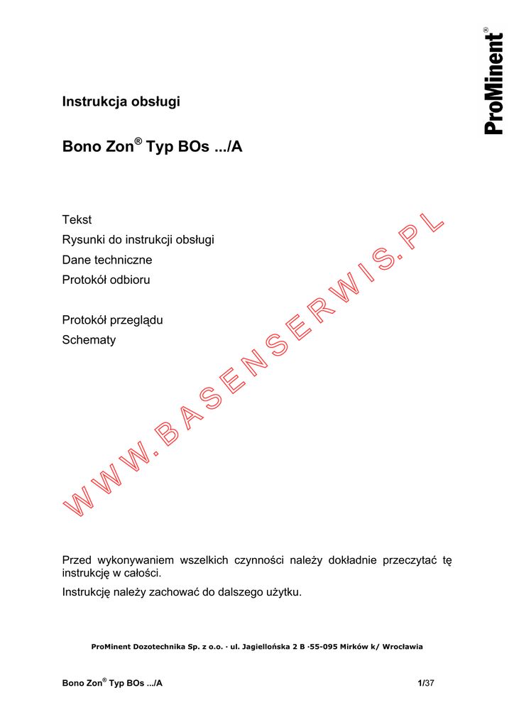 Instrukcja obsługi Bono Zon® Typ BOs .../A Tekst Rysunki do instrukcji obsługi Dane techniczne Protokół odbioru Protokół przeglądu Schematy W W W .B A S E N S E R W I P . S L Przed wykonywaniem wszelkich czynności należy dokładnie przeczytać tę instrukcję w całości. Instrukcję należy zachować do dalszego użytku. ProMinent Dozotechnika Sp. z o.o. · ul. Jagiellońska 2 B ·55-095 Mirków k/ Wrocławia Bono Zon® Typ BOs .../A 1/37 Gwarancja nie obejmuje szkód spowodowanych przez nieprzestrzeganie instrukcji obsługi. Spis treści 1. 1.1 1.1.1 1.1.2 1.2 1.2.1 1.2.2 1.2.2.1 1.2.2.2 1.2.3 1.2.4 1.2.5 1.2.6 1.3 Wstęp Ozon Charakterystyka ozonu Generowanie ozonu Definicje pojęć Instalacja ozonowa Instalacja generatora ozonu Generator ozonu Ozonizator Układ mieszania Zbiornik reakcyjny Układ eliminacji ozonu pozostałościowego Układ podciśnieniowy Opis funkcji generowania ozonu 2. 2.1 2.1.1 2.1.2 2.2 2.2.1 2.2.2 2.2.3 2.2.4 2.3 2.3.1 2.3.2 2.4 2.4.1 2.5 2.6 2.7 2.7.1 2.8 2.9 2.9.1 2.9.2 2.9.3 2.9.4 Budowa systemu Bono Zon® Typoszeregi Systemy z ręczną regulacją wydajności BOs .../A Systemy z automatyczną regulacją wydajności BOr .../A Układ uzdatniania powietrza Ręczne uruchamianie regeneracji Przerywanie regeneracji Wznawianie regeneracji po ręcznym przerwaniu Przełączanie adsorberów Generowanie ozonu Woda chłodząca Czujnik przepływu powietrza Instalacja elektryczna Układ sterowania Nastawianie generowania ozonu Transformator wysokiego napięcia Transformator regulacyjny Transformator sterowniczy Wskaźniki Urządzenia bezpieczeństwa Łącznik blokujący Zestyk drzwiowy Nadzorowanie pracy przez programowalny logiczny układ sterujący (PLC) Wyłącznik awaryjny 3. 3.1 3.2 3.3 Budowa układu mieszania ProMinent® Wyposażenie do transportu ozonu Zbiornik mieszania Zbiornik odgazowywujący i reakcyjny W W W .B Bono Zon® Typ BOs .../A A S E N S E R W I P . S L 2/37 3.4 Układ eliminacji ozonu pozostałościowego 4. Instalacja 4.1 4.2 4.3 4.4 4.5 4.6 Miejsce instalacji - Wymagania Instalacja systemu Przyłączanie wody chłodzącej Przyłączanie odprowadzenia wody zużytej Przyłącze przewodu ozonu Połączenia elektryczne 5. 5.1 5.2 5.3 5.3.1 Przeglądy przed pierwszym uruchomieniem Przeglądy wykonywane przez rzeczoznawcę Kontrole do wykonania przed pierwszym uruchomieniem Prace przy otwartej szafie ozonowej Regenerowanie adsorberów 6. 6.1 6.2 6.2.1 6.3 6.3.1 6.4 6.5 6.6 6.7 6.8 6.9 Pierwsze uruchomienie Nastawianie przepływu wody chłodzącej Nastawianie przepływu powietrza Nastawianie zestyku minimalnego czujnika przepływu powietrza Kontrole do wykonania przed włączeniem wysokiego napięcia Suszenie transformatora wysokiej mocy Włączanie procesu generowania ozonu Wzrokowa kontrola generatora ozonu Kontrola wskaźników natężenia i napięcia Kontrola parametrów pracy Ponowne uruchamianie po dłuższych przerwach w eksploatacji Protokół pierwszego uruchomienia 7. 7.1 7.2 7.3 7.4 7.5 7.6 7.7 7.8 7.9 7.10 Zakłócenia Suszenie środka osuszającego Blokada przełączania adsorberów - Przerwa w generowaniu ozonu Zakłócenia pracy generatora ozonu Zakłócenia pracy pompy wspomagającej iniektora Brak przepływu powietrza między generatorem ozonu i iniektorem Zadziałanie wyłącznika ochronnego silnika wentylatora regeneratora Zadziałanie wyłącznika ochronnego ozonu Nadmierna temperatura wody chłodzącej Wolne miganie lampki kontrolnej INFO Nieprawidłowy stosunek napięcia do poboru mocy W 8. 8.1 8.2 8.3 W W .B A S E N S E R W I P . S L Prace konserwacyjne Układ adsorberów Instalacja elektryczna Generator ozonu Dane techniczne Protokół pierwszego uruchomienia Bono Zon® Typ BOs .../A 3/37 W W W .B Bono Zon® Typ BOs .../A A S E N S E R W I P . S L 4/37 1. WSTĘP Od czasu odkrycia ozonu (Schönbein, 1840) jego zastosowania przeszły przez wiele zmian. W roku 1872 Werner von Siemens wynalazł ozonizator. W roku 1873 Fox odkrył zabójcze dla życia działanie ozonu, które jest podstawą uzdatniania wody przy pomocy tej substancji. Na przełomie wieków ozon został użyty po raz pierwszy jako środek dezynfekujący w zakładach uzdatniania wody (Schierstein, Wiesbaden, Paderborn). Powoli proces ozonowania przyjął się i powstały pierwsze wielkie zakłady ozonowania wody (Nicea 1906, St. Maur/Paryż 1909, St. Petersburg 1910). W latach dwudziestych w większości krajów - oprócz Francji - ozonowanie zastąpiono mniej kosztownym i łatwiejszym procesem pośredniego chlorowania. Dobrze poznane zalety technologiczne ozonu popadły w zapomnienie. Dopiero w latach pięćdziesiątych przypomniano sobie o "starym" procesie. Ozon znalazł jednak zastosowanie nie tylko wyłącznie jako środek dezynfekujący, ale także jako środek utleniający w systemie uzdatniania, po raz pierwszy do uzdatniania wody pitnej, a następnie do produkcji wody mineralnej i wreszcie w latach sześćdziesiątych do uzdatniania wody w basenach pływackich i kąpielowych. Dzisiaj ozon jest stosowany w wielu dziedzinach uzdatniania wody, oczyszczania ścieków, mokrego odpylania gazów i jako utleniacz w procesach chemicznych. Firma ProMinent już bardzo wcześnie dostrzegła znaczenie technologii ozonowej i przez wiele lat była jednym z czołowych producentów ozonizatorów o małych i średnich wydajnościach. Przede wszystkim była ona pionierem w dziedzinie systemów sterowania i kompletnych systemów produkcyjnych. Znaki towarowe Bono Zon® i OZONOFILT® są dziś synonimami nowoczesnej technologii ozonowej. E N S E R W I P . S L Uwaga! Wszystkie odsyłacze w nawiasach do rysunków mają następujące znaczenie: numer rysunku - pozycja na rysunku). 1.1 Ozon .B A S 1.1.1 Charakterystyka ozonu Ozon jest bogatą w energię modyfikacją tlenu. W postaci stężonej jest on jasno niebieskim gazem, ok. 1,5 raza cięższym od powietrza. Dlatego w przypadku wycieku może się on gromadzić w głębszych/niżej położonych pomieszczeniach. Zapach ozonu j