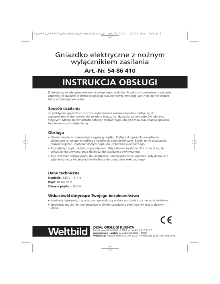 BA_0812_5486410_Steckdose_Fussschalter_P 10.04.2012 12:22 Uhr Seite 1 Gniazdko elektryczne z nożnym wyłącznikiem zasilania Art.-Nr. 54 86 410 INSTRUKCJA OBSŁUGI Dziękujemy, że zdecydowałeś się na zakup tego produktu. Przed uruchomieniem urządzenia zapoznaj się uważnie z instrukcją obsługi oraz zachowaj instrukcję, aby móc do niej zajrzeć także w późniejszym czasie. Sposób działania To praktyczne gniazdko z nożnym wyłącznikiem zasilania świetnie nadaje się do zastosowania w domowym biurze lub w biurze, np. do zasilania komputerów lub lamp stojących. Można bardzo prosto odłączyć dopływ prądu do gniazdka oraz włączyć gniazdo, bez konieczności schylania się. Obsługa • Otwórz najpierw opakowanie i wyjmij gniazdko. Podłącz do gniazdka urządzenie elektryczne a następnie podłącz gniazdko do sieci elektrycznej. Dzięki temu urządzeniu możesz włączać i wyłączać dopływ prądu do urządzenia elektrycznego. • Aby włączyć prąd, naciśnij stopą włącznik. Gdy zaświeci się dioda LED oznacza to, że gniazdko jest aktywne, prąd dochodzi do urządzenia elektrycznego. • Aby przerwać dopływ prądu do urządzenia, naciśnij ponownie włącznik. Gdy dioda LED zgaśnie oznacza to, że prąd nie dochodzi do urządzenia elektrycznego. Dane techniczne Napięcie: 230 V – 5- Hz Prąd: 10 A/230 V Zużycie prądu: < 0,5 W Wskazówki dotyczące Twojego bezpieczeństwa • Kontroluj regularnie, czy wtyczka i gniazdko są w dobrym stanie i czy nie są uszkodzone. • Sprawdzaj regularnie, czy gniazdko w Twoim urządzeniu elektrycznym jest w dobrym stanie. DZIAŁ OBSŁUGI KLIENTA E-mail: [email protected], Telefon: (+48) 22 517 50 17 poniedziałek - piątek w godzinach 8:00 – 18:00 Weltbild.pl Weltbild Polska Sp. z o. o., ul. Hankiewicza 2, 02-103 Warszawa