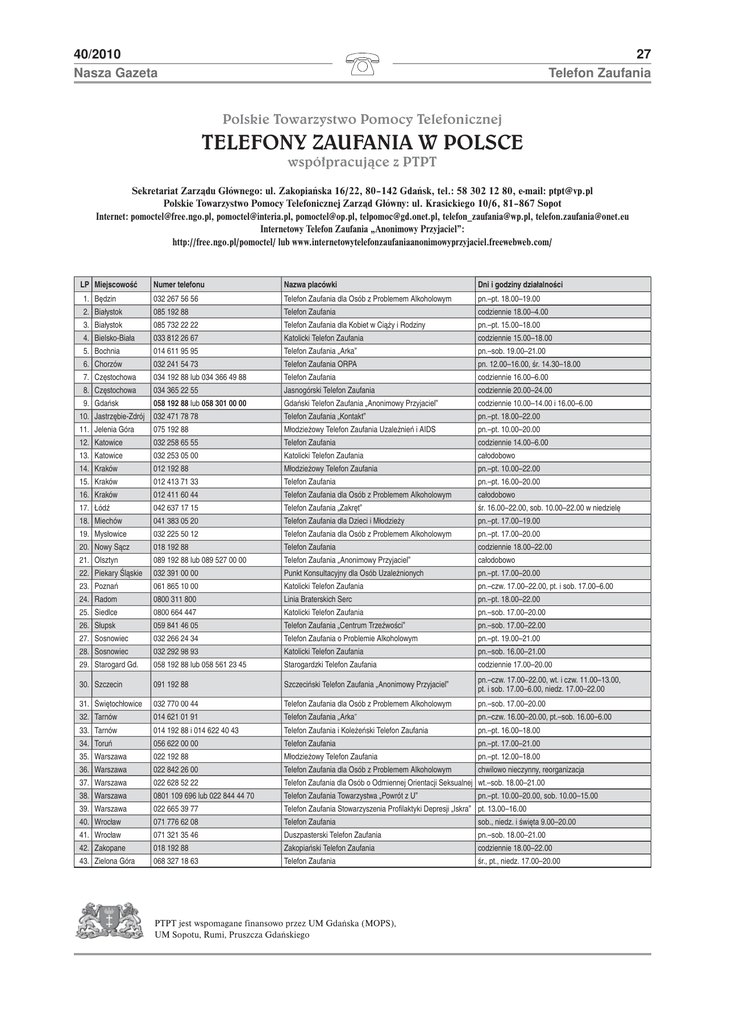 40/2010 Nasza Gazeta 27 Telefon Zaufania Polskie Towarzystwo Pomocy Telefonicznej TELEFONY ZAUFANIA W POLSCE wspóïpracujÈce z PTPT Sekretariat ZarzĂdu Gğównego: ul. Zakopiaġska 16/22, 80–142 Gdaġsk, tel.: 58 302 12 80, e-mail: [email protected] Polskie Towarzystwo Pomocy Telefonicznej ZarzĂd Gğówny: ul. Krasickiego 10/6, 81–867 Sopot Internet: [email protected], [email protected], [email protected], [email protected], [email protected], [email protected] Internetowy Telefon Zaufania „Anonimowy Przyjaciel”: http://free.ngo.pl/pomoctel/ lub www.internetowytelefonzaufaniaanonimowyprzyjaciel.freewebweb.com/ LP MiejscowoıĄ Numer telefonu Nazwa placówki Dni i godziny dziağalnoıci 1. BĎdzin 032 267 56 56 Telefon Zaufania dla Osób z Problemem Alkoholowym pn.–pt. 18.00–19.00 2. Biağystok 085 192 88 Telefon Zaufania codziennie 18.00–4.00 3. Biağystok 085 732 22 22 Telefon Zaufania dla Kobiet w CiĂŃy i Rodziny pn.–pt. 15.00–18.00 4. Bielsko-Biağa 033 812 26 67 Katolicki Telefon Zaufania codziennie 15.00–18.00 5. Bochnia 014 611 95 95 Telefon Zaufania „Arka” pn.–sob. 19.00–21.00 6. Chorzów 032 241 54 73 Telefon Zaufania ORPA pn. 12.00–16.00, ır. 14.30–18.00 7. CzĎstochowa 034 192 88 lub 034 366 49 88 Telefon Zaufania codziennie 16.00–6.00 8. CzĎstochowa 034 365 22 55 Jasnogórski Telefon Zaufania codziennie 20.00–24.00 9. Gdaġsk 058 192 88 lub 058 301 00 00 Gdaġski Telefon Zaufania „Anonimowy Przyjaciel” codziennie 10.00–14.00 i 16.00–6.00 10. JastrzĎbie-Zdrój 032 471 78 78 Telefon Zaufania „Kontakt” pn.–pt. 18.00–22.00 11. Jelenia Góra 075 192 88 MğodzieŃowy Telefon Zaufania UzaleŃnieġ i AIDS pn.–pt. 10.00–20.00 12. Katowice 032 258 65 55 Telefon Zaufania codziennie 14.00–6.00 13. Katowice 032 253 05 00 Katolicki Telefon Zaufania cağodobowo 14. Kraków 012 192 88 MğodzieŃowy Telefon Zaufania pn.–pt. 10.00–22.00 15. Kraków 012 413 71 33 Telefon Zaufania pn.–pt. 16.00–20.00 16. Kraków 012 411 60 44 Telefon Zaufania dla Osób z Problemem Alkoholowym cağodobowo 17. ĞódŁ 042 637 17 15 Telefon Zaufania „ZakrĎt” ır. 16.00–22.00, sob. 10.00–22.00 w niedzielĎ 18. Miechów 041 383 05 20 Telefon Zaufania dla Dzieci i MğodzieŃy pn.–pt. 17.00–19.00 19. Mysğowice 032 225 50 12 Telefon Zaufania dla Osób z Problemem Alkoholowym pn.–pt. 17.00–20.00 20. Nowy SĂcz 018 192 88 Telefon Zaufania codziennie 18.00–22.00 21. Olsztyn 089 192 88 lub 089 527 00 00 Telefon Zaufania „Anonimowy Przyjaciel” cağodobowo 22. Piekary İlĂskie 032 391 00 00 Punkt Konsultacyjny dla Osób UzaleŃnionych pn.–pt. 17.00–20.00 23. Poznaġ 061 865 10 00 Katolicki Telefon Zaufania pn.–czw. 17.00–22.00, pt. i sob. 17.00–6.00 24. Radom 0800 311 800 Linia Braterskich Serc pn.–pt. 18.00–22.00 25. Siedlce 0800 664 447 Katolicki Telefon Zaufania pn.–sob. 17.00–20.00 26. Sğupsk 059 841 46 05 Telefon Zaufania „Centrum TrzeŁwoıci” pn.–sob. 17.00–22.00 27. Sosnowiec 032 266 24 34 Telefon Zaufania o Problemie Alkoholowym pn.–pt. 19.00–21.00 28. Sosnowiec 032 292 98 93 Katolicki Telefon Zaufania pn.–sob. 16.00–21.00 29. Starogard Gd. 058 192 88 lub 058 561 23 45 Starogardzki Telefon Zaufania codziennie 17.00–20.00 30. Szczecin 091 192 88 Szczeciġski Telefon Zaufania „Anonimowy Przyjaciel” pn.–czw. 17.00–22.00, wt. i czw. 11.00–13.00, pt. i sob. 17.00–6.00, niedz. 17.00–22.00 31. İwiĎtochğowice 032 770 00 44 Telefon Zaufania dla Osób z Problemem Alkoholowym pn.–sob. 17.00–20.00 32. Tarnów 014 621 01 91 Telefon Zaufania „Arka” pn.–czw. 16.00–20.00, pt.–sob. 16.00–6.00 33. Tarnów 014 192 88 i 014 622 40 43 Telefon Zaufania i KoleŃeġski Telefon Zaufania pn.–pt. 16.00–18.00 34. Toruġ 056 622 00 00 Telefon Zaufania pn.–pt. 17.00–21.00 35. Warszawa 022 192 88 MğodzieŃowy Telefon Zaufania pn.–pt. 12.00–18.00 36. Warszawa 022 842 26 00 Telefon Zaufania dla Osób z Problemem Alkoholowym chwilowo nieczynny, reorganizacja 37. Warszawa 022 628 52 22 Telefon Zaufania dla Osób o Odmiennej Orientacji Seksualnej wt.–sob. 18.00–21.00 38. Warszawa 0801 109 696 lub 022 844 44 70 Telefon Zaufania Towarzystwa „Powrót z U” 39. Warszawa 022 665 39 77 Telefon Zaufania Stowarzyszenia Profilaktyki Depresji „Iskra” pt. 13.00–16.00 40. Wrocğaw 071 776 62 08 Telefon Zaufania sob., niedz. i ıwiĎta 9.00–20.00 41. Wrocğaw 071 321 35 46 Duszpasterski Telefon Zaufania pn.–sob. 18.00–21.00 42. Zakopane 018 192 88 Zakopiaġski Telefon Zaufania codziennie 18.00–22.00 43. Zielona Góra 068 327 18 63 Telefon Zaufania ır., pt., niedz. 17.00–20.00 PTPT jest wspomagane finansowo przez UM Gdaġska (MOPS), UM Sopotu, Rumi, Pruszcza Gdaġskiego pn.–pt. 10.00–20.00, sob. 10.00–15.00