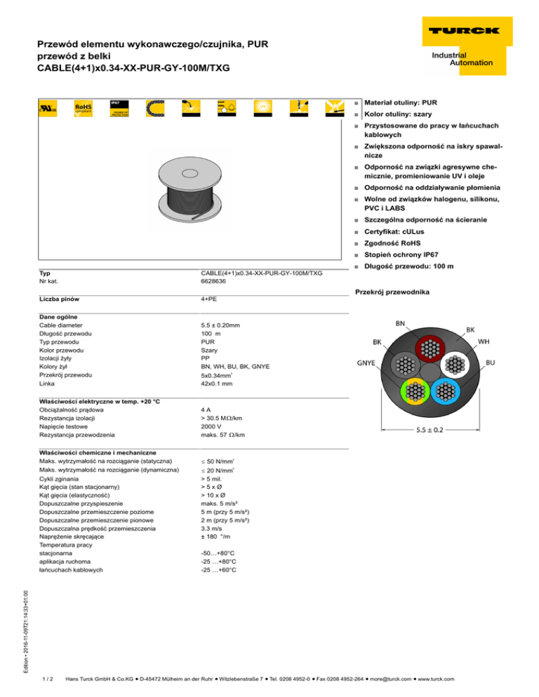 Przewód elementu wykonawczego/czujnika, PUR przewód z belki CABLE(4+1)x0.34-XX-PUR-GY-100M/TXG ■ Materiał otuliny: PUR ■ Kolor otuliny: szary ■ Przystosowane do pracy w łańcuchach kablowych ■ Zwiększona odporność na iskry spawalnicze ■ Odporność na związki agresywne chemicznie, promieniowanie UV i oleje ■ Odporność na oddziaływanie płomienia ■ Wolne od związków halogenu, silikonu, PVC i LABS ■ Szczególna odporność na ścieranie ■ Certyfikat: cULus ■ Zgodność RoHS ■ Stopień ochrony IP67 Typ Nr kat. CABLE(4+1)x0.34-XX-PUR-GY-100M/TXG 6628636 Liczba pinów 4+PE Dane ogólne Cable diameter Długość przewodu Typ przewodu Kolor przewodu Izolacji żyły Kolory żył Przekrój przewodu 5.5 ± 0.20mm 100 m PUR Szary PP BN, WH, BU, BK, GNYE Przekrój przewodnika Linka 5x0.34mm 42x0.1 mm Właściwości elektryczne w temp. +20 °C Obciążalność prądowa Rezystancja izolacji Napięcie testowe Rezystancja przewodzenia 4A > 30.5 Mò/km 2000 V maks. 57 ò/km Właściwości chemiczne i mechaniczne Maks. wytrzymałość na rozciąganie (statyczna) ð 50 N/mm Maks. wytrzymałość na rozciąganie (dynamiczna) 2 2 ð 20 N/mm > 5 mil. >5xØ > 10 x Ø maks. 5 m/s² 5 m (przy 5 m/s²) 2 m (przy 5 m/s²) 3.3 m/s ± 180 °/m 2 -50…+80°C -25 …+80°C -25 …+60°C Edition • 2016-11-09T21:14:33+01:00 Cykli zginania Kąt gięcia (stan stacjonarny) Kąt gięcia (elastyczność) Dopuszczalne przyspieszenie Dopuszczalne przemieszczenie poziome Dopuszczalne przemieszczenie pionowe Dopuszczalna prędkość przemieszczenia Naprężenie skręcające Temperatura pracy stacjonarna aplikacja ruchoma łańcuchach kablowych ■ Długość przewodu: 100 m 1/2 Hans Turck GmbH & Co.KG ñ D-45472 Mülheim an der Ruhr ñ Witzlebenstraße 7 ñ Tel. 0208 4952-0 ñ Fax 0208 4952-264 ñ [email protected] ñ www.turck.com Przewód elementu wykonawczego/czujnika, PUR przewód z belki CABLE(4+1)x0.34-XX-PUR-GY-100M/TXG Akcesoria montażowe Typ Nr kat. Torque-Wrench-Set-AS 6936170 Rysunek wymiarowy Zestaw kluczy dynamometrycznych; uchwyty z regulowanym momentem dokręcającym 0,4–1,0 Nm, klucz dynamometryczny do złączy M8 (SW9), klucz czołowy do złączy M12 (SW 14) BLANK-LABEL-FORCORDSETS-TEL-TXL 6936206 Etykieta do przewodów TEL i TXL, długość: 18 mm, wysokość: 4 mm, materiał: poliwęglan (PC), kolor: biały, bez związków halogenu, odporność na rozprzestrzenianie się płomie- Edition • 2016-11-09T21:14:33+01:00 nia 2/2 Hans Turck GmbH & Co.KG ñ D-45472 Mülheim an der Ruhr ñ Witzlebenstraße 7 ñ Tel. 0208 4952-0 ñ Fax 0208 4952-264 ñ [email protected] ñ www.turck.com