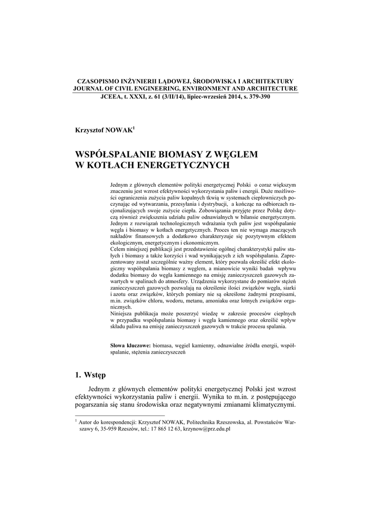 CZASOPISMO INŻYNIERII LĄDOWEJ, ŚRODOWISKA I ARCHITEKTURY JOURNAL OF CIVIL ENGINEERING, ENVIRONMENT AND ARCHITECTURE JCEEA, t. XXXI, z. 61 (3/II/14), lipiec-wrzesień 2014, s. 379-390 Krzysztof NOWAK1 WSPÓŁSPALANIE BIOMASY Z WĘGLEM W KOTŁACH ENERGETYCZNYCH Jednym z głównych elementów polityki energetycznej Polski o coraz większym znaczeniu jest wzrost efektywności wykorzystania paliw i energii. Duże możliwości ograniczenia zużycia paliw kopalnych tkwią w systemach ciepłowniczych poczynając od wytwarzania, przesyłania i dystrybucji, a kończąc na odbiorcach racjonalizujących swoje zużycie ciepła. Zobowiązania przyjęte przez Polskę dotyczą również zwiększenia udziału paliw odnawialnych w bilansie energetycznym. Jednym z rozwiązań technologicznych wdrażania tych paliw jest współspalanie węgla i biomasy w kotłach energetycznych. Proces ten nie wymaga znaczących nakładów finansowych a dodatkowo charakteryzuje się pozytywnym efektem ekologicznym, energetycznym i ekonomicznym. Celem niniejszej publikacji jest przedstawienie ogólnej charakterystyki paliw stałych i biomasy a także korzyści i wad wynikających z ich współspalania. Zaprezentowany został szczególnie ważny element, który pozwala określić efekt ekologiczny współspalania biomasy z węglem, a mianowicie wyniki badań wpływu dodatku biomasy do węgla kamiennego na emisję zanieczyszczeń gazowych zawartych w spalinach do atmosfery. Urządzenia wykorzystane do pomiarów stężeń zanieczyszczeń gazowych pozwalają na określenie ilości związków węgla, siarki i azotu oraz związków, których pomiary nie są określone żadnymi przepisami, m.in. związków chloru, wodoru, metanu, amoniaku oraz lotnych związków organicznych. Niniejsza publikacja może poszerzyć wiedzę w zakresie procesów cieplnych w przypadku współspalania biomasy i węgla kamiennego oraz określić wpływ składu paliwa na emisję zanieczyszczeń gazowych w trakcie procesu spalania. Słowa kluczowe: biomasa, węgiel kamienny, odnawialne źródła energii, współspalanie, stężenia zanieczyszczeń 1. Wstęp Jednym z głównych elementów polityki energetycznej Polski jest wzrost efektywności wykorzystania paliw i energii. Wynika to m.in. z postępującego pogarszania się stanu środowiska oraz negatywnymi zmianami klimatycznymi. 1 Autor do korespondencji: Krzysztof NOWAK, Politechnika Rzeszowska, al. Powstańców Warszawy 6, 35-959 Rzeszów, tel.: 17 865 12 63, [email protected] 380 K. Nowak W systemach ciepłowniczych, począwszy od wytwarzania przesyłania i dystrybucji a kończąc na odbiorcach racjonalizujących swoje zużycie ciepła, tkwią duże możliwości ograniczające zużycie paliw kopalnych. Zobowiązania przyjęte przez Polskę (m.in. pakiet energetyczno-klimatyczny „3x20”) dotyczą również zwiększenia udziału paliw odnawialnych w bilansie energetycznym. Efekty poprawy jakości powietrza będą wynikać z wykorzystania tych paliw, które w konsekwencji spowodują zmniejszenie emisji szkodliwych substancji do atmosfery powstających w wyniku spalania tradycyjnych nośników energii [8]. Jednym z rozwiązań technologicznych wykorzystywania tych paliw w procesie produkcji energii jest współspalanie węgla i biomasy w kotłach energetycznych. Zwiększenie udziału energii odnawialnej w strukturze paliwowej, m.in. poprzez współspalanie, powoduje przede wszystkim obniżenie emisji gazów cieplarnianych. Zastosowanie biomasy w procesie współspalania charakteryzuje się również niskimi kosztami inwestycyjnymi przystosowania istniejących kotłów (np. w przypadku kotłów WR), ma duże znaczenie dla zwiększenia bezpieczeństwa dostaw energii i wspierania rozwoju technologicznego. Współspalanie paliw konwencjonalnych i biomasy ma również ogromne znaczenie w wymiarze społecznym, wpływa na wzrost zatrudnienia i rozwój regionalny. Zgodnie z Dyrektywą Unijną nr 2009/28/WE [1] udział energii odnawialnej w całkowitym zużyciu energii do 2020 roku, powinien kształtować się na poziomie 20%. Osiągnięcie takich wskaźników możliwe będzie dzięki wykorzystaniu odnawialnych źródeł energii (m.in. poprzez współspalanie) w procesach produkcji energii. 2. Charakterystyka węgla kamiennego i biomasy Pod pojęciem węgla rozumie się paliwa stałe pochodzenia naturalnego lub otrzymane sztucznie, wykorzystywane m.in. jako źródło energii cieplnej do celów przemysłowych, technicznych, gospodarczych, itp. W zależności od zawartości pierwiastka węgla w swoim składzie, paliwa stałe można podzielić na 6 podstawowych grup: drewno, torf, węgiel brunatny, węgiel kamienny, antracyt, grafit. Popularnym paliwem stałym jest węgiel kamienny. Charakteryzuje się wysokim stopniem uwęglenia, a zatem wysoką zawartością pierwiastka węgla, niską zawartością wodoru, tlenu i wilgoci. Jego wartość opałowa waha się w granicach od 16,7 do około 30MJ/kg. Według raportu Państwowego Instytutu Geologicznego w Polsce zalega około 48 mln ton udokumentowanych geolo- Współspalanie biomasy z węglem w kotłach energetycznych 381 gicznych zasobów węgla kamiennego [2] Różne źródła szacują krajowe zasoby na 25 do 45 lat. Jest on popularnym paliwem w elektrowniach, elektrociepłowniach, hutach i fabrykach, ale jest również na szeroką skalę wykorzystywany jako paliwo do ogrzewania gospodarstw domowych. Mimo iż, węgiel kamienny jest jednym z najtańszych paliw energetycznych to podczas jego spalania do atmosfery emitowanych jest wiele szkodliwych substancji, m.in. tlenek siarki, tlenek azotu oraz ditlenek węgla powodujący efekt cieplarniany. Biomasa to najstarsze i najszerzej współcześnie wykorzystywane odnawialne źródło energii. Stanowi trzecie co do wielkości na świecie naturalne źródło energii. Biomasa to cała istniejąca na Ziemi materia organiczna, wszystkie substancje pochodzenia roślinnego lub zwierzęcego ulegające biodegradacji. Definicja t