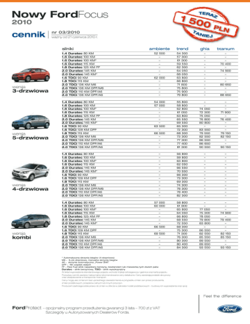 Nowy FordFocus 2010 cennik wa˝ny od 21 czerwca 2010 r. silniki wersja 3-drzwiowa wersja 5-drzwiowa wersja 4-drzwiowa wersja kombi TA nr 03/2010 N IE J ambiente trend ghia titanium 1.4 Duratec 80 KM 1.6 Duratec 100 KM 1.6 Duratec 100 KM* 1.6 Duratec 115 KM 1.8 Duratec 125 KM FF 2.0 Duratec 145 KM 2.0 Duratec 145 KM* 1.6 TDCi 90 KM 1.8 TDCi 115 KM 2.0 TDCi 136 KM M6 2.0 TDCi 136 KM DPF/M6 2.0 TDCi 110 KM DPF/A6 2.0 TDCi 136 KM DPF/A6 52 500 – – – – – – 62 000 – – – – – 54 300 57 300 61 300 59 550 62 300 64 050 68 050 63 800 66 800 71 800 75 800 75 900 79 800 – – – – – – – – – – – – – – – – 70 400 – 74 900 – – – 80 650 – – 88 650 1.4 Duratec 80 KM 1.6 Duratec 100 KM 1.6 Duratec 100 KM* 1.6 Duratec 115 KM 1.8 Duratec 125 KM FF 2.0 Duratec 145 KM 2.0 Duratec 145 KM* 1.6 TDCi 90 KM 1.6 TDCi 109 KM DPF 1.8 TDCi 115 KM 2.0 TDCi 136 KM M6 2.0 TDCi 136 KM DPF/M6 2.0 TDCi 110 KM DPF/A6 2.0 TDCi 136 KM DPF/A6 54 000 57 000 – – – – – 63 500 – 66 500 – – – – 55 800 58 800 62 800 61 050 63 800 65 550 69 550 65 300 72 300 68 300 73 300 77 300 77 400 81 300 – – 74 050 72 300 75 050 76 800 80 800 – 83 550 79 550 82 550 86 550 86 650 90 550 – – – 71 900 – 76 400 – – – 79 150 82 150 – – 90 150 1.4 Duratec 80 KM 1.6 Duratec 100 KM 1.6 Duratec 100 KM* 1.6 Duratec 115 KM 2.0 Duratec 145 KM 2.0 Duratec 145 KM* 1.6 TDCi 90 KM 1.6 TDCi 109 KM DPF 1.8 TDCi 115 KM 2.0 TDCi 136 KM M6 2.0 TDCi 136 KM DPF/M6 2.0 TDCi 110 KM DPF/A6 2.0 TDCi 136 KM DPF/A6 – – – – – – – – – – – – – – – – – – – – – – – – – – – – – – – – – – – – – – – 1.4 Duratec 80 KM 1.6 Duratec 100 KM 1.6 Duratec 100 KM* 1.6 Duratec 115 KM 1.8 Duratec 125 KM FF 2.0 Duratec 145 KM 2.0 Duratec 145 KM* 1.6 TDCi 90 KM 1.6 TDCi 109 KM DPF 1.8 TDCi 115 KM 2.0 TDCi 136 KM M6 2.0 TDCi 136 KM DPF/M6 2.0 TDCi 110 KM DPF/A6 2.0 TDCi 136 KM DPF/A6 57 000 60 000 – – – – – 66 500 – 69 500 – – – – – – 77 050 75 300 78 050 79 800 83 800 – 86 550 82 550 85 550 89 550 89 650 93 550 – – – 74 900 – 79 400 – – – 82 150 85 150 – – 93 150 56 59 63 62 66 70 66 73 69 74 78 78 82 800 800 800 050 550 550 300 300 300 300 300 400 300 58 800 61 800 65 800 64 050 66 800 68 550 72 550 68 300 75 300 71 300 76 300 80 300 80 400 84 300 * Automatyczna skrzynia biegów (4-stopniowa) M6 – 6–cio stopniowa, manualna skrzynia biegów A6 – skrzynia automatyczna „Power Shift” DPF – filtr czàstek sta∏ych FF – Flexi Fuel silnik nap´dzany benzynà, bioetanolem lub mieszankà tych dwóch paliw Duratec - silnik benzynowy, TDCi - silnik wysokopr´˝ny W sk∏ad wyposa˝enia standardowego pojazdu wchodzi trójkàt ostrzegawczy i gaÊnica oraz karta pojazdu. Powy˝szy cennik zawiera maksymalne rekomendowane ceny detaliczne. Ceny zawierajà podatek akcyzowy oraz ubezpieczenie w transporcie i transport. Ceny mogà ulec zmianom bez uprzedniego zawiadomienia w przypadku zmian cen przez producenta, zmian podatkowych, przepisów celnych lub innych przyczyn. Producent zastrzega sobie prawo do zmian w ofercie w zakresie modeli podstawowych – budowy ich wyposa˝enia oraz opcji. FordProtect – opcjonalny program przed∏u˝enia gwarancji 3 lata – 700 z∏ z VAT Szczegó∏y u Autoryzowanych Dealerów Forda. Nowy FordFocus 2010 bezpieczeƒstwo wyposa˝enie iente amb s System ABS (z EBD) Elektroniczny uk∏ad ESP z uk∏adem przeciwpoÊlizgowym TCS + EBA Poduszki powietrzne czo∏owe kierowcy i pasa˝era Boczne poduszki powietrzne kierowcy i pasa˝era Boczne kurtyny powietrzne(15, 16, 17) Boczne kurtyny powietrzne i poduszki boczne Przednie Êwiat∏a przeciwmgielne(16) System reflektorów adaptacyjnych (dla wersji 3– ,5–drzwiowych i kombi, tylne Êwiat∏a w technologii LED) Lampy ksenonowe z samocz.reg.kàta ustawienia i spryskiwaczami i lampami przeciwmgielnymi (wersja 4–drzwiowa) Lampy ksenonowe z samocz. reg. kàta ustawienia i spryskiwaczami i lampami przeciwmgielnymi, tylne Êwiat∏a w technologii LED (wersje 3–,5–drzwi i kombi) System kontroli ciÊnienia w ogumieniu s s 1 100 – 2 600 800 – d tren s s s s 1 500 – 800 1 900 ghia s s s s 1 500 – s 1 900 ium titans s s s 1 500 – s 1 900 – 3 600 3 000 3 000 3 800 2 000 3 800 2 000 3 000 2 000 3 000 2 000 s s 4 500 2500(9) / 7000 800 600 s 1 000 s s s 2 500 s 600 – – s s s 2 500 s 600 s – 1 400 – s – s – s s s 1 400 2 900 900 – 2 200 – 1 300 500 1 000 1 100 2 100 – – 400 110 1 900 500 2 300 400 400 s 900 350 2 200 800 – s 550 s 2 100 – 6 200 s 110 1 900 – 2 300 400 400 2 900 900 350 2 200 s – s 550 700 2 100 2 000 6 200 s 110 1 900 500 2 300 400 – s s – 150 s s – 150 s s 2 950 – s s 2 150 – – 4 850(6) 4 450(5) – – – – komfort Wspomaganie kierownicy s Komputer pok∏adowy – Klimatyzacja(1, 14, 15, 16) 4 500 Klimatyzacja z automatycznà regulacjà temperatury(15, 16, 17) – Podgrzewana przednia szyba(15, 16) – Filtr przeciws∏oneczny przedniej szyby(15, 16, 17) – Elektrycznie sterowane szyby przednich drzwi s Elektrycznie sterowane szyby przednich dzwi – opuszczane i podnoszone jednym naciÊni´ciem przycisku(5) – Elektrycznie sterowane szyby przednich i tylnych drzwi – opuszczane i podnoszone (6) jednym naciÊnieciem przycisku i funkcjà ca∏kowitego otwierania i zamykania szyb – Lusterka boczne – sterowane elektrycznie s Lusterka boczne – sterowane i podgrzewane elektrycznie, obudowy w kolorze nadwozia z wbudowanymi bocznymi kierunkowskazami 200 Lusterka boczne – sterowane i podgrzewane elektrycznie, obudowy w kolorze (7) nadwozia, sk∏adane elektrycznie i z lampkami oÊwietlajacymi pod∏o˝e – Elektrycznie otwierane okno dachowe – (17) Podgrzewane przednie fotele 900 Fotel pasa˝era z r´cznà regulacjà wysokoÊci i regulacjà podparcia odcinka l´dêwiowego – Elektryczna regulacja fotela kierowcy w 6 kierunka