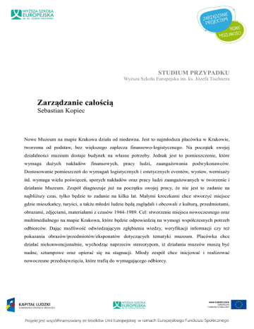 STUDIUM PRZYPADKU Wyższa Szkoła Europejska im. ks. Józefa Tischnera Zarządzanie całością Sebastian Kopiec Nowe Muzeum na mapie Krakowa działa od niedawna. Jest to najmłodsza placówka w Krakowie, tworzona od podstaw, bez większego zaplecza finansowo-logistycznego. Na początek swojej działalności muzeum dostaje budynek na własne potrzeby. Jednak jest to pomieszczenie, które wymaga dużych nakładów finansowych, pracy ludzi, zaangażowania podwykonawców. Dostosowanie pomieszczeń do wymagań logistycznych i estetycznych eventów, wystaw, wernisaży itd. wymaga wielu poświęceń, sporych nakładów oraz pracy ludzi zaangażowanych w tworzenie i działanie Muzeum. Zespół diagnozuje już na początku swojej pracy, że nie jest to zadanie na najbliższy czas, tylko będzie to zadanie na kilka lat. Małymi kroczkami chce stworzyć miejsce gdzie mieszkańcy, turyści, a także młodzi ludzie będą zaglądali i obcowali z kulturą, przedmiotami, obrazami, zdjęciami, materiałami z czasów 1944-1989. Cel: stworzenie miejsca nowoczesnego oraz multimedialnego na mapie Krakowa, które będzie odpowiedzią na wymogi współczesnych potrzeb odbiorców. Dając możliwość odwiedzającym zgłębienia wiedzy, weryfikacji informacji czy też pokazania obrazów/przedmiotów/eksponatów dotyczących tematyki muzeum. Placówka chce działać niekonwencjonalnie, wychodząc naprzeciw stereotypom, iż działania muzeów muszą być nudne, sztampowe oraz opierać się na stagnacji. Młody zespół chce inicjować i realizować nowoczesne przedsięwzięcia, które trafią do wymagającego odbiorcy. Muzeum tworzą młodzi ludzi z pasją, zaangażowaniem, pełni zapału do działań. Dla większości jest to pierwsza praca, która wpisuje się w ich zainteresowania oraz chcą zdobyć doświadczenie zawodowe w tym obszarze. Zespołem kieruje Pani Dyrektor, która swoim ciepłem i oddaniem w działania zjednuje sobie ludzi, którzy chętnie wspomagają inicjatywy Muzeum. Pani Dyrektor posiada bogate doświadczeniem zawodowe, charyzmę potrzebną na stanowisku, merytoryczną ekspercką wiedzę oraz oddanie zadaniom, w które się angażuje. Młodzi ludzie niewątpliwie mogą się uczyć oraz czerpać z doświadczenia swojego kierownika. Szczerze i z zapałem koncentruje się na zespole, aby przekazać im swoje dobre praktyki zdobyte na swojej ścieżce kariery. Zapał Pani Dyrektor przenosi się na grono osób, które bezinteresownie angażują się w powstawanie i działanie placówki. Czerpiąc z doświadczeń sukcesywnie wdraża swoje kontakty, które mają wspomóc rozwój placówki kulturalnej. W swojej działalności Muzeum koncentruje się na danych obszarach: Wystawy Edukacja Dla dzieci Multimedia Projekty Obszar 1: w swojej działalności Muzeum zrealizowało już 4 duże wystawy w przeciągu 3 lat. Każda z nich trwała średnio 5 miesięcy. W obecnej chwili trwa finalna faza przygotowań wystawy, która dotyczyć będzie sportowych dokonań Polaków – wernisaż zaplanowano na 11.05.br. Wystawa pokryje się z terminem Euro 2012, ma zatem przyciągnąć w tym czasie osoby zainteresowane piłką nożną do odwiedzenia Muzeum. Przy okazji większego zainteresowania tematyką sportową w czerwcu będzie także więcej turystów w Krakowie, w tym także kibiców. Czas wystawy jest bardzo dobrze przemyślany i dostosowany do realnych potrzeb grupy docelowej Jest to najświeższy projekt Zespołu, który osadzony w realnych potrzebach ma niewątpliwe atuty dobrze zaplanowanego przedsięwzięcia. Koncepcja wystawy jest bardzo dobrze zdefiniowana w kontekście analizy potrzeb, formułowania celów projektu oraz opracowaniu działań, które mają docelowo doprowadzić do zaplanowanych produktów i wskaźników przez Muzeum m.in.: Promocja działalności placówki; Wzrost liczby odwiedzających muzeum; Przybliżenie tematyki sportowej mieszańcom Krakowa i turystom. Obszar 2: Przedsięwzięcia skierowane do młodzieży, głównie gimnazjów i liceów Krakowa. Wydarzenia są planowane jako nowoczesne, multimedialne metody pracy z uczniami, w celu zainteresowania tematyką związaną z okresem PRL-u. Zespół Muzeum dokonuje wszelkich starań, aby projekty były jak najciekawsze, w tym celu korzysta z interaktywnych narzędzi m.in. gry symulacyjne, gry miejskie, które trafiają do młodego odbiorcy. Celem projektów jest upowszechnienie najnowszej historii Polski wśród młodzieży. Obszar 3: Muzeum organizuje sobotnie poranki, gdzie są czytane książeczki dla dzieci. Przybliżenie literatury, postaci, bajek z dzieciństwa PRL. Cel – przypomnienie zapomnianych kultowych postaci z bajek, przybliżenie ich młodszym pokoleniom, a starszym powrót do wspomnień z dzieciństwa. Obszar 4: multimedia są ważnym obszarem działań Muzeum. Poprzez innowacyjne działania i inicjatywy placówki projekty trafiają do coraz szerszego grona odbiorców. Odpowiadając na różnorodne potrzeby. Muzeum nie posiada stałej wystawy, która czynna jest przez cały rok. Wernisaże, projekty są działaniami czasowymi, które mają swój początek i koniec. Są także unikatowe, zatem posiadają główne cechy projektów. W ramach tego obszaru działalności Muzeum zrealizowało 3 główne projekty, które przyciągnęły bardzo dużą liczbę zainteresowanych. Obszar 5: projekty – od początku swojej działalności Muzeum zorientowane jest na realizację nowoczesnych, ciekawych projektów dot. tematyki swojej działalności. Poprzez nowatorskie przedsięwzięcia, chce docierać do jak najszerszego grona odbiorców, aby zaciekawić, przybliżyć obraz czy też przypomnieć wydarzenia w dziejach Polski. W swoim doświadczeniu ma już kilka z sukcesem zakończonych przedsięwzięć. Każde z nich spotkało się z bardzo dobrym odbiorem mieszkańców Krakowa i przejezdnych. Średnio w każdy projekt swoją tematyką trafiał do 1000 odbiorców. Zespół projektowy przygotowując nowe przedsięwzięcia przystępu