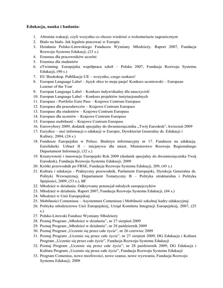 Edukacja, nauka i badania: 1. Altruista wakacji, czyli wszystko co chcesz wiedzieć o wolontariacie zagranicznym 2. Biało na biało. Jak legalnie pracować w Europie 3. Działania Polsko-Litewskiego Funduszu Wymiany Młodzieży. Raport 2007, Fundacja Rozwoju Systemu Edukacji, (23 s.) 4. Erasmus dla pracowników uczelni 5. Erasmus dla studentów 6. eTwinning. Europejska współpraca szkół – Polska 2007, Fundacja Rozwoju Systemu Edukacji, (90 s.) 7. EU Bookshop. Publikacje UE – wszystko, czego szukasz! 8. Europan Language Label – Język obce to moja pasja! Konkurs uczniowski – European Learner of the Year 9. Europan Language Label – Konkurs indywidualny dla nauczycieli 10. Europan Language Label – Konkurs projektów instytucjonalnych 11. Europass - Portfolio Euro Pass – Krajowe Centrum Europass 12. Europass dla pracodawców – Krajowe Centrum Europass 13. Europass dla studentów – Krajowe Centrum Europass 14. Europass dla uczniów – Krajowe Centrum Europass 15. Europass mobilność – Krajowe Centrum Europass 16. Eurowybory 2009, dodatek specjalny do dwumiesięcznika „Twój Eurodesk”, kwiecień 2009 17. Eurydice – sieć informacji o edukacji w Europie, Dyrektoriat Generalny ds. Edukacji i Kultury, 2004, (24 s.) 18. Fundusze Europejskie w Polsce. Biuletyn informacyjny nr 17. Fundusze na edukację. Euroliderki. Urbact II – inicjatywa dla miast, Ministerstwo Rozwoju Regionalnego Departament Informacji, (32 s.) 19. Kreatywność i innowacje Europejski Rok 2009 (dodatek specjalny do dwumiesięcznika Twój Eurodesk), Fundacja Rozwoju Systemu Edukacji, 2009 20. Krótki przewodnik po FRSE, Fundacja Rozwoju Systemu Edukacji, 209, (45 s.) 21. Kultura i edukacja - Praktyczny przewodnik, Parlament Europejski, Dyrekcja Generalna ds. Polityki Wewnętrznej, Departament Tematyczny B – Polityka strukturalna i Polityka Spójności, 2009, (53 s.), BF 22. Młodzież w działaniu. Odkrywamy potencjał młodych europejczyków 23. Młodzież w działaniu. Raport 2007, Fundacja Rozwoju Systemu Edukacji, (84 s.) 24. Młodzież w Unii Europejskiej 25. Mobilności Comeniusa – Asystentura Comeniusa i Mobilność szkolnej kadry edukacyjnej 26. Polityka młodzieżowa Unii Europejskiej, Urząd Komitetu Integracji Europejskiej, 2007, (25 s.) 27. Polsko-Litewski Fundusz Wymiany Młodzieży 28. Poznaj Program „Młodzież w działaniu”, nr 27 sierpień 2009 29. Poznaj Program „Młodzież w działaniu”, nr 28 październik 2009 30. Poznaj Program „Uczenie się przez całe życie”, nr 26 czerwiec 2009 31. Poznaj Program „Uczenie się przez całe życie”, nr 27 sierpień 2009, DG Edukacja i Kultura Program „Uczenie się przez całe życie”, Fundacja Rozwoju Systemu Edukacji 32. Poznaj Program „Uczenie się przez całe życie”, nr 28 październik 2009, DG Edukacja i Kultura Program „Uczenie się przez całe życie”, Fundacja Rozwoju Systemu Edukacji 33. Program Comenius, nowe możliwości, nowe szanse, nowe wyzwania, Fundacja Rozwoju Systemu Edukacji, 2008 34. 35. 36. 37. 38. 39. 40. 41. 42. 43. 44. 45. 46. 47. 48. 49. 50. 51. 52. 53. Program Comenius. Partnerskie Projekty Szkół, Fundacja Rozwoju Systemu Edukacji, 2008 Program Erasmus Program Grundtvig edukacja dorosłych – www.grundtvig.org.pl Program Młodzież w działaniu Projekty partnerskie LdV - program Leonardo da Vinci Projekty staży zagranicznych IVT/PLM - program Leonardo da Vinci Projekty wielostronne transfer innowacji - program Leonardo da Vinci Projekty wymiany doświadczeń VETPRO - program Leonardo da Vinci Przewodnik po programie „Młodzież w działaniu” 2007/2008, DG Edukacja i Kultura Program „Młodzież w działaniu”, Fundacja Rozwoju Systemu Edukacji Studiowanie to wyzwanie, czyli jak zdobyć indeks w Europie, Eurodesk Polska Fundacja Rozwoju Systemu Edukacji, (63 s.) Tak było! Staż Leonardo widzialny oczami uczestników, Fundacja Rozwoju Systemu Edukacji, 2009, (50 s.) Tempus 2007-2013 – Modernizacja Szkolnictwa Wyższego Twój eurodesk nr 26 czerwiec 2009, Fundacja Rozwoju Systemu Edukacji Twój eurodesk nr 27 sierpień 2009, Fundacja Rozwoju Systemu Edukacji Twój eurodesk nr 28 październik 2009, Fundacja Rozwoju Systemu Edukacji Unia Europejska. Transfer wiedzy i innowacji w warunkach lokalnych, Redakcja naukowa Z. Kruszewski i W. Kazimierz, Europe Direct, 2008, (202 s.) Wielkopolski Ośrodek Europejskiej Współpracy Młodzieży, Eurodesk Polska - Informacja młodzieżowa Wizyty studyjne dla kadry zarządzającej oraz specjalistów z zakresu kształcenia i doskonalenia zawodowego Zamieszkanie, praca i studia w innym państwie UE. Przegląd praw obywatela UE, Komisja Europejska, europa.eu.int/youreurope, Komisja Europejska Zarządzanie finansowe projektem. Poradnik dla beneficjentów. Projekty mobilności 20072010, Fundacja Rozwoju Systemu Edukacji, (45 s.) Wydawnictwa w języku angielskim: 1. Art & Science. Creative Fusion, European Commission, European Communities, 2008, (30 pp.) 2. ERA-NET Networking the European Reasearch Area – Coordination of National and Regional Research Programmes – Seventh Framework Programme, (16 pp.) 3. EU Cooperation with US, Canada, Australia, Japan and New Zealand in Higher Education and Training – Good Practices (2008), (26 pp.) 4. European Neighbourhood Policy : Research and higher education - Thriving on Knowledge, European Commission. External Relations, (8 pp.) 5. European Research Careers – a pocket guide – Marie Curie actions in brief, (48 pp.) 6. European training thesaurus, The thesaurus for vocational education and training (VET) in Europe, European Centre for the Development of Vocational Training 7. European Training Thesaurus. Thésaurus européen de la formation professionnelle - Cedefop (The European Centre for the Development of Vocational Training) – 2008, (469 pp.) 8. EU youth report, European Commission, Directorate-General for education and culture, European Communities, 2009, (107 pp.) 9. Fifty ways to motiva