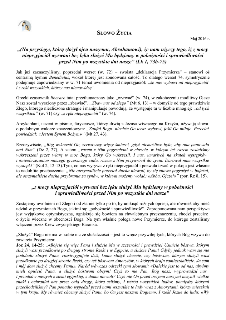 SŁOWO ŻYCIA Maj 2016 r. „(Na przysięgę, którą złożył ojcu naszemu, Abrahamowi), że nam użyczy tego, iż z mocy nieprzyjaciół wyrwani bez lęku służyć Mu będziemy w pobożności i sprawiedliwości przed Nim po wszystkie dni nasze” (Łk 1, 73b-75) Jak już zaznaczyliśmy, poprzedni werset (w. 72) – swoista „deklaracja Przymierza” – stanowi oś centralną hymnu Benedictus, wokół której jest zbudowana całość. To dlatego werset 74. symetrycznie podejmuje zapowiedziany w w. 71 temat uwolnienia od nieprzyjaciół: „że nas wybawi od nieprzyjaciół i z ręki wszystkich, którzy nas nienawidzą”. Grecki czasownik liberare tutaj przetłumaczony jako „wyrwać” (w. 74), w zakończeniu modlitwy Ojcze Nasz został wyrażony przez „zbawiać”. „Zbaw nas od złego” (Mt 6, 13) – w domyśle od tego prawdziwie Złego, którego niezliczone strategie i manipulacje powodują, że występuje tu w liczbie mnogiej: „od tych wszystkich” (w. 71) czy „z ręki nieprzyjaciół” (w. 74). Arcykapłani, uczeni w piśmie, faryzeusze, którzy drwią z Jezusa wiszącego na Krzyżu, używają słowa o podobnym walorze znaczeniowym: „Zaufał Bogu: niechże Go teraz wybawi, jeśli Go miłuje. Przecież powiedział: «Jestem Synem Bożym»” (Mt 27, 43). Rzeczywiście, „Bóg wskrzesił Go, zerwawszy więzy śmierci, gdyż niemożliwe było, aby ona panowała nad Nim” (Dz 2, 27), A zatem „razem z Nim pogrzebani w chrzcie, w którym też razem zostaliśmy wskrzeszeni przez wiarę w moc Boga, który Go wskrzesił. I nas, umarłych na skutek występków i «nieobrzezania» naszego grzesznego ciała, razem z Nim przywrócił do życia. Darował nam wszystkie występki” (Kol 2, 12-13).Tym, co nas wyrywa z ręki nieprzyjaciół i pozwala trwać w pokoju jest właśnie to nadobfite przebaczenie: „Nie otrzymaliście przecież ducha niewoli, by się znowu pogrążyć w bojaźni, ale otrzymaliście ducha przybrania za synów, w którym możemy wołać: «Abba, Ojcze!»” (por. Rz 8, 15). „z mocy nieprzyjaciół wyrwani bez lęku służyć Mu będziemy w pobożności i sprawiedliwości przed Nim po wszystkie dni nasze” Zostajemy uwolnieni od Złego i od zła nie tylko po to, by uniknąć różnych opresji, ale również aby mieć udział w przymiotach Boga, jakimi są: „pobożność i sprawiedliwość”. Zaproponowana nam perspektywa jest wyjątkowo optymistyczna, ogniskuje się bowiem na chwalebnym przeznaczeniu, chodzi przecież o życie wieczne w obecności Boga. Na tym właśnie polega nowe Przymierze, do którego zostaliśmy włączeni przez Krew zwycięskiego Baranka. „Służyć” Bogu nie ma w sobie nic ze służalczości – jest to wręcz przywilej tych, których Bóg wzywa do zawarcia Przymierza: Joz 24, 14-25: „«Bójcie się więc Pana i służcie Mu w szczerości i prawdzie! Usuńcie bóstwa, którym służyli wasi przodkowie po drugiej stronie Rzeki i w Egipcie, a służcie Panu! Gdyby jednak wam się nie podobało służyć Panu, rozstrzygnijcie dziś, komu służyć chcecie, czy bóstwom, którym służyli wasi przodkowie po drugiej stronie Rzeki, czy też bóstwom Amorytów, w których kraju zamieszkaliście. Ja sam i mój dom służyć chcemy Panu». Naród wówczas odrzekł tymi słowami: «Dalekie jest to od nas, abyśmy mieli opuścić Pana, a służyć bóstwom obcym! Czyż to nie Pan, Bóg nasz, wyprowadził nas i przodków naszych z ziemi egipskiej, z domu niewoli? Czyż nie On przed oczyma naszymi uczynił wielkie znaki i ochraniał nas przez całą drogę, którą szliśmy, i wśród wszystkich ludów, pomiędzy którymi przechodziliśmy? Pan ponadto wypędził przed nami wszystkie te ludy wraz z Amorytami, którzy mieszkali w tym kraju. My również chcemy służyć Panu, bo On jest naszym Bogiem». I rzekł Jozue do ludu: «Wy nie możecie służyć Panu, bo jest On Bogiem świętym i jest Bogiem zazdrosnym i nie przebaczy wam występków i grzechów. Jeśli opuścicie Pana, aby służyć bogom obcym, ześle na was znów nieszczęścia, a choć przedtem dobrze wam czynił, wtedy sprowadzi zagładę». Lecz lud odrzekł Jozuemu: «Nie! My chcemy służyć Panu!» Jozue odpowiedział ludowi: «Wy jesteście świadkami przeciw samym sobie, że wybraliście Pana, aby Mu służyć». I odpowiedzieli: «Jesteśmy świadkami». «Usuńcie więc bogów obcych spośród was i zwróćcie serca wasze ku Panu, Bogu Izraela». I odrzekł lud Jozuemu: «Panu, Bogu naszemu, chcemy służyć i głosu Jego chcemy słuchać». Zawarł więc Jozue w tym dniu przymierze z ludem i nadał mu ustawę i nakaz w Sychem”. Lud jest zaproszony do podjęcia z sercem ufnym i wdzięcznym tej relacji przyjaźni i służby, którą Bóg proponuje mu w imię Przymierza. Już na podstawie tekstów Starego Testamentu możemy się domyślać, że służba jest ostatecznie udziałem synów, jak dobitnie wskazuje Nasz Pan, Jezus Chrystus: Mt 20, 26-28: „Lecz kto by między wami chciał stać się wielkim, niech będzie waszym sługą. A kto by chciał być pierwszym między wami, niech będzie niewolnikiem waszym, na wzór Syna Człowieczego, który nie przyszedł, aby Mu służono, lecz aby służyć i dać swoje życie na okup za wielu”. J 13, 12-17: „Czy rozumiecie, co wam uczyniłem? Wy Mnie nazywacie «Nauczycielem» i «Panem» i dobrze mówicie, bo nim jestem. Jeżeli więc Ja, Pan i Nauczyciel, umyłem wam nogi, to i wyście powinni sobie nawzajem umywać nogi. Dałem wam bowiem przykład, abyście i wy tak czynili, jak Ja wam uczyniłem. Zaprawdę, zaprawdę, powiadam wam: Sługa nie jest większy od swego pana ani wysłannik od tego, który go posłał. Wiedząc to będziecie błogosławieni, gdy według tego będziecie postępować”. Wyrażenie „służyć Mu będziemy w pobożności i sprawiedliwości” jest przejęte z Księgi Mądrości: Mdr 9, 3: „Boże przodków i Panie miłosierdzia, któryś wszystko uczynił swoim słowem i w Mądr