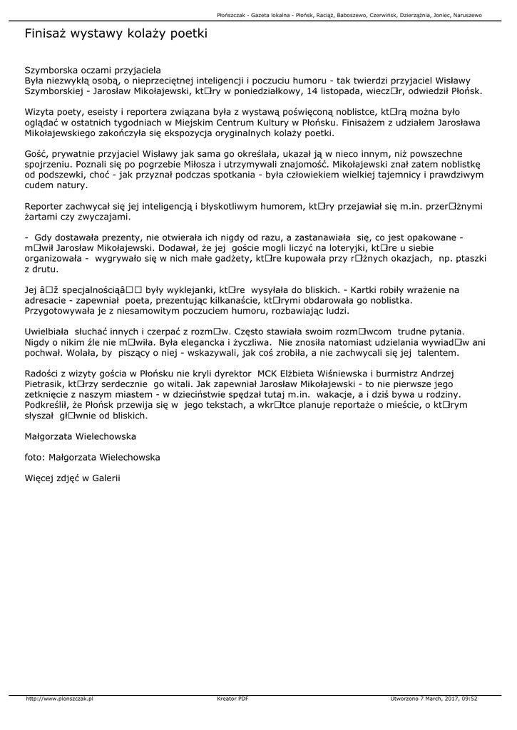 Płońszczak - Gazeta lokalna - Płońsk, Raciąż, Baboszewo, Czerwińsk, Dzierzążnia, Joniec, Naruszewo Finisaż wystawy kolaży poetki Szymborska oczami przyjaciela Była niezwykłą osobą, o nieprzeciętnej inteligencji i poczuciu humoru - tak twierdzi przyjaciel Wisławy Szymborskiej - Jarosław Mikołajewski, ktÃłry w poniedziałkowy, 14 listopada, wieczÃłr, odwiedził Płońsk. Wizyta poety, eseisty i reportera związana była z wystawą poświęconą noblistce, ktÃłrą można było oglądać w ostatnich tygodniach w Miejskim Centrum Kultury w Płońsku. Finisażem z udziałem Jarosława Mikołajewskiego zakończyła się ekspozycja oryginalnych kolaży poetki. Gość, prywatnie przyjaciel Wisławy jak sama go określała, ukazał ją w nieco innym, niż powszechne spojrzeniu. Poznali się po pogrzebie Miłosza i utrzymywali znajomość. Mikołajewski znał zatem noblistkę od podszewki, choć - jak przyznał podczas spotkania - była człowiekiem wielkiej tajemnicy i prawdziwym cudem natury. Reporter zachwycał się jej inteligencją i błyskotliwym humorem, ktÃłry przejawiał się m.in. przerÃłżnymi żartami czy zwyczajami. - Gdy dostawała prezenty, nie otwierała ich nigdy od razu, a zastanawiała się, co jest opakowane mÃłwił Jarosław Mikołajewski. Dodawał, że jej goście mogli liczyć na loteryjki, ktÃłre u siebie organizowała - wygrywało się w nich małe gadżety, ktÃłre kupowała przy rÃłżnych okazjach, np. ptaszki z drutu. Jej „specjalnościąâ€• były wyklejanki, ktÃłre wysyłała do bliskich. - Kartki robiły wrażenie na adresacie - zapewniał poeta, prezentując kilkanaście, ktÃłrymi obdarowała go noblistka. Przygotowywała je z niesamowitym poczuciem humoru, rozbawiając ludzi. Uwielbiała słuchać innych i czerpać z rozmÃłw. Często stawiała swoim rozmÃłwcom trudne pytania. Nigdy o nikim źle nie mÃłwiła. Była elegancka i życzliwa. Nie znosiła natomiast udzielania wywiadÃłw ani pochwał. Wolała, by piszący o niej - wskazywali, jak coś zrobiła, a nie zachwycali się jej talentem. Radości z wizyty gościa w Płońsku nie kryli dyrektor MCK Elżbieta Wiśniewska i burmistrz Andrzej Pietrasik, ktÃłrzy serdecznie go witali. Jak zapewniał Jarosław Mikołajewski - to nie pierwsze jego zetknięcie z naszym miastem - w dzieciństwie spędzał tutaj m.in. wakacje, a i dziś bywa u rodziny. Podkreślił, że Płońsk przewija się w jego tekstach, a wkrÃłtce planuje reportaże o mieście, o ktÃłrym słyszał głÃłwnie od bliskich. Małgorzata Wielechowska foto: Małgorzata Wielechowska Więcej zdjęć w Galerii http://www.plonszczak.pl Kreator PDF Utworzono 7 March, 2017, 09:52