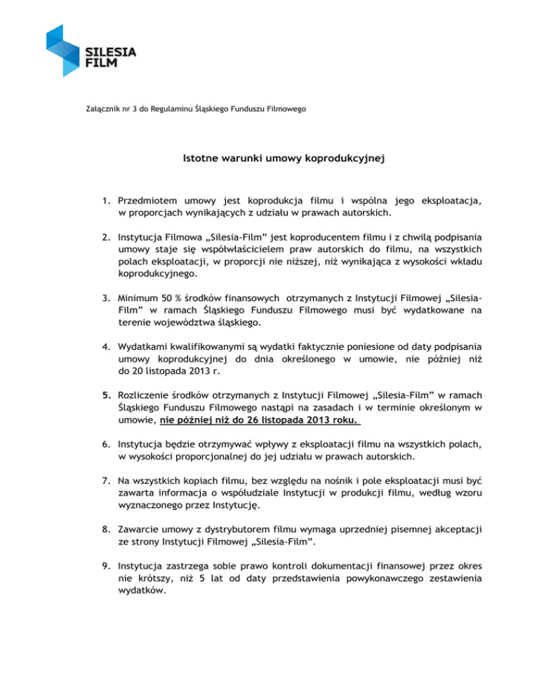 Załącznik nr 3 do Regulaminu Śląskiego Funduszu Filmowego Istotne warunki umowy koprodukcyjnej 1. Przedmiotem umowy jest koprodukcja filmu i wspólna jego eksploatacja, w proporcjach wynikających z udziału w prawach autorskich. 2. Instytucja Filmowa „Silesia-Film” jest koproducentem filmu i z chwilą podpisania umowy staje się współwłaścicielem praw autorskich do filmu, na wszystkich polach eksploatacji, w proporcji nie niższej, niż wynikająca z wysokości wkładu koprodukcyjnego. 3. Minimum 50 % środków finansowych otrzymanych z Instytucji Filmowej „SilesiaFilm” w ramach Śląskiego Funduszu Filmowego musi być wydatkowane na terenie województwa śląskiego. 4. Wydatkami kwalifikowanymi są wydatki faktycznie poniesione od daty podpisania umowy koprodukcyjnej do dnia określonego w umowie, nie później niż do 20 listopada 2013 r. 5. Rozliczenie środków otrzymanych z Instytucji Filmowej „Silesia-Film” w ramach Śląskiego Funduszu Filmowego nastąpi na zasadach i w terminie określonym w umowie, nie później niż do 26 listopada 2013 roku. 6. Instytucja będzie otrzymywać wpływy z eksploatacji filmu na wszystkich polach, w wysokości proporcjonalnej do jej udziału w prawach autorskich. 7. Na wszystkich kopiach filmu, bez względu na nośnik i pole eksploatacji musi być zawarta informacja o współudziale Instytucji w produkcji filmu, według wzoru wyznaczonego przez Instytucję. 8. Zawarcie umowy z dystrybutorem filmu wymaga uprzedniej pisemnej akceptacji ze strony Instytucji Filmowej „Silesia-Film”. 9. Instytucja zastrzega sobie prawo kontroli dokumentacji finansowej przez okres nie krótszy, niż 5 lat od daty przedstawienia powykonawczego zestawienia wydatków.