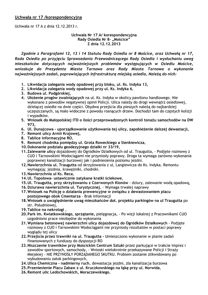 Uchwała nr 17 /korespondencyjna Uchwała nr 17 A z dnia 12.12.2013 r. Uchwała Nr 17 A/ korespondencyjna Rady Osiedla Nr 8- „Mościce” Z dnia 12.12.2013 Zgodnie z Paragrafami 12, 13 i 14 Statutu Rady Osiedla nr 8 Mościce, oraz Uchwałą nr 17, Rada Osiedla po przyjęciu Sprawozdania Przewodniczącego Rady Osiedla i wysłuchaniu uwag mieszkańców dotyczących najważniejszych problemów występujących w Osiedlu Mościce, wnioskuje do Prezydenta Miasta Tarnowa oraz Rady Miasta Tarnowa o wykonanie najważniejszych zadań, poprawiających infrastrukturę miejską osiedla, Należą do nich: 1. 2. 3. 4. Likwidacja zalegania wody opadowej przy bloku, ul. Ks. Indyka 13, Likwidacja zalegania wody opadowej przy ul. Ks. Indyka 6, Budowa ul. Podgórskiej, Ułożenie progów zwalniających na ul. Ks. Indyka w okolicy pawilonu handlowego. Nie wykonano z powodów negatywnej opinii Policji. Ulica należy do drogi wewnątrz osiedlowej, dzielącej osiedle na dwie części. Obydwa przejścia dla pieszych należą do najbardziej uczęszczanych, są mało widoczne z powodu rosnących drzew. Dochodzi tam do częstych kolizji i wypadków. 5. Wniosek do Małopolskiej ITD o ilości przeprowadzonych kontroli tonażu samochodów na DW 973, 6. Ul. Dunajcowa - uporządkowanie użytkowania tej ulicy, zapobieżenie dalszej dewastacji, 7. Remont ulicy Armii Krajowej, 8. Tablice informacyjne RO, 9. Remont chodnika pomiędzy ul. Grota Roweckiego a Sienkiewicza, 10. Dokonanie podziału geodezyjnego działki nr 33/19, 11. Zalewanie ulicy dojazdowej do Ogródków Działkowych od ul. Traugutta, - Podjęte rozmowy z CUO i Tarnowskimi Wodociągami nie przyniosły poprawy. Droga ta wymaga zarówno wykonania poprawnej kanalizacji burzowej jak i podniesienia poziomu jezdni. 12. Nawierzchnia ul. Traugutta od skrzyżowania z ul, Langiewicza do Ks. Indyka. Remontu wymagają: jezdnia, krawężniki, chodniki. 13. Nawierzchnia ul Ks. Reca, 14. Ul. Topolowa- ustawicznie zatykane kratki ściekowe, 15. Ul. Traugutta, przy skrzyżowaniu z Czerwonych Klonów - dziury, zalewanie wodą opadową, 16. Dziurawa nawierzchnia ul. Turystycznej, - Wymaga trwałej naprawy 17. Wniosek na Policję o działania prewencyjne w związku z dewastowaniem placu postojowego obok Cmentarza - Brak Informacji 18. Wniosek o uwzględnienie uwag mieszkańców dot. projektu parkingów na ul Traugutta po str. Południowej, 19. Tablice na nekrologi , 20. Park im. Kwiatkowskiego, sprzątanie, pielęgnacja, - Po wizji lokalnej z Pracownikami CUO uzgodniono prace niezbędne do wykonania 21. Wymiana betonowej nawierzchni ulicy dojazdowej do Ogródków Działkowych - Podjęte rozmowy z CUO i Tarnowskimi Wodociągami nie przyniosły rezultatów w postaci poprawy wyglądu tej ulicy 22. Przejścia przez trawniki na ul. Traugutta - Umieszczono wykonanie w planie zadań finansowanych z funduszy do dyspozycji RO 23. Niszczenie trawników przy Mościckim Centrum Sztuki przez parkujące w trakcie imprez i zawodów sportowych, samochody, - Wnioski wielokrotnie przekazywane Policji i Straży Miejskiej - NIE PRZYNOSŁY PORZĄDANEGO SKUTKU. Problem zostanie zlikwidowany po wybudowaniu zatok parkingowych, 24. Ulica Chemiczna - nadmierny ruch, dewastacja jezdni, zła kanalizacja burzowa 25. Przeniesienie Placu Zabaw z ul. Kruczkowskiego na łąkę przy ul. Norwida, 26. Remont ulic Ledóchowskich, Moraczewskiego, 27. Ustawienie barier przy krawężnikach, po północnej stronie ul. Akacjowej przed DH „Sezam” w celu zapobieżeniu dalszej dewastacji chodników i trawników, przez parkujące samochody. 28. Likwidacja, zdewastowanej przez TiR-y zatoki parkingowej przed sklepem „Biedronki” na ul. Czerwonych Klonów oraz ustawienie barier (od ul. Jarzębinowej do wjazdu na parking sklepu) zabezpieczających przed niewłaściwym przechodzeniem przez ulicę (pasy w pobliżu) 29. Wybudowanie parkingów po południowej (pomiędzy chodnikiem a stadionem lekkoatletycznym) i wschodniej stronie Stadionu Miejskiego (przed dworcem PKP i w zamian trawników). 30. Remont nawierzchni, dewastowanej przez nadmierny tonaż samochodów ciężarowych na skrzyżowaniu ul. Czerwonych Klonów z ul. Traugutta - Zbylitowska, 31. Wybudowanie zatoki parkingowej przed Pocztą na ul. Zbylitowskiej, 32. Dokonanie przeglądu i wymiana oznakowania pionowego i poziomego ulic Osiedla. Do najważniejszych, strategicznych zadań w Osiedlu Mościce należy skierowanie, przez UMT jako Organizatora Ruchu, ciężkiego taboru samochodowego poza Osiedlowe ulice, w tym wykluczenie przejazdu samochodów z ładunkiem niebezpiecznym. Jacek Rafiński Przewodniczący Rady Osiedla Nr 8