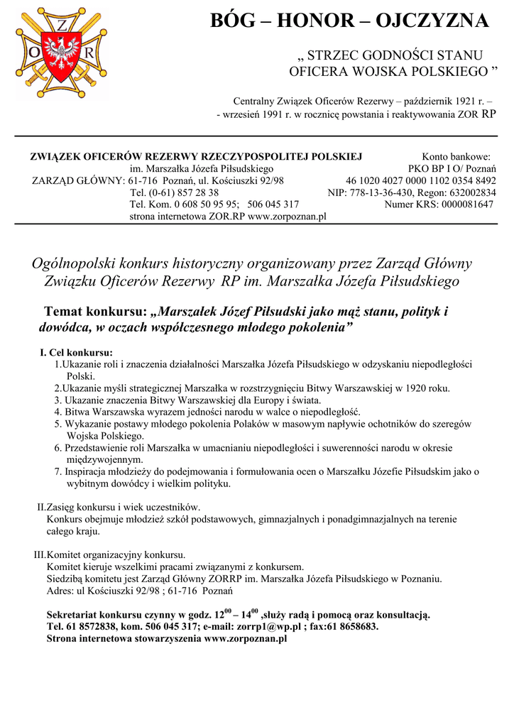 BÓG – HONOR – OJCZYZNA „ STRZEC GODNOŚCI STANU OFICERA WOJSKA POLSKIEGO ” Centralny Związek Oficerów Rezerwy – październik 1921 r. – - wrzesień 1991 r. w rocznicę powstania i reaktywowania ZOR RP ZWIĄZEK OFICERÓW REZERWY RZECZYPOSPOLITEJ POLSKIEJ Konto bankowe: im. Marszałka Józefa Piłsudskiego PKO BP I O/ Poznań ZARZĄD GŁÓWNY: 61-716 Poznań, ul. Kościuszki 92/98 46 1020 4027 0000 1102 0354 8492 Tel. (0-61) 857 28 38 NIP: 778-13-36-430, Regon: 632002834 Tel. Kom. 0 608 50 95 95; 506 045 317 Numer KRS: 0000081647 strona internetowa ZOR.RP www.zorpoznan.pl Ogólnopolski konkurs historyczny organizowany przez Zarząd Główny Związku Oficerów Rezerwy RP im. Marszałka Józefa Piłsudskiego Temat konkursu: „Marszałek Józef Piłsudski jako mąŜ stanu, polityk i dowódca, w oczach współczesnego młodego pokolenia” I. Cel konkursu: 1.Ukazanie roli i znaczenia działalności Marszałka Józefa Piłsudskiego w odzyskaniu niepodległości Polski. 2.Ukazanie myśli strategicznej Marszałka w rozstrzygnięciu Bitwy Warszawskiej w 1920 roku. 3. Ukazanie znaczenia Bitwy Warszawskiej dla Europy i świata. 4. Bitwa Warszawska wyrazem jedności narodu w walce o niepodległość. 5. Wykazanie postawy młodego pokolenia Polaków w masowym napływie ochotników do szeregów Wojska Polskiego. 6. Przedstawienie roli Marszałka w umacnianiu niepodległości i suwerenności narodu w okresie międzywojennym. 7. Inspiracja młodzieŜy do podejmowania i formułowania ocen o Marszałku Józefie Piłsudskim jako o wybitnym dowódcy i wielkim polityku. II.Zasięg konkursu i wiek uczestników. Konkurs obejmuje młodzieŜ szkół podstawowych, gimnazjalnych i ponadgimnazjalnych na terenie całego kraju. III.Komitet organizacyjny konkursu. Komitet kieruje wszelkimi pracami związanymi z konkursem. Siedzibą komitetu jest Zarząd Główny ZORRP im. Marszałka Józefa Piłsudskiego w Poznaniu. Adres: ul Kościuszki 92/98 ; 61-716 Poznań Sekretariat konkursu czynny w godz. 1200 – 1400 ,słuŜy radą i pomocą oraz konsultacją. Tel. 61 8572838, kom. 506 045 317; e-mail: [email protected] ; fax:61 8658683. Strona internetowa stowarzyszenia www.zorpoznan.pl 2 Konkurs przebiegać będzie w dwóch etapach: Pierwszy etap- w terminie do 15.06.2012r. w okręgach Związku Oficerów Rezerwy RP Na szczeblu okręgów Związku Oficerów Rezerwy RP, które obejmują województwa: 1. Szkoły z województwa pomorskiego, kujawsko-pomorskiego, warmińsko-mazurskiego zgłaszają uczestnictwo w 85-915 Bydgoszcz, ul. Powstańców Warszawy nr 2. Jednostka Wojskowa 1189; Roman Misiak. 2.Szkoły z województwa mazowieckiego, podlaskiego oraz miasta Stołecznego Warszawy zgłaszają uczestnictwo w Urzędzie Miasta i Gminy Zakroczym Kierownik Referatu ds. Oświaty, Kultury i Sportu Pan Kazimierz Szczerbatko ul. Warszawska 7 05-170 Zakroczym. 3.Szkoły z województwa dolnośląskiego, Kuratorium Oświaty Plac Powstańców Warszawy 1 50-951 Wrocław Departament Edukacji Patriotycznej starszy wizytator mgr Antonina Kuzaj 4.Szkoły z województwa opolskiego, Opolskie Kuratorium Oświaty ul. Piastowska 14 starszy wizytator mgr Janusz Olechnowicz 5.Szkoły z województwa śląskiego zgłaszają uczestnictwo Śląskie Kuratorium Oświaty ul. Jagiellońska 25,40-032 Katowice starszy wizytator mjr mgr Wacław Wójcik 6.Szkoły z województw małopolskiego, podkarpackiego, lubelskiego, świętokrzyskiego zgłaszają uczestnictwo w 37-450 Stalowa Wola, ul. Czarnieckiego 14/47.Andrzej Półchłopek 7.Szkoły z województw lubuskiego, zachodniopomorskiego zgłaszają uczestnictwo w 65-770 Zielona Góra, ul. Kręta 5 „LEXPAS” Sp. z o.o. Jacek Wieczorkowski. 8.Szkoły z województwa wielkopolskiego zgłaszają uczestnictwo w 61-716 Poznań, ul. Kościuszki i 92/98. Mieczysław Chęciński 9.Szkoły z województwa łódzkiego zgłaszają uczestnictwo w 99-300 Kutno, ul. Olimpijska 8/27 Jańczak Józef. Prezesi Okręgów ZOR RP informują kuratorów oświaty oraz szkoły współpracujące z Zarządem Okręgu o regulaminie konkursu. Ponadto informuje się zainteresowanych, Ŝe Zarząd Główny Związku zwróci się do Ministra Obrony Narodowej i Ministra, Edukacji Narodowej z prośbą o umieszczenie informacji o konkursie na stronach internetowych wymienionych ministerstw. Informacja o konkursie jest dostępna na stronie internetowej www.zorpoznan.pl Szkoły dokonują zgłoszeń o uczestnictwie w konkursie do okręgów Związku do dnia 12.05.2012 r. Prace konkursowe szkoły prześlą do okręgów Związku do dnia 30.05.2012r. Komisje okręgowe konkursu dokonają oceny nadesłanych prac na konkurs do 15.06.2012r. Prezesi okręgów do 29.06.2012r przekaŜą do Centralnej Komisji Konkursowej wyniki konkursów okręgowych. Drugi etap- trzy najwyŜej ocenione prace (w grupie szkół podstawowych, gimnazjalnych i ponadgimnazjalnych) na szczeblu Okręgu przez Okręgową Komisję Konkursową zostaną zakwalifikowane do oceny przez Centralną Komisję Konkursu. Materiały konkursowe z okręgów, komisje z podpisem prezesa Okręgu oraz przewodniczącego Komisji Konkursowej prześlą do Centralnej Komisji Konkursowej do dn. 14.09.2012r. Centralna Komisja Konkursowa określi najlepsze prace i przedstawi do nagród: Prezesa Rady Ministrów, Ministra Obrony Narodowej, Ministra Edukacji Narodowej, Ministra Kultury i Dziedzictwa Narodowego, Szefa Sztabu Generalnego, 3 Dowódcy Wojsk Lądowych, Dowódcy Sił Powietrznych, Dowódcy Marynarki Wojennej, Prezesa Zarządu Głównego Związku Oficerów Rezerwy RP im. Marszałka Józefa Piłsudskiego. Wymogi formalne pracy: 1.strona pierwsza - tytuł i autorzy pracy 2.strona druga – adres szkoły telefon , nazwiska i imiona dyrektora szkoły i nauczycieli opiekunów prac konkursowych 3.strony dalsze według własnego uznania UWAGA Pierwsza i druga strona pracy winna być w formie elektronicznej. Prace, wyróŜnione na szczeblu okręgu otrzymają: dyplomy, nagrody, puchary ufundowane przez 
