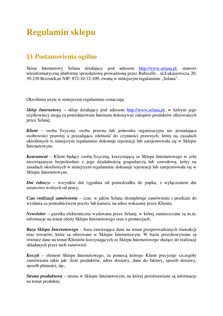 Regulamin sklepu §1 Postanowienia ogólne Sklep Internetowy Selana działający pod adresem http://www.selana.pl, stanowi teleinformatyczną platformę sprzedażową prowadzoną przez Rubicello , ul.Łukasiewicza 20, 39-230 Brzostek,nr NIP: 872-10-12-109, zwaną w niniejszym regulaminie „Selana”. Określenia użyte w niniejszym regulaminie oznaczają: Sklep Internetowy – sklep działający pod adresem http://www.selana.pl, w którym jego użytkownicy mogą za pośrednictwem Internetu dokonywać zakupów produktów oferowanych przez Selanę; Klient – osoba fizyczna, osoba prawna lub jednostka organizacyjna nie posiadająca osobowości prawnej a posiadająca zdolność do czynności prawnych, która na zasadach określonych w niniejszym regulaminie dokonuje rejestracji lub zarejestrowała się w Sklepie Internetowym; Konsument – Klient będący osobą fizyczną, korzystającą ze Sklepu Internetowego w celu niezwiązanym bezpośrednio z jego działalnością gospodarczą lub zawodową, który na zasadach określonych w niniejszym regulaminie dokonuje rejestracji lub zarejestrowała się w Sklepie Internetowym; Dni robocze – wszystkie dni tygodnia od poniedziałku do piątku, z wyłączeniem dni ustawowo wolnych od pracy; Czas realizacji zamówienia – czas, w jakim Selana skompletuje zamówienie i przekaże do wysłania za pośrednictwem poczty lub kuriera, na adres wskazany przez Klienta; Newsletter – gazetka elektroniczna wydawana przez Selanę, w której zamieszczane są m.in. informacje na temat oferty Sklepu Internetowego oraz o promocjach; Baza Sklepu Internetowego – baza zawierająca dane na temat przeprowadzanych transakcji oraz towarów, które są oferowane w Sklepie Internetowym. W bazie przechowywane są również dane na temat Klientów korzystających ze Sklepu Internetowego służące do realizacji składanych przez nich zamówień. Koszyk – element Sklepu Internetowego, za pomocą którego Klient precyzuje szczegóły zamówienia takie jak: ilość produktów, adres dostawy, dane do faktury, sposób dostawy, sposób płatności, itp.; Strona produktowa – strona w Sklepie Internetowym, na której przedstawione są informacje na temat produktu; § 2 Składanie zamówień Klient może składać zamówienia przez 24 godziny na dobę za pośrednictwem strony internetowej http://www.selana.pl. Klient składa zamówienie, wskazując na Stronie produktowej produktu, którym jest zainteresowany, poprzez uruchomienie linku ukrytego pod polem „Dodaj do koszyka”, a następnie w Koszyku wskazuje sposób dostawy i płatności za zamówienie. W zamówieniu (w Koszyku), Klient wskazuje: - zamawiany towar; - adres, na jaki ma być dostarczony towar; - sposób dostawy; - sposób płatności. Procedura składania zamówienia kończy się w momencie uruchomienia przez Klienta linku „Wyślij zamówienie”. Dokonanie tej czynności oznacza złożenie zamówienia i zawarcie z Selaną umowy kupna-sprzedaży produktów objętych zamówieniem. Na adres email wskazany podczas zamówienia lub rejestracji Selana wysyła wiadomość potwierdzającą przyjęcie zamówienia do realizacji. Klient dokonując wyboru sposobu płatności ma zawsze możliwość wyboru płatności przy odbiorze zamówionych produktów. § 3. Ceny towarów Sklep Internetowy zamieszcza informacje na temat swojej oferty na stronie http://www.selana.pl i oferuje towary znajdujące się w bazie Sklepu Internetowego za pośrednictwem Internetu. Ceny na stronie Sklepu Internetowego zamieszczone przy oferowanym produkcie na Stronie produktowej: - zawierają podatek VAT i podawane są w złotych polskich; - nie zawierają informacji na temat kosztów przesyłki; Ceną wiążącą i ostateczną produktu jest jego cena podana na Stronie produktowej w chwili składania zamówienia przez Klienta. Informacja na temat całkowitej wartości zamówienia obejmująca również koszty przesyłki, przedstawiana jest na stronie, po dokonaniu przez Klienta wyboru formy dostawy zamówienia i formy płatności (patrz §4). Selana zastrzega sobie prawo do dokonania na bieżąco zmian w cenach towarów znajdujących się w ofercie oraz przeprowadzania i odwoływania wszelkiego rodzaju akcji promocyjnych oraz wyprzedaży. Uprawnienie, o którym mowa w zdaniu poprzednim nie ma wpływu na zamówienia złożone przed datą wejścia w życie zmiany ceny, warunków akcji promocyjnych lub wyprzedaży i będą one realizowane na zasadach dotychczasowych. Promocje w Sklepie Internetowym nie podlegają łączeniu o ile regulamin danej promocji nie stanowi inaczej. Ceny towarów obowiązujące w Sklepie Internetowym obowiązują jedynie przy składaniu zamówienia za pośrednictwem Internetu na stronie internetowej http://www.selana.pl. § 4. Formy płatności i dostawy Zapłaty za zamówione produkty można dokonać: - gotówką w przypadku dostarczenia zamówienia za pośrednictwem firmy spedycyjnej lub innego podmiotu dostarczającego przesyłki; - przelewem elektronicznym; - zwykłym przelewem na rachunek bankowy. Selana umożliwi dokonywanie płatności elektronicznych za zamówione produkty za pomocą system oferowanego przez PayU. W przypadku gdy rachunek bankowy sprzedawcy nie został uznany kwotą należności w ciągu 3 dni od dnia zatwierdzenia zamówienia umowa zawarta między Klientem a Sprzedawcą ulega rozwiązaniu. Dostawa zamówionych towarów odbywa się za pośrednictwem wysyłki przez Pocztę Polską/paczka biznesowa 48H Koszt dostawy za pośrednictwem Poczty Polskiej jest zależnie od zakupionego towaru/wynika z opisu przy produkcie na stronie http://www.selana.pl. Dostawa zamówionych towarów odbywa się wyłącznie na terytorium Rzeczypospolitej Polskiej. W przypadku woli złożenia przez Klienta zamówienia, które miałoby zostać dostarczone poza granice Rzeczypospolitej Polskiej, Klient powinien skontaktować się z przedstawicielem Selany mailowo, na adres: [email protected] lub telefonicznie, na numer: (14)-