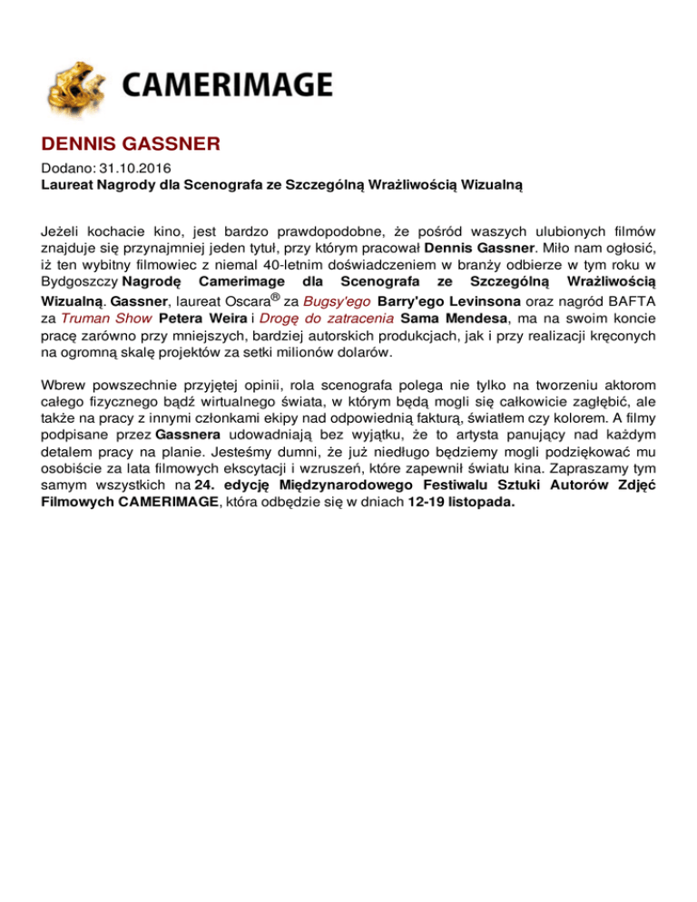 DENNIS GASSNER Dodano: 31.10.2016 Laureat Nagrody dla Scenografa ze Szczególną Wrażliwością Wizualną Jeżeli kochacie kino, jest bardzo prawdopodobne, że pośród waszych ulubionych filmów znajduje się przynajmniej jeden tytuł, przy którym pracował Dennis Gassner. Miło nam ogłosić, iż ten wybitny filmowiec z niemal 40-letnim doświadczeniem w branży odbierze w tym roku w Bydgoszczy Nagrodę Camerimage dla Scenografa ze Szczególną Wrażliwością Wizualną. Gassner, laureat Oscara® za Bugsy'ego Barry'ego Levinsona oraz nagród BAFTA za Truman Show Petera Weira i Drogę do zatracenia Sama Mendesa, ma na swoim koncie pracę zarówno przy mniejszych, bardziej autorskich produkcjach, jak i przy realizacji kręconych na ogromną skalę projektów za setki milionów dolarów. Wbrew powszechnie przyjętej opinii, rola scenografa polega nie tylko na tworzeniu aktorom całego fizycznego bądź wirtualnego świata, w którym będą mogli się całkowicie zagłębić, ale także na pracy z innymi członkami ekipy nad odpowiednią fakturą, światłem czy kolorem. A filmy podpisane przez Gassnera udowadniają bez wyjątku, że to artysta panujący nad każdym detalem pracy na planie. Jesteśmy dumni, że już niedługo będziemy mogli podziękować mu osobiście za lata filmowych ekscytacji i wzruszeń, które zapewnił światu kina. Zapraszamy tym samym wszystkich na 24. edycję Międzynarodowego Festiwalu Sztuki Autorów Zdjęć Filmowych CAMERIMAGE, która odbędzie się w dniach 12-19 listopada. Dennis Gassner, archiwum Dennisa Gassnera Począwszy od połowy lat 80. XX wieku, gdy debiutował samodzielnie jako scenograf przy kultowym Autostopowiczu Roberta Harmona, Gassner zadziwia dyscypliną, kreatywnością, przygotowaniem oraz perfekcyjnym wczuwaniem się w wizję reżyserów, z którymi podejmuje współpracę. Nic dziwnego, skoro miłość Gassnera do kina narodziła się wraz z podziwem dla Lawrence'a z Arabii Davida Leana, a młodego chłopaka od początku ciągnęło do szeroko pojmowanej sztuki. Mając do wyboru intratną karierę zawodnika futbolu amerykańskiego, Gassner wolał kontynuować studia architektoniczne. Pomogło mu to po przeprowadzce do Los Angeles, gdzie miał szczęście poznać przygotowującego się do Czasu Apokalipsy Francisa Forda Coppolę, który wyznaczył ambitnemu chłopakowi funkcję asystenta scenografa Deana Tavoularisa. Coppola zatrudnił także Gassnera w swoim studiu American Zoetrope, gdzie ten pracował jako grafik przy kampaniach promocyjnych filmów oraz plakatach (między innymi do zrekonstruowanej wersji Napoleona Abla Gance'a, arcydzieła kina niemego). Gassner wspominał później pięć lat współpracy z Tavoularisem jako najlepszą możliwą praktykę (...) dowiedziałem się, jak filmów nie należy kręcić. Wspomagał scenografa między innymi na planach Opowieści Hammetta Wima Wendersa oraz Rumble Fish Coppoli. Ten ostatni, nakręcony w 1983 roku, okazał się dla Gassnera projektem przełomowym. Od tamtego czasu pracował z najciekawszymi reżyserami w branży, między innymi ze Stephenem Frearsem przy Naciągaczach oraz Timem Burtonem na planie osobistej dla reżysera Dużej ryby. W pierwszym przypadku wspomógł reżysera w kreowaniu atrakcyjnego i zwodniczego światka drobnych oszustów, w drugim uwiarygodnił opowiadaną na granicy rzeczywistości i fikcji historię baśniowego romansu dwójki życiowych romantyków. historię baśniowego romansu dwójki życiowych romantyków. Kadr z filmu "Bugsy" Kadr z filmu "Barton Fink" Wieloletnie współprace okazały się szczególnie owocne dla Gassnera. Na ponad dekadę związał się z braćmi Coen, projektując na potrzeby ich Ścieżki strachu ociekający moralną dwuznacznością świat gangsterów walczących o władzę w czasach prohibicji. Za kolejny wspólny film, Bartona Finka, którego „piekielny hotel umysłu” zapadł w pamięci większości widzów, Gassner uzyskał pierwszą w karierze nominację do Oscara® (w tym samym roku zdobył Nagrodę Akademii® za Bugsy'ego). Z Coenami nakręcił jeszcze Hudsucker Proxy, Bracie, gdzie jesteś?, Człowieka, którego nie było oraz Ladykillers, czyli zabójczy kwintet, w każdym z tych filmów uzupełniając perfekcyjnie reżyserską wizję słynnego duetu. W tym samym czasie spotkał na swej drodze Sama Mendesa, dla którego powrócił najpierw do gangsterskiego świata w Drodze do zatracenia, by później przenieść się wraz z nim do amerykańskiej bazy wojskowej w Iraku w Jarheadzie: Żołnierzu piechoty morskiej i zaprojektować scenografię do dwóch stworzonych przez reżysera filmów o Jamesie Bondzie: Skyfall oraz Spectre. Gassner pracował także z Markiem Forsterem przy wcześniejszej odsłonie filmowych przygód legendarnego agenta 007 Quantum of Solace. Pracując z braćmi Coen oraz Mendesem, scenograf zgrał się także świetnie z autorem zdjęć Rogerem Deakinsem, z którym kręci obecnie kontynuację kultowego Łowcy androidów, którą reżyseruje Denis Villeneuve. Kadr z filmu "Droga do zatracenia" Kadr z filmu "Złoty kompas" Skyfall oraz Spectre stanowiły dla Gassnera największe wyzwania w karierze, również w perspektywie czasowej, bowiem przy planowaniu i realizacji tego pierwszego spędził ponad półtora roku i w samym tylko okresie przygotowawczym wykonał 75 lotów do dziewięciu krajów na całym świecie. W jednym z wywiadów wyznał z przekąsem: mój styl życia nazywa się jetlag – moje życie to jeden niekończący się jetlag. Wydawać by się mogło, że poza filmami o Bondzie Gassner czuje się najlepiej w projektach, w których musi powracać wyobraźnią do dawno minionych epok, jednakże scenograf jest otwarty na różne wyzwania. Dwie z pięciu uzyskanych nominacji do Oscara® zdobył za stworzenie od zera fantazyjnych baśniowych światów. W Złotym kompasie Chrisa Weitza był to szereg efektownych i klimatycznych krain fantasy, z kolei w Tajemnicach lasu Gassner powo