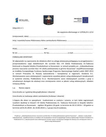 Załącznik nr 1 do zapytania ofertowego nr 2/POKL/9.1.2/13 (miejscowość, data)………………………………………………………………………. Imię i nazwisko/nazwa Wykonawcy Adres zamieszkania Wykonawcy ..................................................... ……………………………………………………………………………………………………………………………………………………………. PESEL……………………………………………………NIP…………………………………………………………………………………........ Nr tel………………………………………………….. Nr fax…………………………………., e-mail……………………………………. FORMULARZ OFERTOWY W odpowiedzi na zaproszenie do składania ofert na usługę edukacyjną polegającą na przygotowaniu i przeprowadzeniu zajęć dodatkowych dla uczniów klas I-III Szkoły Podstawowej im.Tadeusza Kościuszki w Zespole Szkolno-Przedszkolnym w Koszarawie w ramach projektu pn. „Indywidualizacja procesu nauczania uczniów klas I-III szkoły podstawowej w gminie Koszarawa" współfinansowanego ze środków Europejskiego Funduszu Społecznego Programu Operacyjnego Kapitał Ludzki 2007-2013 w ramach Priorytetu IX. Rozwój wykształcenia i kompetencji w regionach, Działania 9.1. Wyrównywanie szans edukacyjnych i zapewnienie wysokiej jakości usług edukacyjnych świadczonych w systemie oświaty, Poddziałania 9.1.2. Wyrównywanie szans edukacyjnych uczniów z grup o utrudnionym dostępie do edukacji oraz zmniejszanie różnic w jakości usług edukacyjnych, składam niniejszą ofertę: L.p. Nazwa zajęcia Cena brutto za 1 godzinę lekcyjną(liczbowo i słownie) Cena brutto za realizację całości zamówienia (liczbowo i słownie) 1.Zajęcia dla dzieci ze specjalnymi trudnościami w czytaniu i pisaniu, w tym także zagrożonych ryzykiem dysleksji w klasach I-III Szkoły Podstawowej im. Tadeusza Kościuszki w Zespole SzkolnoPrzedszkolnym w Koszarawie - ogółem 30 godzin (10 godz. w terminie do 20.12.2013r. i 20 godzin w terminie od 01.01.2014r. do 10.06.2014r.), 1 grupa max.8-osobowa. -------------------------------------------------------------------------------------------------------------------------------------Projekt pn. „Indywidualizacja procesu nauczania uczniów klas I-III szkoły podstawowej w gminie Koszarawa" , „Zabawa z nauką dzięki indywidualizacji”, współfinansowany ze środków Unii Europejskiej w ramach Europejskiego Funduszu Społecznego Priorytet IX Działanie 9.1 Poddziałanie 9.1.2 „Wyrównywanie szans edukacyjnych uczniów z grup o utrudnionym dostępie do edukacji oraz zmniejszanie różnic w jakości usług edukacyjnych” 2.Zajęcia socjoterapeutyczne i psychoedukacyjne dla dzieci w klasach I-III Szkoły Podstawowej im. Tadeusza Kościuszki w Zespole Szkolno-Przedszkolnym w Koszarawie - ogółem 30 godzin (10 godz. w terminie do 20.12.2013r. i 20 godzin w terminie od 01.01.2014r. do 10.06.2014r.), 1 grupa max.8osobowe. 3. Zajęcia rozwijające zainteresowania uczniów wybitnie, szczególnie uzdolnionych-ze szczególnym uwzględnieniem nauk matematyczno-przyrodniczych w klasach I-III Szkoły Podstawowej im. Tadeusza Kościuszki w Zespole Szkolno-Przedszkolnym w Koszarawie - ogółem 30 godzin (10 godz. w terminie do 20.12.2013r. i 20 godzin w terminie od 01.01.2014r. do 10.06.2014r.), 1 grupa max.8-osobowe. 4.Zajecia rozwijające zainteresowania uczniów szczególnie uzdolnionych-artystycznie dla uczniów w klasach I-III Szkoły Podstawowej im. Tadeusza Kościuszki w Zespole Szkolno-Przedszkolnym w Koszarawie - ogółem 30 godzin (10 godz. w terminie do 20.12.2013r. i 20 godzin w terminie od 01.01.2014r. do 10.06.2014r.), 1 grupa max.8-osobowe Oświadczam, że zapoznałem (-am) się z warunkami Zapytania Ofertowego, nie wnoszę do nich żadnych zastrzeżeń i spełniam wymagania dotyczące kwalifikacji. Zobowiązuję się realizować zamówienie w terminach określonych w Zapytaniu Ofertowym. …………………………………………………. (czytelny podpis) -------------------------------------------------------------------------------------------------------------------------------------Projekt pn. „Indywidualizacja procesu nauczania uczniów klas I-III szkoły podstawowej w gminie Koszarawa" , „Zabawa z nauką dzięki indywidualizacji”, współfinansowany ze środków Unii Europejskiej w ramach Europejskiego Funduszu Społecznego Priorytet IX Działanie 9.1 Poddziałanie 9.1.2 „Wyrównywanie szans edukacyjnych uczniów z grup o utrudnionym dostępie do edukacji oraz zmniejszanie różnic w jakości usług edukacyjnych” Załącznik nr 2 do zapytania ofertowego nr 2/POKL/9.1.2/2013 (miejscowość, data)……………………………………….......... (imię i nazwisko, adres)) PESEL…………………………………………………………………………………………………………... OŚWIADCZENIE Ja niżej podpisany/a, świadomy/a odpowiedzialności karnej za fałszywe zeznania wynikające z art. 233 Kodeksu Karnego (podanie nieprawdy lub zatajenie nieprawdy) oświadczam, że nie byłem/am karany/a za przestępstwa popełnione umyślnie i nie toczy się przeciwko mnie postępowanie karne, posiadam pełną zdolność do czynności prawnych oraz korzystam z pełni praw publicznych …………………………………………. (czytelny podpis) Projekt pn. „Indywidualizacja procesu nauczania uczniów klas I-III szkoły podstawowej w gminie Koszarawa" , „Zabawa z nauką dzięki indywidualizacji”, współfinansowany ze środków Unii Europejskiej w ramach Europejskiego Funduszu Społecznego Priorytet IX Działanie 9.1 Poddziałanie 9.1.2 „Wyrównywanie szans edukacyjnych uczniów z grup o utrudnionym dostępie do edukacji oraz zmniejszanie różnic w jakości usług edukacyjnych” Załącznik nr 3 do zap
