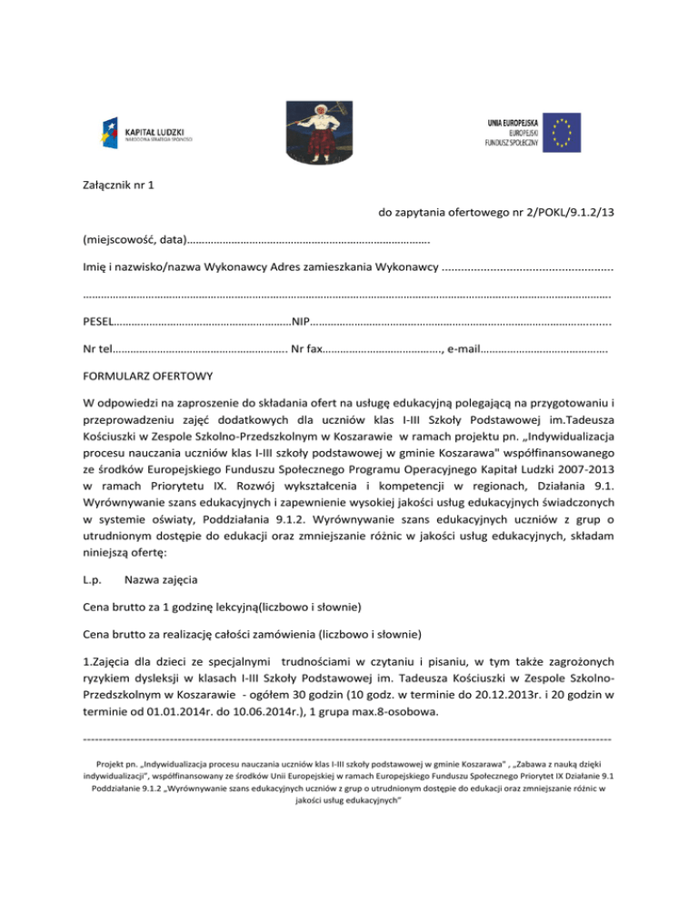 Załącznik nr 1 do zapytania ofertowego nr 2/POKL/9.1.2/13