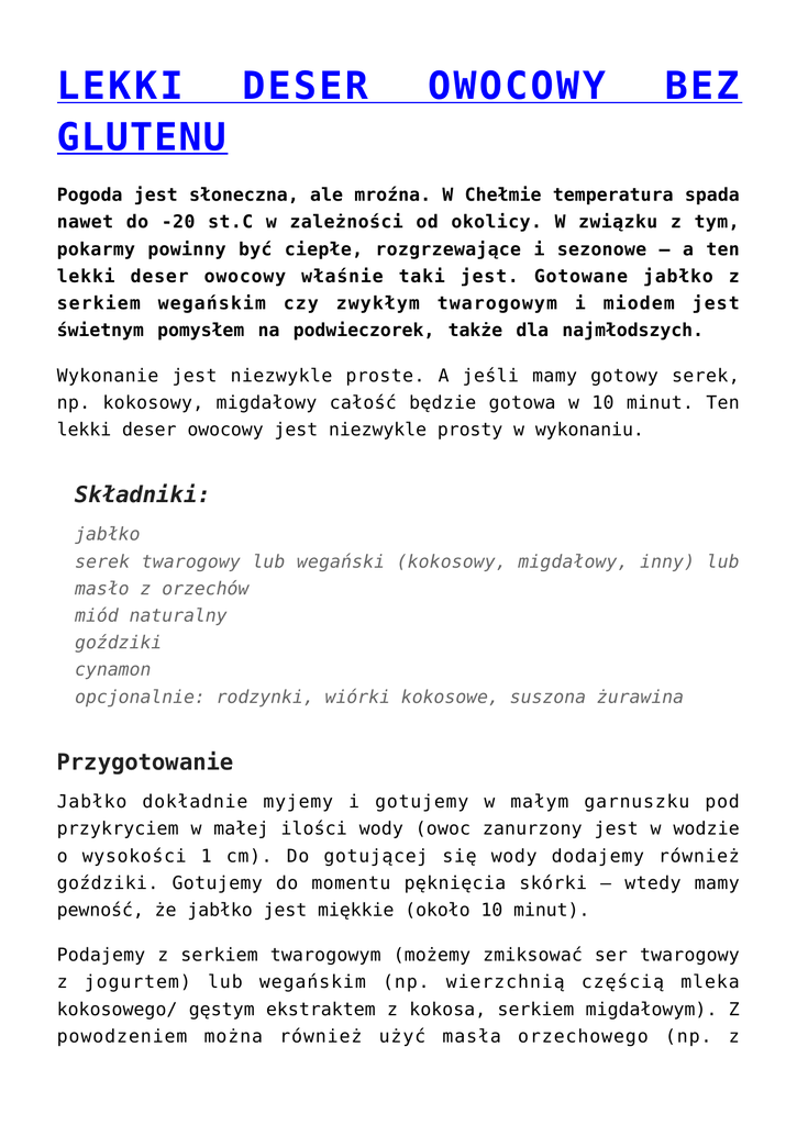 LEKKI DESER GLUTENU OWOCOWY BEZ Pogoda jest słoneczna, ale mroźna. W Chełmie temperatura spada nawet do -20 st.C w zależności od okolicy. W związku z tym, pokarmy powinny być ciepłe, rozgrzewające i sezonowe – a ten lekki deser owocowy właśnie taki jest. Gotowane jabłko z serkiem wegańskim czy zwykłym twarogowym i miodem jest świetnym pomysłem na podwieczorek, także dla najmłodszych. Wykonanie jest niezwykle proste. A jeśli mamy gotowy serek, np. kokosowy, migdałowy całość będzie gotowa w 10 minut. Ten lekki deser owocowy jest niezwykle prosty w wykonaniu. Składniki: jabłko serek twarogowy lub wegański (kokosowy, migdałowy, inny) lub masło z orzechów miód naturalny goździki cynamon opcjonalnie: rodzynki, wiórki kokosowe, suszona żurawina Przygotowanie Jabłko dokładnie myjemy i gotujemy w małym garnuszku pod przykryciem w małej ilości wody (owoc zanurzony jest w wodzie o wysokości 1 cm). Do gotującej się wody dodajemy również goździki. Gotujemy do momentu pęknięcia skórki – wtedy mamy pewność, że jabłko jest miękkie (około 10 minut). Podajemy z serkiem twarogowym (możemy zmiksować ser twarogowy z jogurtem) lub wegańskim (np. wierzchnią częścią mleka kokosowego/ gęstym ekstraktem z kokosa, serkiem migdałowym). Z powodzeniem można również użyć masła orzechowego (np. z orzechów nerkowca czy włoskich). Opcji jest wiele. Osładzamy całość miodem naturalnym (ciemny miód ma więcej antyoksydantów) i posypujemy cynamonem. Podajemy na ciepło. Ten przepis to szybsza alternatywa pieczonych jabłek – lekki deser, który ma bardzo delikatny miąższ owocowy jak pianka. I co dla mnie osobiście istotne – deser można podać na wiele sposobów, w zależności od tolerowanych dodatków i składników, które akurat mam w domu. Smacznego!