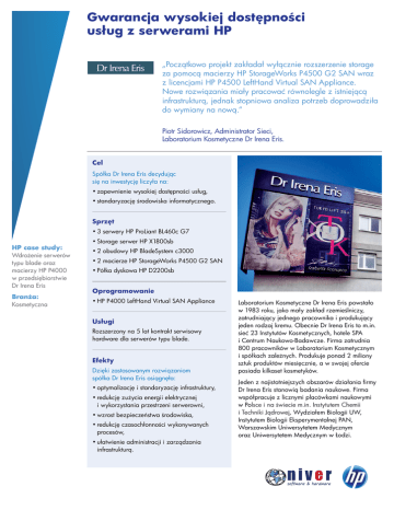 Gwarancja wysokiej dostępności usług z serwerami HP „Początkowo projekt zakładał wyłącznie rozszerzenie storage za pomocą macierzy HP StorageWorks P4500 G2 SAN wraz z licencjami HP P4500 LeftHand Virtual SAN Appliance. Nowe rozwiązania miały pracować równolegle z istniejącą infrastrukturą, jednak stopniowa analiza potrzeb doprowadziła do wymiany na nową.” Piotr Sidorowicz, Administrator Sieci, Laboratorium Kosmetyczne Dr Irena Eris. Cel Spółka Dr Irena Eris decydując się na inwestycję liczyła na: •zapewnienie wysokiej dostępności usług, •standaryzację środowiska informatycznego. Sprzęt •3 serwery HP ProLiant BL460c G7 HP case study: Wdrożenie serwerów typu blade oraz macierzy HP P4000 w przedsiębiorstwie Dr Irena Eris Branża: Kosmetyczna •Storage serwer HP X1800sb •2 obudowy HP BladeSystem c3000 •2 macierze HP StorageWorks P4500 G2 SAN •Półka dyskowa HP D2200sb Oprogramowanie •HP P4000 LeftHand Virtual SAN Appliance Usługi Rozszerzony na 5 lat kontrakt serwisowy hardware dla serwerów typu blade. Efekty Dzięki zastosowanym rozwiązaniom spółka Dr Irena Eris osiągnęła: •optymalizację i standaryzację infrastruktury, •redukcję zużycia energii elektrycznej i wykorzystania przestrzeni serwerowni, •wzrost bezpieczeństwa środowiska, •redukcję czasochłonności wykonywanych procesów, •ułatwienie administracji i zarządzania infrastrukturą. Laboratorium Kosmetyczne Dr Irena Eris powstało w 1983 roku, jako mały zakład rzemieślniczy, zatrudniający jednego pracownika i produkujący jeden rodzaj kremu. Obecnie Dr Irena Eris to m.in. sieć 23 Instytutów Kosmetycznych, hotele SPA i Centrum Naukowo-Badawcze. Firma zatrudnia 800 pracowników w Laboratorium Kosmetycznym i spółkach zależnych. Produkuje ponad 2 miliony sztuk produktów miesięcznie, a w swojej ofercie posiada kilkaset kosmetyków. Jeden z najistotniejszych obszarów działania firmy Dr Irena Eris stanowią badania naukowe. Firma współpracuje z licznymi placówkami naukowymi w Polsce i na świecie m.in. Instytutem Chemii i Techniki Jądrowej, Wydziałem Biologii UW, Instytutem Biologii Eksperymentalnej PAN, Warszawskim Uniwersytetem Medycznym oraz Uniwersytetem Medycznym w Łodzi. Piotr Sidorowicz, Administrator Sieci, Laboratorium Kosmetyczne Dr Irena Eris. Efektem tej działalności jest nie tylko produkcja skutecznych, bezpiecznych i innowacyjnych kosmetyków, ale także publikacje popularnonaukowe w polskich i zagranicznych pismach branżowych. Firma jest laureatem wielu prestiżowych nagród i wyróżnień. Na początku 2012 roku organizacja Superbrands uznała Dr Irena Eris najsilniejszą marką na polskim rynku. Firma zdobyła uznanie również za sposób zarządzania przedsiębiorstwem, pozycję ekonomiczną oraz stosowane rozwiązania technologiczne i informatyczne. Wyzwanie W firmie cały czas powstają nowe projekty, które wymagają kreowania kolejnych zasobów IT. Aby zapewnić bardziej efektywne wykorzystanie urządzeń, zarządzanie wydajnością i optymalizację zasobów dyskowych, podjęto decyzję o rozbudowie i wirtualizacji dotychczasowej infrastruktury. „Na początku nie potrafiliśmy dokładnie określić naszych potrzeb biznesowych. Potrzebowaliśmy większej przestrzeni dyskowej, ale naszym zdaniem dokładanie kolejnych urządzeń do posiadanych maszyn mijało się z celem. Mieliśmy problem również z różnorodnością posiadanego sprzętu” – mówi Piotr Sidorowicz, Administrator Sieci, Laboratorium Kosmetyczne Dr Irena Eris. Rozwiązanie Firma zdecydowała się na zakup i wdrożenie rozwiązania HP Blade C3000 z serwerami BL460c, które zapewnia wysoką wydajność, zrównoważone skalowanie i odporność na błędy. Projekt rozpoczął się od przeprowadzenia analizy przedwdrożeniowej na podstawie, której firma zdecydowała o instalacji urządzeń. Wybór ostatecznie potwierdziły testy wydajnościowe. „Nasza analiza potrzeb klienta wskazała rozwiązanie, które zostało wybrane i zaakceptowane. Aby ostatecznie przekonać klienta do naszej propozycji wypożyczyliśmy rozwiązanie HP Blade C3000 z serwerami BL460c i macierze P4300 G2 SAN. Testy wypadły pomyślnie, a dodatkowo rozwiązanie tak zainteresowało klienta że zdecydował się na zakup bardziej wydajnego i skalowalnego rozwiązania P4500 G2 Virtual SAN” – mówi Jarosław Niwiński, Prezes spółki Niver. Rozwiązania HP były porównywane również z innymi urządzeniami dostępnymi na rynku. Jednak szeroki zakres możliwości oraz efekty związane z wdrożeniem, w relacji do ceny urządzeń HP, okazały się bezkonkurencyjne. „Przy realizacji projektu korzystaliśmy z usług firmy Niver, która dostarczyła prekonfigurowany sprzęt. Pozostałą część wdrożenia przeprowadziliśmy samodzielnie. Montaż i finalna konfiguracja sprzętu oraz instalacja oprogramowania wirtualizacyjnego trwały łącznie około dwóch miesięcy. W trakcie wdrożenia nie pojawiły się żadne problemy. Byłem bardzo mile zaskoczony, że całość implementacji przebiegła bezawaryjnie. Dodatkowo po zakończeniu wdrożenia podpisaliśmy także kontrakt serwisowy.” – mówi Piotr Sidorowicz, Administrator Sieci, Laboratorium Kosmetyczne Dr Irena Eris. Firma postanowiła również zwirtualizować całe środowisko informatyczne. W tym celu wykorzystano oprogramowanie HP P4500 LeftHand Virtual SAN Appliance i zaimplementowano 2 macierze HP StorageWorks P4500 G2 SAN „Dzięki wykorzystaniu oprogramowania HP P4500 LeftHand Virtual SAN Appliance firma otrzymała szansę na wykorzystanie swoich dotychczasowych urządzeń. Rozwiązanie HP przysłowiowo „chowa” pod sobą dowolne, obce urządzenia dyskowe z danymi, dzięki czemu są dostępne w infrastrukturze urządzeń HP jako kolejne zasoby przestrzeni dyskowej. Jest to idealny sposób na ochronę inwestycji. Urządzenia, które wydają się niepotrzebne można włączyć do nowej infrastruktury i dalej z nich kor