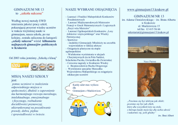 GIMNAZJUM NR 13 to „szkoła sukcesu” Według nowej metody EWD mierzenia jakości pracy szkół, pokazującej przyrost wiedzy uczniów w trakcie trzyletniej nauki w gimnazjum, nasza szkoła, po raz kolejny, została zaliczona do kategorii „szkoły sukcesu” wśród kilkunastu najlepszych gimnazjów publicznych w Krakowie Od 2003 roku jesteśmy „Szkołą z klasą” MISJĄ NASZEJ SZKOŁY jest: pomoc uczniowi w znalezieniu odpowiedniego miejsca w społeczności, dbałość o zapewnienie mu harmonijnego rozwoju moralnego, intelektualnego, emocjonalnego i fizycznego, rozbudzenie dociekliwości poznawczej, ukierunkowanej na poszukiwanie prawdy, dobra, piękna i sprawiedliwości w świecie. NASZE WYBRANE OSIĄGNIĘCIA – Laureaci i Finaliści Małopolskich Konkursów Przedmiotowych – Laureaci Międzynarodowych Mistrzostw Francji w Grach Matematycznych i Logicznych „Paryż wita Mistrzów” – Laureaci Ogólnopolskich Konkursów „Losy żołnierza i oręża polskiego” oraz Wiedzy Patriotycznej – Sportowe: - medaliści Gimnazjady Młodzieży na szczeblu wojewódzkim w lekkiej atletyce – Osiągnięcia plastyczne na etapie ogólnopolskim – Wielokrotne wyróżnienia w akcjach Charytatywnych (m.in.Pola Nadziei, Szlachetna Paczka, Gwiazdka dla Zwierzaka) – Coroczne nagrody w Konkursie Wiedzy o Bezpieczeństwie Ruchu Drogowego – Wyróżnienie specjalne Marszałka Województwa Małopolskiego za osiągnięcia edukacyjne uczniów www.gimnazjum13.krakow.pl GIMNAZJUM NR 13 im. Adama Chmielowskiego – św. Brata Alberta w Krakowie ul. Mackiewicza 15 tel/fax 12 415 56 66 [email protected] Nasz Patron Każdy zalet moc wylicza dla Gimnazjum z Mackiewicza „Powinno się być dobrym jak chleb; powinno się być jak chleb, który dla wszystkich leży na stole, z którego każdy może kęs dla siebie ukroić i nakarmić się, jeśli głodny” św. Brat Albert OFERUJEMY w roku szk. 2012/2013 proponowane klasy: – ogólna rozwijająca zainteresowania przyrodniczo – turystyczne – ogólna rozwijająca zainteresowania matematyczno – informatyczne – ogólna rozwijająca zainteresowania sportowe – ogólna bogatą bazę dydaktyczną: o pracownie przedmiotowe o bibliotekę z internetowym centrum informacji multimedialnej o salę gimnastyczną z siłownią, dwa boiska trawiaste naukę języka angielskiego i niemieckiego doświadczoną kadrę pedagogiczną nagradzaną nagrodami Ministra Edukacji, Małopolskiego Kuratora Oświaty, Prezydenta Miasta Krakowa (80% nauczycieli dyplomowanych, 40% nauczycieli egzaminatorów CKE) skuteczne przeciwdziałanie współczesnym zagrożeniom pomoc pedagogiczną w wyborze dalszej drogi kształcenia monitoring wewnętrzny i zewnętrzny stołówkę szkolną naukę w godzinach 8.00 – 15.00 rozwijanie zainteresowań w kołach przedmiotowych, UMKS „Olimpic” klub wolontariatu wycieczki krajowe i zagraniczne, „zielone szkoły”, wyjazdy językowe współpraca z uczelniami krakowskimi UJ, UP, AWF opiekę wolontariuszy Stowarzyszenia „Wiosna” w ramach programu „Akademia przyszłości”, dla uczniów mających trudności w nauce GIMNAZJUM NR 13 posiada: o Certyfikat „Szkoła promująca bezpieczeństwo” 2006 – 2009 o Przedłużenie certyfikatu „Szkoły promującej bezpieczeństwo” na lata 2009-2014 o Certyfikat „Szkoła z klasą” o Certyfikat przynależności do „Małopolskiej Sieci Szkół Promujących Zdrowie” o Certyfikat Programu „ABECADŁO zdrowia i bezpieczeństwa” o Certyfikat „Wielkiego Serca” o Certyfikat „Szkoła bez przemocy” INFORMACJE O REKRUTACJI Zapisy uczniów w sekretariacie szkoły w godz. 8.00 – 15.00 od 5 marca 2012r. do 27 kwietnia 2012r. Wymagane dokumenty: 1. Kwestionariusz osobowy 2. Podanie /uczniowie spoza rejonu/ Podanie i kwestionariusz do pobrania ze strony internetowej szkoły. Postępowanie rekrutacyjno – kwalifikacyjne zgodnie z Zarządzeniem UM Krakowa – szczegóły na www.gimnazjum13.krakow.pl DZIEŃ OTWARTY SZKOŁY 15 marca 2012r. (czwartek) godz. 18:oo – 20:oo ZAPRASZAMY
