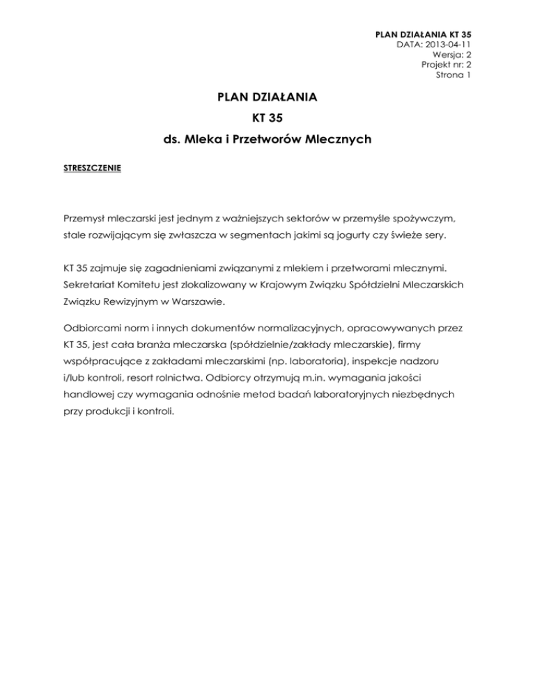 PLAN DZIAŁANIA KT 35 DATA: 2013-04-11 Wersja: 2 Projekt nr: 2 Strona 1 PLAN DZIAŁANIA KT 35 ds. Mleka i Przetworów Mlecznych STRESZCZENIE Przemysł mleczarski jest jednym z ważniejszych sektorów w przemyśle spożywczym, stale rozwijającym się zwłaszcza w segmentach jakimi są jogurty czy świeże sery. KT 35 zajmuje się zagadnieniami związanymi z mlekiem i przetworami mlecznymi. Sekretariat Komitetu jest zlokalizowany w Krajowym Związku Spółdzielni Mleczarskich Związku Rewizyjnym w Warszawie. Odbiorcami norm i innych dokumentów normalizacyjnych, opracowywanych przez KT 35, jest cała branża mleczarska (spółdzielnie/zakłady mleczarskie), firmy współpracujące z zakładami mleczarskimi (np. laboratoria), inspekcje nadzoru i/lub kontroli, resort rolnictwa. Odbiorcy otrzymują m.in. wymagania jakości handlowej czy wymagania odnośnie metod badań laboratoryjnych niezbędnych przy produkcji i kontroli. PLAN DZIAŁANIA KT 35 DATA:2013-04-11 Wersja: 2 Projekt nr: 2 Strona 2 1 ŚRODOWISKO BIZNESOWE KT 1.1 Opis środowiska biznesowego Na działalność gospodarczą objętą zakresem KT znaczący wpływ mają następujące uwarunkowania polityczne, gospodarcze, techniczne, prawne, społeczne i/lub aspekty regionalne/międzynarodowe: Przetwórstwo mleka jest jednym z najważniejszych sektorów europejskiego przemysłu żywnościowego. Charakteryzuje się produkcją wyrobów o wysokiej wartości dodanej, jak np. sery dojrzewające i twarogowe, jogurty, a w tym tzw. innowacyjne przetwory mleczarskie jak desery, czy sery i twarożki z dodatkami smakowymi. Polityka krajowa i unijna w znaczącym stopniu wpływa na sektor mleka poprzez różnego rodzaju instrumenty regulujące rynek: kwoty mleczne, rynkowe instrumenty jak ceny interwencyjne i różne rodzaje wsparcia (np. mleko w szkole, pomoc żywnościowa dla najuboższej ludności). Popyt na przetwory mleczne charakteryzuje stały powolny wzrost konsumpcji serów, świeżych przetworów mlecznych oraz mlecznych składników do produkcji innej żywności. Podkomitet SC 5 „Mleko i Przetwory Mleczne” Komitetu Technicznego TC 34 w Międzynarodowej Organizacji Normalizacyjnej ISO opracowuje normy dotyczące metod analitycznych i pobierania próbek mleka i przetworów mlecznych poprzez członkostwo poszczególnych krajów w tych organizacjach. Prace te, dotyczące szerokiej tematyki (w tym zdrowia i bezpieczeństwa mleka i przetworów mlecznych), trwają od wielu lat, a opracowywane normy są ciągle aktualizowane. Efektami prac normalizacyjnych są zainteresowani: − przemysł mleczarski jako bezpośredni wdrażający; − handel przetworami mlecznymi; − instytucje kontrolujące (w tym rządowe laboratoria) oraz jednostki badawcze; − inne sektory przemysłu spożywczego – użytkownicy przetworów mlecznych jako składników innych produktów. PLAN DZIAŁANIA KT 35 DATA:2013-04-11 Wersja: 2 Projekt nr: 2 Strona 3 1.2 Wskaźniki ilościowe dotyczące środowiska biznesowego Poniższe wskaźniki ilościowe opisują środowisko biznesowe w celu wsparcia działań KT poprzez zapewnienie niezbędnych danych: Tablica 1 Bilans mleka krowiego (w tys. ton) w Polsce Wyszczególnienie 2011 Produkcja Import Razem do dyspozycji Eksport Na pasze Na spożycie w tym samozaopatrzenie Razem rozchody 12405 941 13346 2226 515 10605 1904 13346 Samowystarczalność (%) 111,6 Źródło: Dane IERiGŻ-PIB na podstawie danych GUS i CAAC. Tablica 2 Produkcja i skup mleka krowiego w Polsce w tym skup Lata Sprzedaż ogółem Produkcja tys. ton 2011 12405 razem a) w tym przez przemysł mleczarski 9043 9013 mln l 12052 9752 Źródło: Dane GUS. Tablica 3 Wyniki ekonomiczno-finansowe przetwórstwa mleka w Polsce Wyszczególnienie 2011 1. Liczba mleczarni 2. Liczba zatrudnionych (tys. osób) 3. Wartość sprzedaży (mld zł) 196 34,0 26,3 4. Udział eksportu bezpośredniego w przychodach ze sprzedaży (%) 12,4 Źródło: Dane IERiGŻ-PIB na podstawie niepublikowanych materiałów GUS. PLAN DZIAŁANIA KT 35 DATA:2013-04-11 Wersja: 2 Projekt nr: 2 Strona 4 Tablica 4 Produkcja wybranych przetworów mlecznych w Polsce Produkt 2011 tys.ton Razem mleko płynne przetworzone w tym: mleko spożywcze mleko przerzutowe Mleko fermentowane w tym jogurty Mleko i śmietanka skoncentrowane Mleko w proszku ogółem w tym: pełne odtłuszczone Sery ogółem w tym: sery dojrzewające sery niedojrzewające Sery topione Śmietana i śmietanka Masło i tłuszcze mleczne w masie produktu w ekwiwalencie masła 82% tłuszczu Lody (mln l) Serwatka w tym suszona 2817,7 1448,9 1368,8 723,8 497,6 51,7 148,3 29,4 118,9 669,0 284,7 384,3 75,9 331,1 171,4 140,0 2,5 1121,5 254,9 Źródło: Dane GUS, opracowanie IERiGŻ-PIB. Tablica 5. Handel zagraniczny przetworami mlecznymi w Polsce Wyszczególnienie 2009 2010 2011 w mln l w ekwiwalencie surowca Eksport 2130 2100 2180 Import 620 790 930 Saldo 1510 1310 1250 w mln EUR Eksport 943,2 1208,1 1396,9 Import 310,2 430,3 522,5 Saldo 633,0 777,8 874,4 Źródło: Obliczenia IERiGŻ-PIB na podstawie danych CAAC. PLAN DZIAŁANIA KT 35 DATA:2013-04-11 Wersja: 2 Projekt nr: 2 Strona 5 2 OCZEKIWANE KORZYŚCI Z REALIZACJI PRAC KT Korzyści wynikające z realizacji prac KT to implementowanie na bieżąco do zbioru Polskich Norm nowo publikowanych Norm Europejskich oraz otwarcie na potrzeby branży mleczarskiej poprzez wprowadzanie Norm Międzynarodowych do zbioru PN, w wyniku czego sektor mleczarski otrzymuje podstawę do aktualizacji wymagań jakości handlowej czy wymagań odnośnie metod badań laboratoryjnych niezbędnych przy produkcji i kontroli. 3 CZŁONKOSTWO W KT Każdy podmiot krajowy zainteresowany daną tematyką ma prawo zgłosić chęć uczestnictwa w KT i po spełnieniu wymogów proceduralnych (procedura SZJ nr Z2-P3 w powiązaniu z Z2-P1) stać się członkiem KT. Każdy członek KT realizuje zadania KT poprzez swoich reprezentantów. Poniżej zamieszczono adres strony internetowej z aktualnym składem KT https://pzn.pkn.pl/kt/?pid=czkt&i