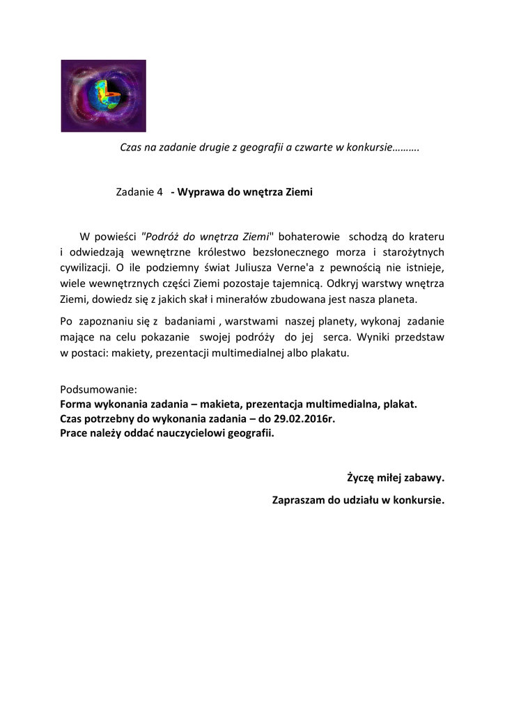 Czas na zadanie drugie z geografii a czwarte w konkursie………. Zadanie 4 - Wyprawa do wnętrza Ziemi W powieści "Podróż do wnętrza Ziemi" bohaterowie schodzą do krateru i odwiedzają wewnętrzne królestwo bezsłonecznego morza i starożytnych cywilizacji. O ile podziemny świat Juliusza Verne'a z pewnością nie istnieje, wiele wewnętrznych części Ziemi pozostaje tajemnicą. Odkryj warstwy wnętrza Ziemi, dowiedz się z jakich skał i minerałów zbudowana jest nasza planeta. Po zapoznaniu się z badaniami , warstwami naszej planety, wykonaj zadanie mające na celu pokazanie swojej podróży do jej serca. Wyniki przedstaw w postaci: makiety, prezentacji multimedialnej albo plakatu. Podsumowanie: Forma wykonania zadania – makieta, prezentacja multimedialna, plakat. Czas potrzebny do wykonania zadania – do 29.02.2016r. Prace należy oddać nauczycielowi geografii. Życzę miłej zabawy. Zapraszam do udziału w konkursie.