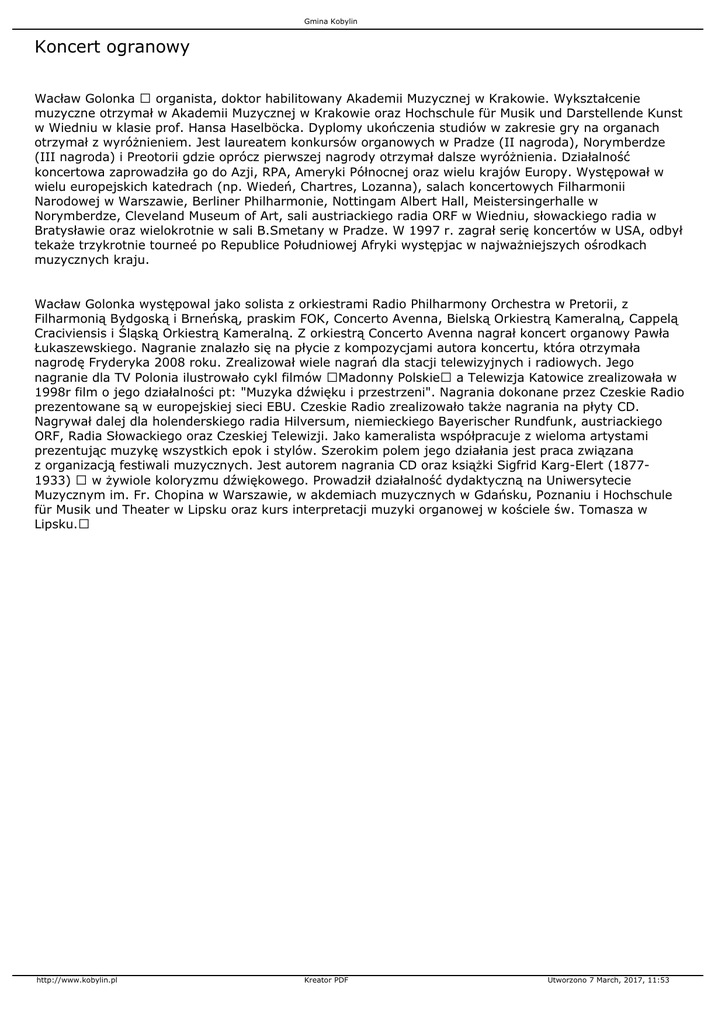 Gmina Kobylin Koncert ogranowy Wacław Golonka organista, doktor habilitowany Akademii Muzycznej w Krakowie. Wykształcenie muzyczne otrzymał w Akademii Muzycznej w Krakowie oraz Hochschule für Musik und Darstellende Kunst w Wiedniu w klasie prof. Hansa Haselböcka. Dyplomy ukończenia studiów w zakresie gry na organach otrzymał z wyróżnieniem. Jest laureatem konkursów organowych w Pradze (II nagroda), Norymberdze (III nagroda) i Preotorii gdzie oprócz pierwszej nagrody otrzymał dalsze wyróżnienia. Działalność koncertowa zaprowadziła go do Azji, RPA, Ameryki Północnej oraz wielu krajów Europy. Występował w wielu europejskich katedrach (np. Wiedeń, Chartres, Lozanna), salach koncertowych Filharmonii Narodowej w Warszawie, Berliner Philharmonie, Nottingam Albert Hall, Meistersingerhalle w Norymberdze, Cleveland Museum of Art, sali austriackiego radia ORF w Wiedniu, słowackiego radia w Bratysławie oraz wielokrotnie w sali B.Smetany w Pradze. W 1997 r. zagrał serię koncertów w USA, odbył tekaże trzykrotnie tourneé po Republice Południowej Afryki występjac w najważniejszych ośrodkach muzycznych kraju. Wacław Golonka występowal jako solista z orkiestrami Radio Philharmony Orchestra w Pretorii, z Filharmonią Bydgoską i Brneńską, praskim FOK, Concerto Avenna, Bielską Orkiestrą Kameralną, Cappelą Craciviensis i Śląską Orkiestrą Kameralną. Z orkiestrą Concerto Avenna nagrał koncert organowy Pawła Łukaszewskiego. Nagranie znalazło się na płycie z kompozycjami autora koncertu, która otrzymała nagrodę Fryderyka 2008 roku. Zrealizował wiele nagrań dla stacji telewizyjnych i radiowych. Jego nagranie dla TV Polonia ilustrowało cykl filmów Madonny Polskie a Telewizja Katowice zrealizowała w 1998r film o jego działalności pt: "Muzyka dźwięku i przestrzeni". Nagrania dokonane przez Czeskie Radio prezentowane są w europejskiej sieci EBU. Czeskie Radio zrealizowało także nagrania na płyty CD. Nagrywał dalej dla holenderskiego radia Hilversum, niemieckiego Bayerischer Rundfunk, austriackiego ORF, Radia Słowackiego oraz Czeskiej Telewizji. Jako kameralista współpracuje z wieloma artystami prezentując muzykę wszystkich epok i stylów. Szerokim polem jego działania jest praca związana z organizacją festiwali muzycznych. Jest autorem nagrania CD oraz książki Sigfrid Karg-Elert (18771933) w żywiole koloryzmu dźwiękowego. Prowadził działalność dydaktyczną na Uniwersytecie Muzycznym im. Fr. Chopina w Warszawie, w akdemiach muzycznych w Gdańsku, Poznaniu i Hochschule für Musik und Theater w Lipsku oraz kurs interpretacji muzyki organowej w kościele św. Tomasza w Lipsku. http://www.kobylin.pl Kreator PDF Utworzono 7 March, 2017, 11:53