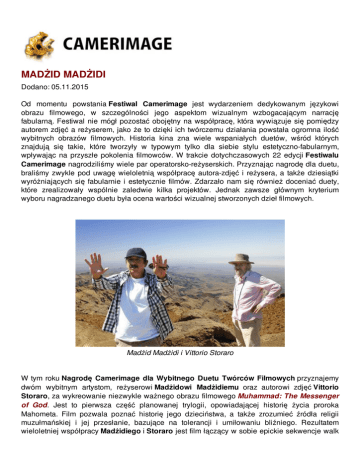 MADŻID MADŻIDI Dodano: 05.11.2015 Od momentu powstania Festiwal Camerimage jest wydarzeniem dedykowanym językowi obrazu filmowego, w szczególności jego aspektom wizualnym wzbogacającym narrację fabularną. Festiwal nie mógł pozostać obojętny na współpracę, która wywiązuje się pomiędzy autorem zdjęć a reżyserem, jako że to dzięki ich twórczemu działania powstała ogromna ilość wybitnych obrazów filmowych. Historia kina zna wiele wspaniałych duetów, wśród których znajdują się takie, które tworzyły w typowym tylko dla siebie stylu estetyczno-fabularnym, wpływając na przyszłe pokolenia filmowców. W trakcie dotychczasowych 22 edycji Festiwalu Camerimage nagrodziliśmy wiele par operatorsko-reżyserskich. Przyznając nagrodę dla duetu, braliśmy zwykle pod uwagę wieloletnią współpracę autora-zdjęć i reżysera, a także dziesiątki wyróżniających się fabularnie i estetycznie filmów. Zdarzało nam się również doceniać duety, które zrealizowały wspólnie zaledwie kilka projektów. Jednak zawsze głównym kryterium wyboru nagradzanego duetu była ocena wartości wizualnej stworzonych dzieł filmowych. Madżid Madżidi i Vittorio Storaro W tym roku Nagrodę Camerimage dla Wybitnego Duetu Twórców Filmowych przyznajemy dwóm wybitnym artystom, reżyserowi Madżidowi Madżidiemu oraz autorowi zdjęć Vittorio Storaro, za wykreowanie niezwykle ważnego obrazu filmowego Muhammad: The Messenger of God. Jest to pierwsza część planowanej trylogii, opowiadającej historię życia proroka Mahometa. Film pozwala poznać historię jego dzieciństwa, a także zrozumieć źródła religii muzułmańskiej i jej przesłanie, bazujące na tolerancji i umiłowaniu bliźniego. Rezultatem wieloletniej współpracy Madżidiego i Storaro jest film łączący w sobie epickie sekwencje walk z kameralnymi scenami zbliżającymi nas do sedna duchowości islamu poprzez pokazanie najważniejszych spraw w życiu bohatera oraz otaczających go ludzi. Plakat z filmu "Muhammad: The Messenger of God" Korzystając z tradycji oraz ikonografii islamu, a także inspirując się Koranem oraz wieloma źródłami historycznymi, Madżidi i Storaro odtworzyli niezwykle sugestywnie piękno i przepych Mekki VI wieku naszej ery. Zrealizowali tętniącą życiem opowieść o umiłowaniu drugiego człowieka, wyrozumiałości i miłości. Muhammad: The Messenger of God jest odważnym i wyrazistym głosem w niezwykle istotnej dziś sprawie. Stajemy bowiem wobec konieczności zrozumienia i znalezienia nici porozumienia z wyznawcami religii muzułmańskiej, która jest dla ludzi cywilizacji Zachodu niezrozumiała i groźna, bo postrzegana najczęściej przez pryzmat zagrożeń jakie niosą działania fundamentalistów religijnych. Film Madżidiego i Storaro pomaga zrozumieć, jak dalece są one odległe od istoty systemu wartości stworzonego przez Mahometa. Muhammad: The Messenger of God powstał nie po to by, dzielić, lecz żeby łączyć. Kadr z filmu "Muhammad: The Messenger of God" W ramach 23. edycji Międzynarodowego Festiwalu Sztuki Autorów Zdjęć Filmowych CAMERIMAGE odbędzie się pierwszy europejski pokaz Muhammad: The Messenger of God. Madżid Madżidi i Vittorio Storaro będą naszymi gośćmi honorowymi i spotkają się po projekcji z festiwalową publicznością. Zapraszamy do Bydgoszczy! ----------------Madżid Madżidi i Vittorio Storaro to legendarne postacie światowego kina. Obaj słyną z umiłowania obrazu filmowego oraz poszukiwań estetycznych. We wszystkich swoich projektach nawiązują dialog z widzami różnych kultur, ras i wyznań, nie zapominając o ogromnej wadze umieszczania swoich opowieści w kontekście historyczno-kulturowym oraz psychologicznym. Wybrana filmografia Madżid Madżidi: Pieśń wróbli, zdj. Tooraj Mansouri, 2008 r. Beed-e majnoon, zdj. Bahram Badakshani, Mahmoud Kalari, 2005 r. Deszcz, zdj. Mohammad Davudi, 2001 r. Kolory raju, zdj. Mohammad Davudi, 1999 r. Dzieci niebios, zdj. Parviz Malekzaade, 1997 r. Ojciec, zdj. Mohsen Zolnavar, 1996 r. Baduk, zdj. Mohammad Dormanesh , 1992 r. Vittorio Storaro: Ja, Don Giovanni, reż. Carlos Saura, 2009 r. Tango, reż. Carlos Saura, 1998 r. Mały Budda, reż. Bernardo Bertolucci, 1993 r. Ostatni cesarz, reż. Bernardo Bertolucci, 1987 r. Czerwoni, reż. Warren Beatty, 1981 r. Czas apokalipsy, reż. Francis Ford Coppola, 1979 r. Konformista, reż. Bernardo Bertolucci, 1970 r.