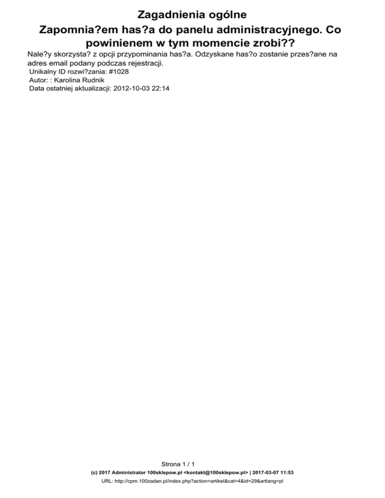 Zagadnienia ogólne Zapomnia?em has?a do panelu administracyjnego. Co powinienem w tym momencie zrobi?? Nale?y skorzysta? z opcji przypominania has?a. Odzyskane has?o zostanie przes?ane na adres email podany podczas rejestracji. Unikalny ID rozwi?zania: #1028 Autor: : Karolina Rudnik Data ostatniej aktualizacji: 2012-10-03 22:14 Strona 1 / 1 (c) 2017 Administrator 100sklepow.pl <[email protected]> | 2017-03-07 11:53 URL: http://cpm.100zadan.pl/index.php?action=artikel&cat=4&id=29&artlang=pl Powered by TCPDF (www.tcpdf.org)