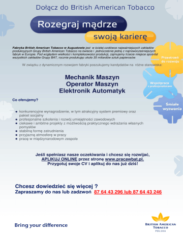 Fabryka British American Tobacco w Augustowie jest w ścisłej czołówce najważniejszych zakładów produkcyjnych Grupy British American Tobacco na świecie i jednocześnie jedną z najnowocześniejszych fabryk w Europie. Pod względem wielkości i kompleksowości produkcji, zajmujemy trzecie miejsce spośród wszystkich zakładów Grupy BAT, rocznie produkując około 35 miliardów sztuk papierosów. W związku z dynamicznym rozwojem fabryki poszukujemy kandydatów na różne stanowiska: Mechanik Maszyn Operator Maszyn Elektronik Automatyk Co oferujemy? konkurencyjne wynagrodzenie, w tym atrakcyjny system premiowy oraz pakiet socjalny profesjonalne szkolenia i rozwój umiejętności zawodowych ciekawe i ambitne projekty z możliwością praktycznego wdrażania własnych pomysłów stabilną formę zatrudnienia przyjazną atmosferę w pracy pracę w międzynarodowym zespole Jeśli spełniasz nasze oczekiwania i chcesz się rozwijać, APLIKUJ ONLINE przez stronę www.pracawbat.pl. Przygotuj swoje CV i aplikuj do nas już dziś! Chcesz dowiedzieć się więcej ? Zapraszamy do nas lub zadzwoń 87 64 43 296 lub 87 64 43 246