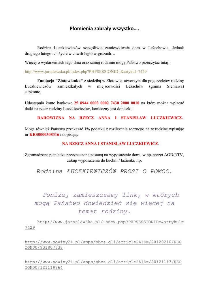 Płomienia zabrały wszystko…. Rodzina Łuczkiewiczów szczęśliwie zamieszkiwała dom w Leżachowie. Jednak drugiego lutego ich życie w chwili legło w gruzach… Więcej o wydarzeniach tego dnia oraz samej rodzinie mogą Państwo przeczytać tutaj: http://www.jaroslawska.pl/index.php?PHPSESSIONID=&artykul=7429 Fundacja "Złotowianka" z siedzibą w Złotowie, utworzyła dla pogorzelców rodziny Łuczkiewiczów zamieszkałych w miejscowości Leżachów (gmina Sieniawa) subkonto. Udostępnia konto bankowe 25 8944 0003 0002 7430 2000 0010 na które można wpłacać datki na rzecz rodziny Łuczkiewiczów, konieczny jest dopisek : DAROWIZNA NA RZECZ ANNA I STANISŁAW ŁUCZKIEWICZ. Mogą również Państwo przekazać 1% podatku z rozliczenia rocznego na tę rodzinę wpisując nr KRS0000308316 i dopisując NA RZECZ ANNA I STANISŁAW ŁUCZKIEWICZ. Zgromadzone pieniądze przeznaczone zostaną na wyposażenie domu w np. sprzęt AGD/RTV, zakup wyposażenia do kuchni / łazienki, itp. Rodzina ŁUCZKIEWICZÓW PROSI O POMOC. Poniżej zamieszczamy link, w których mogą Państwo dowiedzieć się więcej na temat rodziny. http://www.jaroslawska.pl/index.php?PHPSESSIONID=&artykul= 7429 http://www.nowiny24.pl/apps/pbcs.dll/article?AID=/20120210/REG ION00/931807638 http://www.nowiny24.pl/apps/pbcs.dll/article?AID=/20121113/REG ION00/121119864