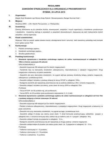 REGULAMIN ZAWODÓW STRZELECKICH DLA ORGANIZACJI PROOBRONNYCH RYBNIK, 25 LIPCA 2015 I. Organizator: Miejski Klub Strzelecki Ligi Obrony Kraju Rybnik i Stowarzyszenie „Ranger Survival Club”. II. Miejsce: Strzelnica MKS – LOK, Rybnik Paruszowiec, ul. Wielopolska. III. Uczestnicy: Zawody skierowane są do członków klubów, stowarzyszeń, związków i innych organizacji o charakterze proobronnym i strzeleckim. Uczestnicy startują w zawodach w zespołach dwuosobowych, dopuszcza się start maksymalnie dwóch zespołów z danej organizacji. IV. Koszt uczestnictwa: Wpisowe 140zł za zespół, opłata zawiera koszty udostępnienia broni i amunicji. Jeśli zawodnicy posiadają swój komplet broni opłata wynosi 70zł. V. VI. Konkurencje: 1. Pistolet centralnego zapłonu. 2. Karabinek centralnego zapłonu. 3. Strzelba gładkolufowa. Przebieg konkurencji: 1. Strzelanie dynamiczne z karabinka centralnego zapłonu do celów rozmieszczonych w odległości 75 do 100m w limicie czasowym 45 sekund. OPIS KONKURENCJI: - Zawodnik dysponuje 10 nabojami po 5 w dwóch magazynkach; - Karabinek leży na stanowisku strzeleckim zabezpieczony, nieprzeładowany z odpiętym magazynkiem. Drugi magazynek w ładownicy na pasie zawodnika. - Zawodnik stoi przy stanowisku strzeleckim, na sygnał zajmuje postawę strzelecką leżącą, podpina magazynek, odbezpiecza i przeładowuje broń. - Zawodnik oddaje 5 strzałów z postawy leżącej do tarczy NT23P w odległości 100m, - Następnie zawodnik jak najszybciej przemieszcza się za zasłonę oddaloną o 25m i zmienia magazynek, - Zawodnik oddaje 5 strzałów zza osłony, przez otwór do tarczy IDPA w odległości 75m. Punktacja: - Tarcza NT23P: do 50 punktów wg. pól punktowych, - Tarcza IDPA: do 25 punktów (pola punktowane odpowiednio: 5, 4 i 2 pkt). 2. Strzelanie dynamiczne z pistoletu centralnego zapłonu do celów rozmieszczonych w odległości od 8 do 15m z postawy stojącej w limicie czasowym 30 sekund. OPIS KONKURENCJI: - Zawodnik dysponuje 10 nabojami po 5 w dwóch magazynkach; - Pistolet w kaburze odbezpieczony, nieprzeładowany z podpiętym magazynkiem. Drugi magazynek w ładownicy na pasie zawodnika. - Zawodnik stoi przy stanowisku strzeleckim, na sygnał wyciąga i przeładowuje broń. - Zawodnik oddaje 2 strzały zza osłony przez otwór, 1 strzał terrorysta przetrzymujący zakładnika odległości 8m) i 1 strzał do terrorysty który odsłoni się po trafieniu celu nr 1 (popper odległości 9m), - Zawodnik oddaje 3 strzały do popperów w odległości 10 m, - Następnie zawodnik przemieszcza się jak najszybciej za drugą zasłonę i zmienia magazynek, - Zawodnik oddaje kolejne 5 strzałów zza osłony przez otwór, do 5 popperów w odległości 10 - 15 m, Punktacja: - Trafienie w terrorystę nr 1: 5 punktów, - Trafienie w terrorystę nr 2: 10 punktów, - Trafienie w zakładnika: -5 punktów, (popper w - Trafienie poppera: 10 punktów. 3. Strzelanie dynamiczne ze strzelby gładkolufowej w limicie czasowym 20 sekund - Zawodnik dysponuje 5 nabojami; - Strzelba leży na stanowisku strzeleckim, zabezpieczona i niezaładowana, naboje wyłożone na stanowisku. - Zawodnik stoi przy stanowisku strzeleckim, na sygnał ładuje 5 naboi do strzelby, a następnie oddaje 2 strzały do popperów w odległości 15m i 3 popperów ustawionych w odległości 10m w dowolnej kolejności. Punktacja: - Trafienie poppera 5 punktów, VII. Punktacja: O zwycięstwie decyduje suma punktów zdobytych przez obydwóch zawodników z danej drużyny. W przypadku uzyskania tej samej liczby punktów przez dwie lub więcej drużyn o zwycięstwie decyduje suma czasów wszystkich strzelań. VIII. Informacje dodatkowe: Dopuszcza się uczestnictwo w zawodach przy użyciu własnej broni i amunicji. Dopuszczone są karabinki centralnego zapłonu pochodzenia wojskowego (z rodziny AK, M16, Vz.58, itp. w kalibrach 5,56 i 7,62mm) wyposażone tylko w mechaniczne przyrządy celownicze, oraz pistolety centralnego zapłonu powszechnie używane przez służby mundurowe w kalibrze 9mm wyposażone tylko w mechaniczne przyrządy celownicze. Dopuszcza się tylko strzelby gładkolufowe w kalibrze 12/76 typu pump-action z mechanicznymi przyrządami celowniczymi. Zawodnikom nie posiadającym własnej broni i amunicji organizator udostępni broń i amunicję odpłatnie. IX. X. XI. Wymagane wyposażenie indywidualne: 1. Ochronniki słuchu. 2. Okulary ochronne. 3. Pas (dopuszcza się używania wszelkiego typu oporządzenia) 4. Kabura (uniwersalna – Glock, P99, Mag) 5. 1 Ładownica na magazynki pistoletowe (uniwersalne) 6. 1 Ładownica na magazynek karabinowy (AK) Nagrody: 1. Puchary za miejsca 1-3, 2. Dyplomy za miejsca 1-6, 3. Nagrody fantowe do rozlosowania pomiędzy wszystkich uczestników – ufundowane przez sponsorów Patronaty i sponsorzy: Patronat Honorowy: Ministerstwo Obrony Narodowej, Patronat Medialny: Broń i Amunicja, Sponsorzy: Kolba.pl, Progres, Red River, Vismag, Hubertech-Lowczy.pl, Tactical-Tools. XII. Zgłoszenia uczestnictwa: Warunkiem uczestnictwa jest zgłoszenie udziału w terminie do dnia 26 czerwca 2015 r. za pośrednictwem poczty elektronicznej na adres [email protected] z jednoczesnym opłaceniem wpisowego na rachunek stowarzyszenia: Ranger Survival Club ul. Jarzębinowa 3, 44-100 Gliwice Bank BGŻ 86 2030 0045 1110 0000 0399 8740 Organizator zastrzega, że wpisowe nie zostanie zwrócone osobom rezygnującym z uczestnictwa w zawodach po 10 lipca. Zgłoszenie musi zawierać imiona i nazwiska zawodników, nazwę i adres organizacji, dane kontaktowe: e-mail, telefon, informację czy zespół posiada własną broń. Ilość miejsce ograniczona, decyduje kolejność zgłoszeń. XIII. Kontakt: e-mail: [email protected], tel. 504 161 095