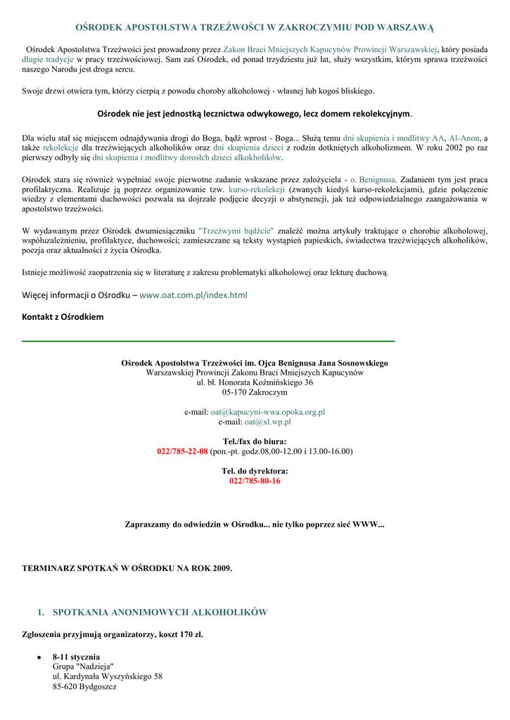 OŚRODEK APOSTOLSTWA TRZEŹWOŚCI W ZAKROCZYMIU POD WARSZAWĄ Ośrodek Apostolstwa Trzeźwości jest prowadzony przez Zakon Braci Mniejszych Kapucynów Prowincji Warszawskiej, który posiada długie tradycje w pracy trzeźwościowej. Sam zaś Ośrodek, od ponad trzydziestu już lat, służy wszystkim, którym sprawa trzeźwości naszego Narodu jest droga sercu. Swoje drzwi otwiera tym, którzy cierpią z powodu choroby alkoholowej - własnej lub kogoś bliskiego. Ośrodek nie jest jednostką lecznictwa odwykowego, lecz domem rekolekcyjnym. Dla wielu stał się miejscem odnajdywania drogi do Boga, bądź wprost - Boga... Służą temu dni skupienia i modlitwy AA, Al-Anon, a także rekolekcje dla trzeźwiejących alkoholików oraz dni skupienia dzieci z rodzin dotkniętych alkoholizmem. W roku 2002 po raz pierwszy odbyły się dni skupienia i modlitwy dorosłch dzieci alkokholików. Ośrodek stara się również wypełniać swoje pierwotne zadanie wskazane przez założyciela - o. Benignusa. Zadaniem tym jest praca profilaktyczna. Realizuje ją poprzez organizowanie tzw. kurso-rekolekcji (zwanych kiedyś kurso-rekolekcjami), gdzie połączenie wiedzy z elementami duchowości pozwala na dojrzałe podjęcie decyzji o abstynencji, jak też odpowiedzialnego zaangażowania w apostolstwo trzeźwości. W wydawanym przez Ośrodek dwumiesiączniku "Trzeźwymi bądźcie" znaleźć można artykuły traktujące o chorobie alkoholowej, współuzależnieniu, profilaktyce, duchowości; zamieszczane są teksty wystąpień papieskich, świadectwa trzeźwiejących alkoholików, poezja oraz aktualności z życia Ośrodka. Istnieje możliwość zaopatrzenia się w literaturę z zakresu problematyki alkoholowej oraz lekturę duchową. Więcej informacji o Ośrodku – www.oat.com.pl/index.html Kontakt z Ośrodkiem Ośrodek Apostolstwa Trzeźwości im. Ojca Benignusa Jana Sosnowskiego Warszawskiej Prowincji Zakonu Braci Mniejszych Kapucynów ul. bł. Honorata Koźmińskiego 36 05-170 Zakroczym e-mail: [email protected] e-mail: [email protected] Tel./fax do biura: 022/785-22-08 (pon.-pt. godz.08.00-12.00 i 13.00-16.00) Tel. do dyrektora: 022/785-80-16 Zapraszamy do odwiedzin w Ośrodku... nie tylko poprzez sieć WWW... TERMINARZ SPOTKAŃ W OŚRODKU NA ROK 2009. 1. SPOTKANIA ANONIMOWYCH ALKOHOLIKÓW Zgłoszenia przyjmują organizatorzy, koszt 170 zł. 8-11 stycznia Grupa "Nadzieja" ul. Kardynała Wyszyńskiego 58 85-620 Bydgoszcz 29 stycznia-1 lutego Grupa AA "Arka" skr. poczt. 60 01-380 Warszawa 27 Leszek - tel. kom. 501439089 email: [email protected] 12-15 lutego Grupa AA "Awanti" ul. Armii Poznań 42 62-031 Luboń k. Poznania 19-22 marca Grupa AA "Barbara" ul. Włocławska 1 Kościół NMP 62-650 Kłodawa 23-26 kwietnia Grupa AA "Zostań z nami" ul. ks. Jana Majdera 19 Kościół p.w. NMP 80-384 Gdańsk-Przymorze 7-10 maja Grupa AA "Echa leśne" ul. Bródnowska 22/12 03-439 Warszawa 21-24 maja Grupa AA "Pod plebanią" ul. Kolorowych domów Kościół p.w. św. Stanisława 70-781 Szczecin - Oś. Bukowe 4-7 czerwca Grupa AA "Jedność" ul. Szosa Bydgoska 1 87-100 Toruń 18-21 czerwca Grupa AA "Tolerancja-Barka" Dąbrówka 9/5 11-130 Orneta 16-19 lipca Grupa AA "Bory Tucholskie" i "Podhale" (spotkania dla uzależnionych i współuzależnionych) ul. Piastowska 25/9 89-501 Tuchola e-mail: [email protected] tel. 601208165 e-mail: [email protected] tel. 509714613 10-13 września Grupa AA "Bez Nazwy" Parafia Matki Bożej Królowej Polski ul. Obrońców krzyża 1 31-831 Kraków - Bieńczyce e-mail: [email protected] http://aa-beznazwy.w.interia.pl 8-11 października Grupa AA "Dobro-Wolność" Rynek Główny Kościół p.w. św. Mikołaja 32-500 Chrzanów 26-29 listopada Grupa AA "Ster" al. Marcinkowskiego 24 61-827 Poznań [email protected] UWAGA - PROŚBA - PRZYPOMNIENIE Zgłoszenia na spotkania osób uzależnionych od alkoholu przyjmują grupy AA będące organizatorami. Niektórzy z organizatorów upoważnili biuro Ośrodka do przyjmowania zgłoszeń. Jednakże co do spotkań, które organizuje Grupa "STER" z Poznania (w tym roku w dniach 26-29 listopada), ze względu na ich wyjątkowość (wieczór wspomnień o o. Benignusie), dużą liczbe chętnych i ograniczoną liczbę miejsc informujemy, że zgłoszenia na spotkania organizownane przez Grupę "STER" przyjmują wyłącznie organizatorzy. Dokonanie przedpłaty bez wcześniejszego zgłoszenia swego przyjazdu organizatorom, nie jest równoznaczne z zarezerwowaniem miejsca. Dla ułatwienia dokonywania zgłoszeń podajemy adres mailowy Grupy "STER": [email protected] 17-20 grudnia Grupa AA "Witaj" Poradnia Leczenia Uzależnień ul. Staszica 18 08-400 Garwolin [email protected] Dni skupienia i modlitwy AA organizowane są przez konkretne grupy. Ojcowie pracujący w Ośrodku zapewniają opiekę duchową (możliwość spowiedzi lub rozmowy). Obok mityng'ów, także program duchowy. Tradycyjnie w sobotę (gdy odbywają się spotkania AA), o godz. 19.30 - uroczysta Msza św., a po niej całonocny meeting (otwarty). Zapraszamy w imieniu organizatorów wszystkich zainteresowanych na sobotni wieczór. Zgłoszenia przyjmują organizatorzy spotkań. Koszt: 170 zł. Przedpłatę (połowa kosztów) należy wpłacić na konto OAT z zanaczeniem terminu spotkania. 2. SPOTKANIA GRUP RODZINNYCH AL - ANON Zgłoszenia przyjmuje biuro OAT także drogą elektroniczną. Koszt: 160 zł. (grupa z Wrocławia 175 zł.) 22-25 stycznia PROWADZI: Grupa olsztyńska 12-15 marca PROWADZI: Grupa gdańska 14-17 maja PROWADZĄ: Grupy z Legionowa 16-20 września (od środy!!) PROWADZI: Grupa "Westalki" z Wrocławia 5-8 listopada PROWADZI: Grupy z Warszawy Spotkania grup rodzinnych Al - Anon organizowane są przez konkretne grupy, zgodnie z Tradycjami Wspólnoty. Pracujący w Ośrodku ojcowie zapewniają opiekę duchową. Jest możliwość wyspowiadania się lub rozmowy z nimi (większość czasu w podczas tego typu spotkań ojcowie poświęcają właśnie tej posłudze). Zgłoszenia przyjmuje biuro OA