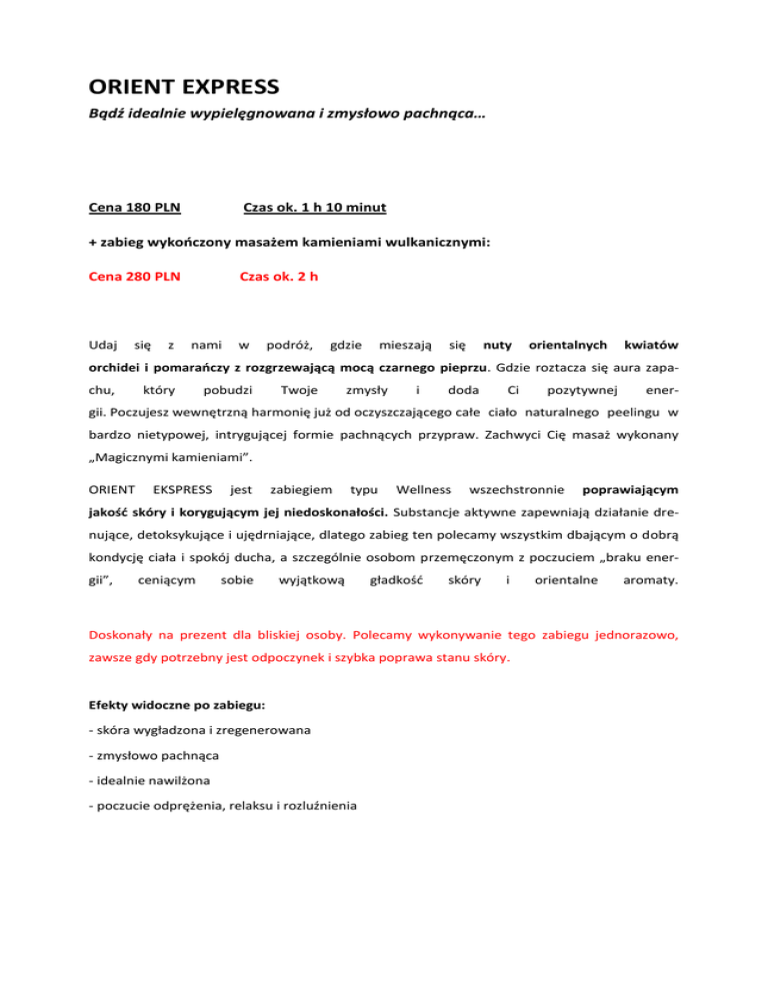 ORIENT EXPRESS Bądź idealnie wypielęgnowana i zmysłowo pachnąca… Cena 180 PLN Czas ok. 1 h 10 minut + zabieg wykooczony masażem kamieniami wulkanicznymi: Cena 280 PLN Udaj się z Czas ok. 2 h nami w podróż, gdzie mieszają się nuty orientalnych kwiatów orchidei i pomaraoczy z rozgrzewającą mocą czarnego pieprzu. Gdzie roztacza się aura zapachu, który pobudzi Twoje zmysły i doda Ci pozytywnej ener- gii. Poczujesz wewnętrzną harmonię już od oczyszczającego całe ciało naturalnego peelingu w bardzo nietypowej, intrygującej formie pachnących przypraw. Zachwyci Cię masaż wykonany „Magicznymi kamieniami”. ORIENT EKSPRESS jest zabiegiem typu Wellness wszechstronnie poprawiającym jakośd skóry i korygującym jej niedoskonałości. Substancje aktywne zapewniają działanie drenujące, detoksykujące i ujędrniające, dlatego zabieg ten polecamy wszystkim dbającym o dobrą kondycję ciała i spokój ducha, a szczególnie osobom przemęczonym z poczuciem „braku energii”, ceniącym sobie wyjątkową gładkośd skóry i orientalne aromaty. Doskonały na prezent dla bliskiej osoby. Polecamy wykonywanie tego zabiegu jednorazowo, zawsze gdy potrzebny jest odpoczynek i szybka poprawa stanu skóry. Efekty widoczne po zabiegu: - skóra wygładzona i zregenerowana - zmysłowo pachnąca - idealnie nawilżona - poczucie odprężenia, relaksu i rozluźnienia