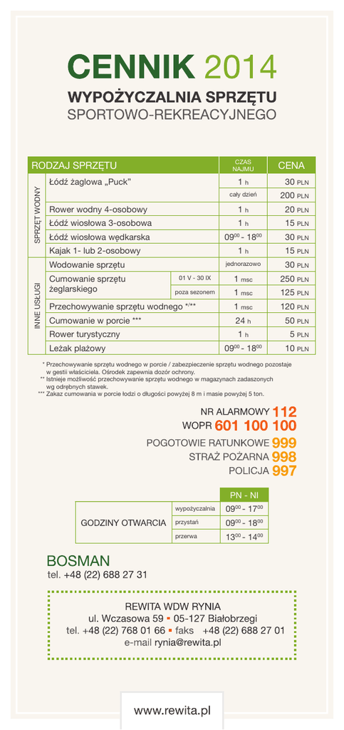 CZAS NAJMU RODZAJ SPRZĘTU SPRZĘT WODNY Łódź żaglowa „Puck” 1h cały dzień 30 PLN 200 PLN Rower wodny 4-osobowy 1h 20 PLN Łódź wiosłowa 3-osobowa 1h 15 PLN Łódź wiosłowa wędkarska 0900 - 1800 30 PLN 1h 15 PLN Kajak 1- lub 2-osobowy Wodowanie sprzętu INNE USŁUGI CENA Cumowanie sprzętu żeglarskiego jednorazowo 30 PLN 01 V - 30 IX 1 msc 250 PLN poza sezonem 1 msc 125 PLN Przechowywanie sprzętu wodnego */** 1 msc 120 PLN Cumowanie w porcie *** 24 h 50 PLN Rower turystyczny 1h 5 PLN 0900 - 1800 10 PLN Leżak plażowy * Przechowywanie sprzętu wodnego w porcie / zabezpieczenie sprzętu wodnego pozostaje w gestii właściciela. Ośrodek zapewnia dozór ochrony. ** Istnieje możliwość przechowywanie sprzętu wodnego w magazynach zadaszonych wg odrębnych stawek. *** Zakaz cumowania w porcie łodzi o długości powyżej 8 m i masie powyżej 5 ton. PN - NI wypożyczalnia 0900 - 1700 przystań 0900 - 1800 przerwa 1300 - 1400 1. Wypożyczalnia sprzętu pływającego czynna jest w okresie maj - wrzesień w godz. od 09:00 do 18:00 (w zależności od warunków pogodowych). 2. Sprzęt wypożyczany jest tylko i wyłącznie Gościom Rewita WDW Rynia oraz innym osobom legitymującym się biletami wstępu na teren ośrodka. 3. Sprzęt pływający mogą wypożyczać osoby, które ukończyły 14 lat i przedłożą bosmanowi do wglądu dowód tożsamości oraz ewentualnie inne wymagane uprawnienia. 4. Za korzystanie ze sprzętu wnosi się opłatę zgodnie z obowiązującym cennikiem. 5. Pełnoletnia osoba dysponująca sprzętem pływającym może zabrać na pokład tylko jedną osobę nieumiejącą pływać pod warunkiem, że pasażer przez cały czas pływania będzie miał założoną kamizelkę ratunkową lub asekuracyjną. 6. W przypadku sprzętu pływającego wieloosobowego, na pokładzie może znajdować się jednocześnie tylu pasażerów, na ilu ten sprzęt został dopuszczony do użytku. Osoby nieumiejące pływać powinny podczas rejsu mieć na sobie kamizelkę ratunkową lub asekuracyjną. 7. Liczebność załogi na jednostce pływającej ustala bosman przystani na podstawie instrukcji sprzętu lub jego aktualnego stanu technicznego. 8. Ilość dodatkowego sprzętu ratunkowego na jednostkę pływającą ustala każdorazowo bosman przystani. 9. Sprzęt może być użytkowany wyłącznie w godzinach pracy przystani po dokonaniu przez bosmana odpowiedniego zapisu z książce portowej. 10. Podczas pływania użytkownik zobowiązany jest posiadać przy sobie wymagane uprawnienia wraz z dowodem tożsamości. 11. Użytkownikom sprzętu zabrania się: kąpieli podczas pływania, wędkowania z wyjątkiem łodzi do tego przeznaczonych, odstępowania sprzętu pływającego innym osobom, zachowania w sposób zagrażający bezpieczeństwu własnemu oraz pasażerów, spożywania alkoholu w czasie dysponowania jednostką pływającą, wykorzystania sprzętu pływającego niezgodnie z jego przeznaczeniem. 12. Użytkownik sprzętu pływającego zobowiązany jest do: przestrzegania przepisów obowiązujących podczas uprawiania żeglugi turystycznej i sportowej, stosowania się do zaleceń bosmana, reagowania na sygnał natychmiastowego powrotu do przystani (ciągłe bicie dzwonu przystani lub inne ustalone przez bosmana sygnały), zaniechania pływania w przypadku stwierdzenia uszkodzenia jednostki w stopniu zagrażającym bezpieczeństwu własnemu oraz pasażerów, opieki nad sprzętem przez cały okres użytkowania, zwrotu sprzętu w takim stanie w jakim został pobrany z przystani. 13. Za zniszczenie, braki i uszkodzenia wynikłe na skutek niewłaściwej eksploatacji, materialną odpowiedzialność ponosi użytkownik. 14. Przebywanie jednostek obcych na terenie portu Rewita WDW Rynia dozwolone jest po uprzednim zgłoszeniu u bosmana (nie dotyczy akcji ratowniczych). Cumowanie jednostek tylko i wyłącznie po rejestracji i opłacie portowej u bosmana. 15. Rewita WDW Rynia nie ponosi odpowiedzialności za sprzęt pozostawiony lub cumujący w porcie bez zgłoszenia u bosmana.