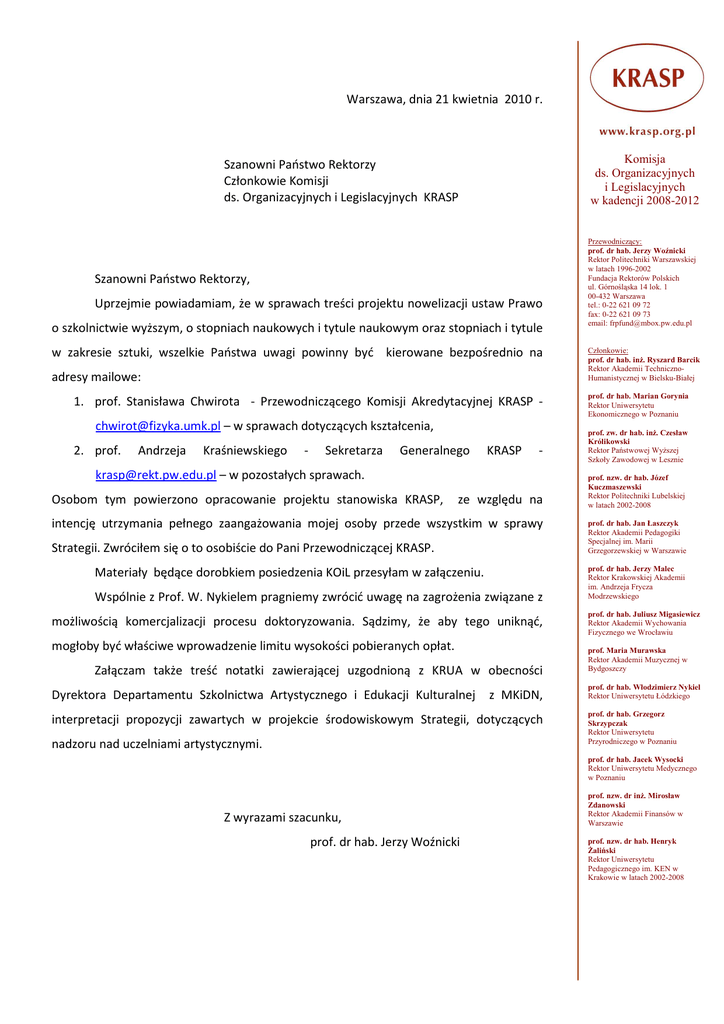 Warszawa, dnia 21 kwietnia 2010 r. Komisja ds. Organizacyjnych i Legislacyjnych w kadencji 2008-2012 Szanowni Państwo Rektorzy Członkowie Komisji ds. Organizacyjnych i Legislacyjnych KRASP Szanowni Państwo Rektorzy, Uprzejmie powiadamiam, że w sprawach treści projektu nowelizacji ustaw Prawo o szkolnictwie wyższym, o stopniach naukowych i tytule naukowym oraz stopniach i tytule w zakresie sztuki, wszelkie Państwa uwagi powinny być kierowane bezpośrednio na adresy mailowe: 1. prof. Stanisława Chwirota - Przewodniczącego Komisji Akredytacyjnej KRASP [email protected] – w sprawach dotyczących kształcenia, 2. prof. Andrzeja Kraśniewskiego - Sekretarza Generalnego KRASP - [email protected] – w pozostałych sprawach. Osobom tym powierzono opracowanie projektu stanowiska KRASP, ze względu na intencję utrzymania pełnego zaangażowania mojej osoby przede wszystkim w sprawy Strategii. Zwróciłem się o to osobiście do Pani Przewodniczącej KRASP. Materiały będące dorobkiem posiedzenia KOiL przesyłam w załączeniu. Wspólnie z Prof. W. Nykielem pragniemy zwrócić uwagę na zagrożenia związane z możliwością komercjalizacji procesu doktoryzowania. Sądzimy, że aby tego uniknąć, mogłoby być właściwe wprowadzenie limitu wysokości pobieranych opłat. Załączam także treść notatki zawierającej uzgodnioną z KRUA w obecności Dyrektora Departamentu Szkolnictwa Artystycznego i Edukacji Kulturalnej z MKiDN, interpretacji propozycji zawartych w projekcie środowiskowym Strategii, dotyczących nadzoru nad uczelniami artystycznymi. Przewodniczący: prof. dr hab. Jerzy Woźnicki Rektor Politechniki Warszawskiej w latach 1996-2002 Fundacja Rektorów Polskich ul. Górnośląska 14 lok. 1 00-432 Warszawa tel.: 0-22 621 09 72 fax: 0-22 621 09 73 email: [email protected] Członkowie: prof. dr hab. inż. Ryszard Barcik Rektor Akademii TechnicznoHumanistycznej w Bielsku-Białej prof. dr hab. Marian Gorynia Rektor Uniwersytetu Ekonomicznego w Poznaniu prof. zw. dr hab. inż. Czesław Królikowski Rektor Państwowej Wyższej Szkoły Zawodowej w Lesznie prof. nzw. dr hab. Józef Kuczmaszewski Rektor Politechniki Lubelskiej w latach 2002-2008 prof. dr hab. Jan Łaszczyk Rektor Akademii Pedagogiki Specjalnej im. Marii Grzegorzewskiej w Warszawie prof. dr hab. Jerzy Malec Rektor Krakowskiej Akademii im. Andrzeja Frycza Modrzewskiego prof. dr hab. Juliusz Migasiewicz Rektor Akademii Wychowania Fizycznego we Wrocławiu prof. Maria Murawska Rektor Akademii Muzycznej w Bydgoszczy prof. dr hab. Włodzimierz Nykiel Rektor Uniwersytetu Łódzkiego prof. dr hab. Grzegorz Skrzypczak Rektor Uniwersytetu Przyrodniczego w Poznaniu prof. dr hab. Jacek Wysocki Rektor Uniwersytetu Medycznego w Poznaniu Z wyrazami szacunku, prof. dr hab. Jerzy Woźnicki prof. nzw. dr inż. Mirosław Zdanowski Rektor Akademii Finansów w Warszawie prof. nzw. dr hab. Henryk Żaliński Rektor Uniwersytetu Pedagogicznego im. KEN w Krakowie w latach 2002-2008 Komisja ds. Organizacyjnych i Legislacyjnych w kadencji 2008-2012 Przewodniczący: prof. dr hab. Jerzy Woźnicki Rektor Politechniki Warszawskiej w latach 1996-2002 Fundacja Rektorów Polskich ul. Górnośląska 14 lok. 1 00-432 Warszawa tel.: 0-22 621 09 72 fax: 0-22 621 09 73 email: [email protected] Członkowie: prof. dr hab. inż. Ryszard Barcik Rektor Akademii TechnicznoHumanistycznej w Bielsku-Białej prof. dr hab. Marian Gorynia Rektor Uniwersytetu Ekonomicznego w Poznaniu prof. zw. dr hab. inż. Czesław Królikowski Rektor Państwowej Wyższej Szkoły Zawodowej w Lesznie prof. nzw. dr hab. Józef Kuczmaszewski Rektor Politechniki Lubelskiej w latach 2002-2008 prof. dr hab. Jan Łaszczyk Rektor Akademii Pedagogiki Specjalnej im. Marii Grzegorzewskiej w Warszawie prof. dr hab. Jerzy Malec Rektor Krakowskiej Akademii im. Andrzeja Frycza Modrzewskiego prof. dr hab. Juliusz Migasiewicz Rektor Akademii Wychowania Fizycznego we Wrocławiu prof. Maria Murawska Rektor Akademii Muzycznej w Bydgoszczy prof. dr hab. Włodzimierz Nykiel Rektor Uniwersytetu Łódzkiego prof. dr hab. Grzegorz Skrzypczak Rektor Uniwersytetu Przyrodniczego w Poznaniu prof. dr hab. Jacek Wysocki Rektor Uniwersytetu Medycznego w Poznaniu prof. nzw. dr inż. Mirosław Zdanowski Rektor Akademii Finansów w Warszawie prof. nzw. dr hab. Henryk Żaliński Rektor Uniwersytetu Pedagogicznego im. KEN w Krakowie w latach 2002-2008