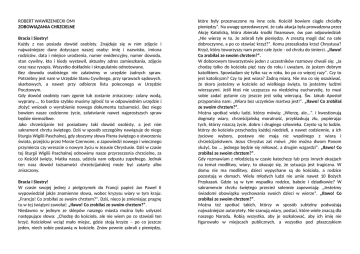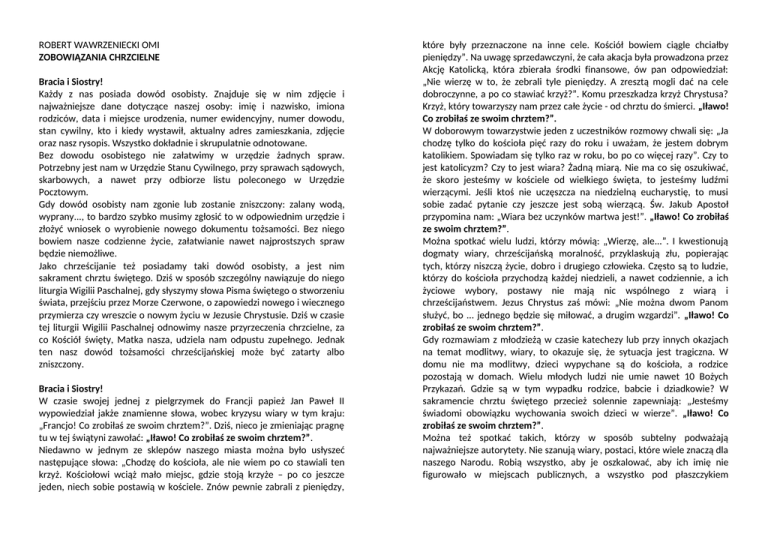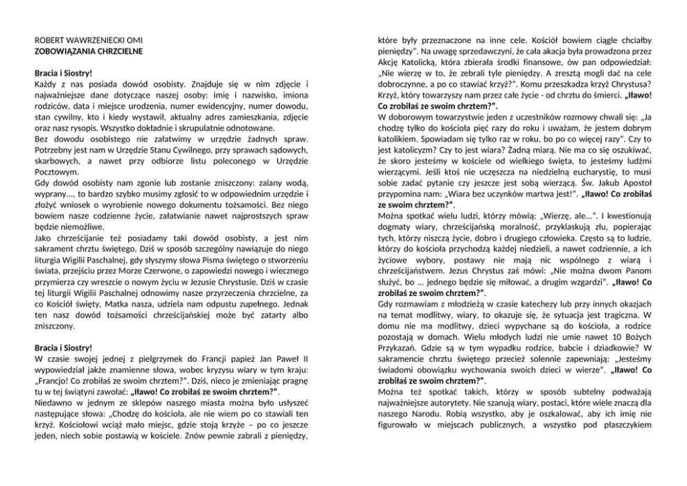 ROBERT WAWRZENIECKI OMI ZOBOWIĄZANIA CHRZCIELNE Bracia i Siostry! Każdy z nas posiada dowód osobisty. Znajduje się w nim zdjęcie i najważniejsze dane dotyczące naszej osoby: imię i nazwisko, imiona rodziców, data i miejsce urodzenia, numer ewidencyjny, numer dowodu, stan cywilny, kto i kiedy wystawił, aktualny adres zamieszkania, zdjęcie oraz nasz rysopis. Wszystko dokładnie i skrupulatnie odnotowane. Bez dowodu osobistego nie załatwimy w urzędzie żadnych spraw. Potrzebny jest nam w Urzędzie Stanu Cywilnego, przy sprawach sądowych, skarbowych, a nawet przy odbiorze listu poleconego w Urzędzie Pocztowym. Gdy dowód osobisty nam zgonie lub zostanie zniszczony: zalany wodą, wyprany..., to bardzo szybko musimy zgłosić to w odpowiednim urzędzie i złożyć wniosek o wyrobienie nowego dokumentu tożsamości. Bez niego bowiem nasze codzienne życie, załatwianie nawet najprostszych spraw będzie niemożliwe. Jako chrześcijanie też posiadamy taki dowód osobisty, a jest nim sakrament chrztu świętego. Dziś w sposób szczególny nawiązuje do niego liturgia Wigilii Paschalnej, gdy słyszymy słowa Pisma świętego o stworzeniu świata, przejściu przez Morze Czerwone, o zapowiedzi nowego i wiecznego przymierza czy wreszcie o nowym życiu w Jezusie Chrystusie. Dziś w czasie tej liturgii Wigilii Paschalnej odnowimy nasze przyrzeczenia chrzcielne, za co Kościół święty, Matka nasza, udziela nam odpustu zupełnego. Jednak ten nasz dowód tożsamości chrześcijańskiej może być zatarty albo zniszczony. Bracia i Siostry! W czasie swojej jednej z pielgrzymek do Francji papież Jan Paweł II wypowiedział jakże znamienne słowa, wobec kryzysu wiary w tym kraju: „Francjo! Co zrobiłaś ze swoim chrztem?”. Dziś, nieco je zmieniając pragnę tu w tej świątyni zawołać: „Iławo! Co zrobiłaś ze swoim chrztem?”. Niedawno w jednym ze sklepów naszego miasta można było usłyszeć następujące słowa: „Chodzę do kościoła, ale nie wiem po co stawiali ten krzyż. Kościołowi wciąż mało miejsc, gdzie stoją krzyże – po co jeszcze jeden, niech sobie postawią w kościele. Znów pewnie zabrali z pieniędzy, które były przeznaczone na inne cele. Kościół bowiem ciągle chciałby pieniędzy”. Na uwagę sprzedawczyni, że cała akacja była prowadzona przez Akcję Katolicką, która zbierała środki finansowe, ów pan odpowiedział: „Nie wierzę w to, że zebrali tyle pieniędzy. A zresztą mogli dać na cele dobroczynne, a po co stawiać krzyż?”. Komu przeszkadza krzyż Chrystusa? Krzyż, który towarzyszy nam przez całe życie - od chrztu do śmierci. „Iławo! Co zrobiłaś ze swoim chrztem?”. W doborowym towarzystwie jeden z uczestników rozmowy chwali się: „Ja chodzę tylko do kościoła pięć razy do roku i uważam, że jestem dobrym katolikiem. Spowiadam się tylko raz w roku, bo po co więcej razy”. Czy to jest katolicyzm? Czy to jest wiara? Żadną miarą. Nie ma co się oszukiwać, że skoro jesteśmy w kościele od wielkiego święta, to jesteśmy ludźmi wierzącymi. Jeśli ktoś nie uczęszcza na niedzielną eucharystię, to musi sobie zadać pytanie czy jeszcze jest sobą wierzącą. Św. Jakub Apostoł przypomina nam: „Wiara bez uczynków martwa jest!”. „Iławo! Co zrobiłaś ze swoim chrztem?”. Można spotkać wielu ludzi, którzy mówią: „Wierzę, ale...”. I kwestionują dogmaty wiary, chrześcijańską moralność, przyklaskują złu, popierając tych, którzy niszczą życie, dobro i drugiego człowieka. Często są to ludzie, którzy do kościoła przychodzą każdej niedzieli, a nawet codziennie, a ich życiowe wybory, postawy nie mają nic wspólnego z wiarą i chrześcijaństwem. Jezus Chrystus zaś mówi: „Nie można dwom Panom służyć, bo ... jednego będzie się miłować, a drugim wzgardzi”. „Iławo! Co zrobiłaś ze swoim chrztem?”. Gdy rozmawiam z młodzieżą w czasie katechezy lub przy innych okazjach na temat modlitwy, wiary, to okazuje się, że sytuacja jest tragiczna. W domu nie ma modlitwy, dzieci wypychane są do kościoła, a rodzice pozostają w domach. Wielu młodych ludzi nie umie nawet 10 Bożych Przykazań. Gdzie są w tym wypadku rodzice, babcie i dziadkowie? W sakramencie chrztu świętego przecież solennie zapewniają: „Jesteśmy świadomi obowiązku wychowania swoich dzieci w wierze”. „Iławo! Co zrobiłaś ze swoim chrztem?”. Można też spotkać takich, którzy w sposób subtelny podważają najważniejsze autorytety. Nie szanują wiary, postaci, które wiele znaczą dla naszego Narodu. Robią wszystko, aby je oszkalować, aby ich imię nie figurowało w miejscach publicznych, a wszystko pod płaszczykiem zatroskania o sprawy wiary i szacunek dla autorytetów. „Iławo! Co zrobiłaś ze swoim chrztem?”. Są też tacy, którzy nie tylko bezlitośnie uciskają drugiego człowieka, a potem przychodzą, jakby nic się nie stało modlić się do świątyni. Ale są i tacy, którzy w tym zaślepieniu dobrami materialnymi, przychodząc do kościoła poświęcić pokarmy wielkanocne myślą, że spełnili swój obowiązek wobec Boga, a w życiu codziennym utrudniają nawet udział w praktykach religijnych: Mszach świętych, rekolekcjach, jak to miało miejsce w niektórych zakładach pracy w czasie rekolekcji szkolnych dla młodzieży: „Rekolekcje nie są przecież obowiązkowe” – powiedział jednej z pracodawców nie chcąc zwolnić ucznia, aby mógł w rekolekcjach uczestniczyć. „Iławo! Co zrobiłaś ze swoim chrztem?”. A ileż to razy w Iławie, począwszy od władz na każdym z nas skończywszy, doprowadza się do deprawacji dzieci i młodzieży. W jakżeż wielu wypadkach przymyka się oko na to, na co nie powinno się go przymykać: alkoholizm, narkomanię i pornografię. Sieje się w ten sposób zgorszenie wśród tych najmniejszych. Jezus zaś mówi: „Lepiej takiemu, aby przywiązał sobie kamień młyński do szyi i rzucił się w morze n
