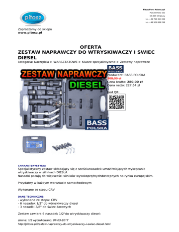 PitoszPiotr Adamczyk Pszczelińska 102 05-805 Otrębusy tel. +48 790 354 038 tel. +48 501 858 218 Zapraszamy do sklepu www.pitosz.pl OFERTA ZESTAW NAPRAWCZY DO WTRYSKIWACZY I SWIEC DIESEL kategoria: Narzędzia > WARSZTATOWE > Klucze specjalistyczne > Zestawy naprawcze Producent: BASS POLSKA 308,00 zł Cena brutto: 280,00 zł Cena netto: 227,64 zł Kod QR: CHARAKTERYSTYKA: Specjalistyczny zestaw składający się z sześciunasadek umożliwiających wykręcanie wtryskiwaczy w silnikach DIESLA. Nasadki pasują do większości silników wysokoprężnychdostępnych na rynku europejskim. Przydatny w każdym warsztacie samochodowym Wykonane ze stopu CRV DANE TECHNICZNE: - wykonane ze stopu: CRV - 6 nasadek 1/2" do wtryskiwaczy diesel - 3 nasadki 3/8" do świec żarowych Zestaw zawiera 6 nasadek 1/2"do wtryskiwaczy diesel: strona: 1/2 wydrukowano: 07-03-2017 http://pitosz.pl/zestaw-naprawczy-do-wtryskiwaczy-i-swiec-diesel.html - 21x90mm (12-kątna) - 22x78mm (12-kątna) - 22x110mm (6-kątna) - 27x78mm (12-kątna) - 28x78mm (12-kątna) - 28x83mm (6-kątna) oraz 3 nasadki 3/8" do świec żarowych: - 8mm, 10mm, 12mm WYPOSAŻENIE PODSTAWOWE: Zestaw zawiera 6 nasadek strona: 2/2 wydrukowano: 07-03-2017 http://pitosz.pl/zestaw-naprawczy-do-wtryskiwaczy-i-swiec-diesel.html