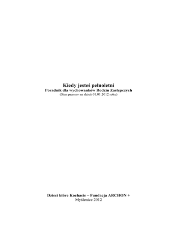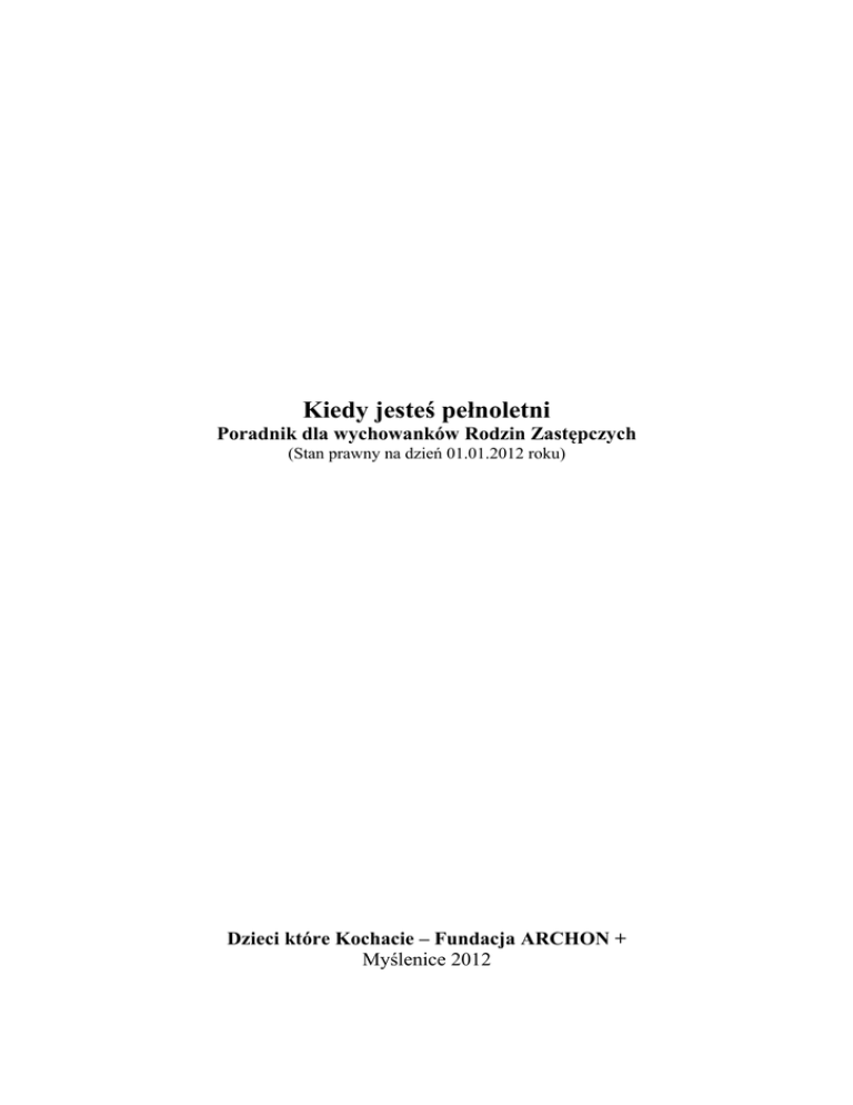 Kiedy jesteś pełnoletni Poradnik dla wychowanków Rodzin Zastępczych (Stan prawny na dzień 01.01.2012 roku) Dzieci które Kochacie – Fundacja ARCHON + Myślenice 2012 Wydanie i Redakcja: Dzieci Które Kochacie – Fundacja ARCHON+ ul. Słowackiego 86 32-400 Myślenice tel. 12 350 59 08 fax. 12 372 19 09 e-mail: [email protected] www.rodzinazastepcza.org Opracowanie poradnika: Grażyna Starzyńska Stan prawny na dzień 01.01.2012 r. EGZEMPLARZ BEZPŁATNY. NIE NA SPRZEDAŻ. © Copyright by Fundacja ARCHON+ Wykorzystanie fragmentu lub całości publikacji możliwe wyłącznie za zgodą wydawcy. KIEDY JESTEŚ PEŁNOLETNI SPIS TREŚCI 1. Wstęp........................................................................................................................... 4 2. Usamodzielnienie – definicja....................................................................................... 4 3. Podstawowe akty prawne............................................................................................. 4 4. Pełnoletni wychowanek w rodzinie zastępczej............................................................ 5 5. Procedura usamodzielnienia........................................................................................ 5 5.1. Opiekun usamodzielnienia i jego zadania.......................................................... 6 5.2. Indywidualny program usamodzielnienia.......................................................... 6 6. Warunki otrzymania pomocy pieniężnej..................................................................... 7 7. Rodzaje pomocy na usamodzielnienie......................................................................... 9 7.1. Pomoc pieniężna na kontynuowanie nauki........................................................ 9 7.2. Pomoc pieniężna na usamodzielnienie............................................................... 10 7.3. Pomoc pieniężna na zagospodarowanie............................................................. 11 7.4. Pomoc w uzyskaniu odpowiednich warunków mieszkaniowych...................... 12 7.5. Pomoc w uzyskaniu zatrudnienia....................................................................... 12 8. Odmowa przyznania pomocy....................................................................................... 12 9. Zawieszenie udzielania pomocy pieniężnej................................................................. 13 10. Kompetencje Powiatu.................................................................................................. 13 11. Dokumenty wymagane przy składaniu wniosku i IPU................................................ 13 12. Załączniki..................................................................................................................... 15 12.1. Wniosek o przyznanie pomocy na kontynuowanie nauki.................................. 15 12.2. Indywidualny program usamodzielnienia.......................................................... 16 3 KIEDY JESTEŚ PEŁNOLETNI 1. WSTĘP Niniejszy poradnik jest adresowany do wychowanków rodzin zastępczych, którzy przebywając w pieczy zastępczej osiągają pełnoletność i będą podlegać procesowi usamodzielnienia oraz do ich opiekunów. Zawiera podstawowe informacje dotyczące przebiegu procesu usamodzielnienia. Poradnik omawia procedurę usamodzielnienia, wskazuje komu i w jakim zakresie przysługuje pomoc, jakie są jej rodzaje. Przedstawia sposób przygotowania indywidualnego programu usamodzielnienia, rolę opiekuna usamodzielnienia oraz zadania Powiatowego Centrum Pomocy Rodzinie. 2. USAMODZIELNIENIE - DEFINICJA Osoba, która osiągnęła pełnoletność przebywając w rodzinie zastępczej zostaje objęta pomocą mającą na celu podjęcie przez nią samodzielnego, dojrzałego życia w integracji ze środowiskiem – rozpoczyna długotrwały proces wychowawczy określany jako usamodzielnienie. W procesie usamodzielnienia uczestniczą: - pełnoletni wychowanek, - rodzina zastępcza, - opiekun usamodzielnienia, - pracownicy Powiatowego Centrum Pomocy Rodzinie, - inni (asystent rodziny, pracownik socjalny GOPS/OPS, doradca zawodowy). 3. PODSTAWOWE AKTY PRAWNE Problematyka usamodzielnienia wychowanków, którzy osiągnęli pełnoletność, przebywając w rodzinie zastępczej uregulowana jest w: 1. Ustawie z dnia 9 czerwca 2011r, o wspieraniu rodziny i systemie pieczy zastępczej( Dz. U. z dnia 21 lipca 2011 r.) 2. Rozporządzeniu Ministra Pracy i Polityki Społecznej z dnia 3 sierpnia 2012 r. w sprawie udzielania pomocy na usamodzielnienie, kontynuowanie nauki i zagospodarowanie ( Dz. U. z 3 sierpnia 2012 r. ) 4 KIEDY JESTEŚ PEŁNOLETNI 4. PEŁNOLETNI WYCHOWANEK W RODZINIE ZASTEPCZEJ Zgodnie z Ustawą z dnia 9 czerwca 2011 r. o wspieraniu rodziny i systemie pieczy zastępczej, objęcie dziecka jedną z form opieki zastępczej następuje na okres nie dłuższy niż do osiągnięcia pełnoletności. Art. 37 ust.2 daje możliwość pozostawania w dotychczasowym systemie pieczy zastępczej osobie, która osiągnęła pełnoletność, za zgodą rodziny zastępczej nie dłużej niż do ukończenia 25 roku życia, jeżeli: − uczy się w szkole, u pracodawcy w celu przygotowania zawodowego, w zakładzie kształcenia nauczycieli lub studiuje, − legitymuje się orzeczeniem o znacznym lub umiarkowanym stopniu niepełnosprawności i uczy się w szkole,zakładzie kształcenia nauczycieli, studiuje, uczy się na kursach , jeśli ich ukończenie jest zgodne z IPU lub u pracodawcy w celu przygotowania zawodowego Jeżeli wychowanek po osiągnięciu pełnoletności pozostaje w rodzinie zastępczej, rodzinie tej przysługuje świadczenie, które otrzymywała dotychczas. Pobieranie przez rodzinę zastępczą świadczenia wyklucza jednoczesne przyznanie mu pomocy na kontynuowanie nauki. Pełnoletni wychowanek w porozumieniu z rodziną zastępczą musi zdecydować czy rodzina zastępcza będzie pobierać pomoc pieniężną do czasu ukończenia przez