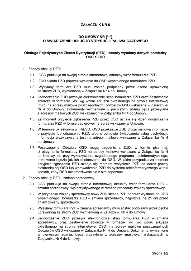ZAŁĄCZNIK NR 6 DO UMOWY NR [***] O ŚWIADCZENIE USŁUG DYSTRYBUCJI PALIWA GAZOWEGO Obsługa Pojedynczych Zleceń Dystrybucji (PZD) i zasady wymiany danych pomiędzy OSD a ZUD 1 Zasady obsługi PZD: 1.1 OSD publikuje na swojej stronie internetowej aktualny wzór formularza PZD. 1.2 ZUD składa PZD poprzez wysłanie do OSD wypełnionego formularza PZD. 1.3 Wysyłany formularz PZD musi zostać podpisany przez osobę uprawnioną ze strony ZUD, wymienioną w Załączniku Nr 4 do Umowy. 1.4 Jednocześnie ZUD przesyła elektronicznie skan formularza PZD oraz Zestawienie zbiorcze w formacie .xls (wg wzoru arkusza określonego na stronie internetowej OSD) na adresy mailowe poszczególnych Oddziałów OSD wskazane w Załączniku Nr 4 do Umowy. Dokumenty wymienione w pierwszym zdaniu będą przesyłane z adresów mailowych ZUD wskazanych w Załączniku Nr 4 do Umowy. 1.5 Za moment przyjęcia zgłoszenia PZD przez OSD uznaje się dzień dostarczenia formularza PZD w formie papierowej na adres wskazany w Umowie. 1.6 W terminie określonym w IRiESD, OSD przekazuje ZUD drogą mailową informację o przyjęciu lub odrzuceniu PZD, albo o odmowie świadczenia usług dystrybucji. Informacja przekazywana jest na adresy mailowe wskazane w Załączniku Nr 4 do Umowy. 1.7 Poszczególne Oddziały OSD mogą uzgodnić z ZUD, w formie pisemnej, iż otrzymanie formularzy PZD na adresy mailowe wskazane w Załączniku Nr 4 do Umowy lub przy wykorzystaniu uzgodnionego programu teleinformatycznego, traktowane będzie jak ich dostarczenie do OSD. W takim przypadku za moment przyjęcia zgłoszenia PZD uznaje się moment wpłynięcia PZD na adres poczty elektronicznej OSD lub wprowadzenie PZD do systemu teleinformatycznego w taki sposób, żeby OSD miał możliwość się z nim zapoznać. 2 Zasady obsługi PZD - zmiana sprzedawcy. 2.1 OSD publikuje na swojej stronie internetowej aktualny wzór formularza PZD – zmiana sprzedawcy, wykorzystywanego w ramach procedury zmiany sprzedawcy. 2.2 W przypadku zmiany sprzedawcy nowy ZUD składa PZD poprzez wysłanie do OSD wypełnionego formularza PZD – zmiana sprzedawcy, najpóźniej na 21 dni przed dniem zmiany sprzedawcy. 2.3 Wysyłany formularz PZD – zmiana sprzedawcy musi zostać podpisany przez osobę uprawnioną ze strony ZUD wymienioną w Załączniku Nr 4 do Umowy. 2.4 Jednocześnie ZUD przesyła elektronicznie skan formularza PZD – zmiana sprzedawcy, oraz Zestawienie zbiorcze w formacie .xls (wg wzoru arkusza określonego na stronie internetowej OSD) na adresy mailowe poszczególnych Oddziałów OSD wskazane w Załączniku Nr 4 do Umowy. Dokumenty wymienione w pierwszym zdaniu, będą przesyłane z adresów mailowych wskazanych w Załączniku Nr 4 do Umowy. Strona 1/2 2.5 Za moment przyjęcia zgłoszenia PZD – zmiana sprzedawcy przez OSD uznaje się dzień dostarczenia formularza PZD – zmiana sprzedawcy w formie papierowej na adres wskazany w Umowie. 2.6 W terminie określonym w IRiESD, OSD przekazuje ZUD drogą mailową informację o przyjęciu lub odrzuceniu PZD – zmiana sprzedawcy, albo o odmowie świadczenia usług dystrybucji. Informacja przekazywana jest na adresy mailowe wskazane w Załączniku nr 4 do Umowy. 2.7 Poszczególne Oddziały OSD mogą uzgodnić z ZUD, w formie pisemnej, iż otrzymanie określonych rodzajów dokumentów PZD – zmiana sprzedawcy na adresy mailowe wskazane w Załączniku Nr 4 do Umowy lub przy wykorzystaniu uzgodnionego systemu teleinformatycznego, traktowane będzie jak ich dostarczenie do OSD. W takim przypadku za moment przyjęcia zgłoszenia PZD uznaje się moment wpłynięcia PZD – zmiana sprzedawcy na adres poczty elektronicznej OSD lub wprowadzenie PZD do systemu teleinformatycznego w taki sposób, że OSD miał możliwość się z nim zapoznać. 3 Zasady wymiany danych pomiędzy OSD i ZUD w postaci komunikatów elektronicznych: 3.1 W przypadku istnienia możliwości technicznych wymiana danych pomiędzy OSD i ZUD może odbywać się w drodze wymiany ustandaryzowanych komunikatów elektronicznych. Możliwość wymiany danych w drodze elektronicznej jest uwarunkowania przedłożeniem przez ZUD oświadczenia wyrażającego zgodę na taki sposób ich przekazywania. Niezależnie od powyższego Strony ustalają, że po dokonaniu przez OSD niezbędnych zmian w systemie informatycznym OSD, wymiana danych pomiędzy Stronami odbywać się będzie w drodze elektronicznej, w oparciu o standard EDIFACT. W tym celu Strony dokonają niezbędnych zmian postanowień niniejszego Załącznika Nr 6 do Umowy, lub też zasady wymiany danych w oparciu o standard EDIFACT zostaną uzgodnione pomiędzy Stronami w inny sposób. 3.2 Sposób wymiany danych i standardy komunikatów elektronicznych przyjętych do prowadzenia wymiany określi OSD. Dokument opisujący sposób wymiany danych i standardy przyjętych komunikatów elektronicznych zostanie opublikowany na stronie OSD lub Oddziału OSD, którego będzie dotyczyć możliwość elektronicznej wymiany danych. 3.3 Późniejsze zmiany w dokumencie, o którym mowa w punkcie 3.2 publikowane będą na stronie OSD lub Oddziału OSD przynajmniej z 3-miesięcznym wyprzedzeniem przed ich przyjęciem do stosowania. 3.4 Zmiany sposobu wymiany danych i stosowanych standardów komunikatów elektronicznych nie stanowią zmiany umowy i nie wymagają zmiany treści umowy bądź jej załączników. 3.5 Poszczególne Odziały OSD mogą stosować również inne sposoby i komunikaty elektronicznej wymiany danych z ZUD niż opisane w dokumencie, o którym mowa w punkcie 3.2, jeżeli zostaną one uzgodnione pomiędzy Odziałem OSD i ZUD. Strona 2/2
