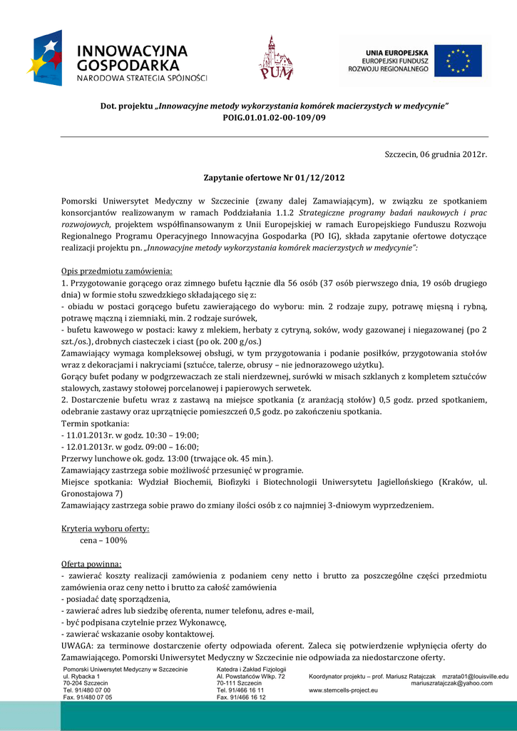 Dot. projektu „Innowacyjne metody wykorzystania komórek macierzystych w medycynie” POIG.01.01.02-00-109/09 Szczecin, 06 grudnia 2012r. Zapytanie ofertowe Nr 01/12/2012 Pomorski Uniwersytet Medyczny w Szczecinie (zwany dalej Zamawiającym), w związku ze spotkaniem konsorcjantów realizowanym w ramach Poddziałania 1.1.2 Strategiczne programy badań naukowych i prac rozwojowych, projektem współfinansowanym z Unii Europejskiej w ramach Europejskiego Funduszu Rozwoju Regionalnego Programu Operacyjnego Innowacyjna Gospodarka (PO IG), składa zapytanie ofertowe dotyczące realizacji projektu pn. „Innowacyjne metody wykorzystania komórek macierzystych w medycynie”: Opis przedmiotu zamówienia: 1. Przygotowanie gorącego oraz zimnego bufetu łącznie dla 56 osób (37 osób pierwszego dnia, 19 osób drugiego dnia) w formie stołu szwedzkiego składającego się z: - obiadu w postaci gorącego bufetu zawierającego do wyboru: min. 2 rodzaje zupy, potrawę mięsną i rybną, potrawę mączną i ziemniaki, min. 2 rodzaje surówek, - bufetu kawowego w postaci: kawy z mlekiem, herbaty z cytryną, soków, wody gazowanej i niegazowanej (po 2 szt./os.), drobnych ciasteczek i ciast (po ok. 200 g/os.) Zamawiający wymaga kompleksowej obsługi, w tym przygotowania i podanie posiłków, przygotowania stołów wraz z dekoracjami i nakryciami (sztućce, talerze, obrusy – nie jednorazowego użytku). Gorący bufet podany w podgrzewaczach ze stali nierdzewnej, surówki w misach szklanych z kompletem sztućców stalowych, zastawy stołowej porcelanowej i papierowych serwetek. 2. Dostarczenie bufetu wraz z zastawą na miejsce spotkania (z aranżacją stołów) 0,5 godz. przed spotkaniem, odebranie zastawy oraz uprzątnięcie pomieszczeń 0,5 godz. po zakończeniu spotkania. Termin spotkania: - 11.01.2013r. w godz. 10:30 – 19:00; - 12.01.2013r. w godz. 09:00 – 16:00; Przerwy lunchowe ok. godz. 13:00 (trwające ok. 45 min.). Zamawiający zastrzega sobie możliwość przesunięć w programie. Miejsce spotkania: Wydział Biochemii, Biofizyki i Biotechnologii Uniwersytetu Jagiellońskiego (Kraków, ul. Gronostajowa 7) Zamawiający zastrzega sobie prawo do zmiany ilości osób z co najmniej 3-dniowym wyprzedzeniem. Kryteria wyboru oferty: cena – 100% Oferta powinna: - zawierać koszty realizacji zamówienia z podaniem ceny netto i brutto za poszczególne części przedmiotu zamówienia oraz ceny netto i brutto za całość zamówienia - posiadać datę sporządzenia, - zawierać adres lub siedzibę oferenta, numer telefonu, adres e-mail, - być podpisana czytelnie przez Wykonawcę, - zawierać wskazanie osoby kontaktowej. UWAGA: za terminowe dostarczenie oferty odpowiada oferent. Zaleca się potwierdzenie wpłynięcia oferty do Zamawiającego. Pomorski Uniwersytet Medyczny w Szczecinie nie odpowiada za niedostarczone oferty. Pomorski Uniwersytet Medyczny w Szczecinie ul. Rybacka 1 70-204 Szczecin Tel. 91/480 07 00 Fax. 91/480 07 05 Katedra i Zakład Fizjologii Al. Powstańców Wlkp. 72 70-111 Szczecin Tel. 91/466 16 11 Fax. 91/466 16 12 Koordynator projektu – prof. Mariusz Ratajczak [email protected] [email protected] www.stemcells-project.eu Cena określona w ofercie powinna obejmować wszystkie koszty związane z realizacją zadania (zakup i dostawa). Forma płatności – przelew bankowy, min. 14 dni. Pomorski Uniwersytet Medyczny w Szczecinie zastrzega sobie prawo swobodnego wyboru oferenta oraz odstąpienia od wyboru oferty, bez podania przyczyny i ponoszenia jakichkolwiek skutków prawnych i finansowych w przypadku przekroczenia kwoty 14 000 euro wskazanej w ustawie Prawo zamówień publicznych. Oferty nie spełniające powyższych wymagań lub złożone po terminie, nie będą rozpatrywane. Ocena ofert zostanie dokonana najpóźniej do dnia 12.12.2012r. W toku badania i oceny ofert Zamawiający może żądać od oferentów wyjaśnień dotyczących treści złożonych ofert. Zapytanie ofertowe zamieszczono na stronie: www.stemcells-project.eu Zdarzenie Ostateczny termin składania ofert Termin oceny ofert Termin 11.12.2012 do godz. 24:00 12.12.2012 Oferty prosimy składać drogą elektroniczną na adres: [email protected] bądź fax-em na numer: 91/466 16 12 Szczegółowe pytania dotyczące sporządzenia oferty prosimy kierować do: Katarzyna Fiedorowicz, tel. 091/466 16 11, fax. 091/466 16 12, e-mail: [email protected] Załącznik – Formularz cenowy L.p. Nazwa usługi Jedn. cena netto Jedn. cena brutto Ilość Łączna cena netto Łączna cena brutto 1. 2. 3. 4. 5. Wartość netto / brutto ogółem Pomorski Uniwersytet Medyczny w Szczecinie ul. Rybacka 1 70-204 Szczecin Tel. 91/480 07 00 Fax. 91/480 07 05 Katedra i Zakład Fizjologii Al. Powstańców Wlkp. 72 70-111 Szczecin Tel. 91/466 16 11 Fax. 91/466 16 12 Koordynator projektu – prof. Mariusz Ratajczak [email protected] [email protected] www.stemcells-project.eu