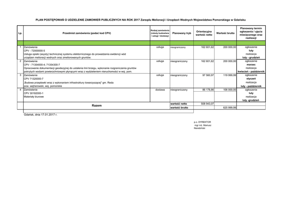 PLAN POSTĘPOWAŃ O UDZIELENIE ZAMOWIEŃ PUBLICZNYCH NA ROK 2017 Zarządu Melioracji i Urządzeń Wodnych Województwa Pomorskiego w Gdańsku Przedmiot zamówienia (podać kod CPV) Lp. 1 2 3 4 Zamówienie CPV - 72000000-5 Usługa opieki (asysty) technicznej systemu elektornicznego do prowadzenia ewidencji wód urządzen melioracji wodnych oraz zmeliorowanych gruntów. Zamówienie CPV - 71354000-4; 71354300-7 Opracowanie dokumentacji geodezyjnej do ustalenia linii brzegu, wykonanie rozgraniczenia gruntów pokrytych wodami powierzchniowymi płynącymi wraz z wydzieleniem nieruchomości w woj. pom. Zamówienie CPV 71320000-7 ,Budowa przepławki wraz z wykonaniem infrastruktury towarzyszącej" gm. Reda pow. wejherowski, woj. pomorskie Zamówienie CPV 30192000-1 Materiały biurowe Razem Rodzaj zamówienia (roboty budowlane / usługi / dostawy) Planowany tryb Orientacyjna wartość netto usługa nieograniczony 162 601,62 usługa nieograniczony 162 601,62 usługa nieograniczony 97 560,97 dostawa nieograniczony 86 178,86 wartość netto 508 943,07 wartość brutto Wartość brutto ogłoszenie luty realizacja luty - grudzień ogłoszenie 200 000,00 marzec realizacja kwiecień - październik ogłoszenie 119 999,99 styczeń realizacja luty - październik 106 000,00 ogłoszenie luty realizacja luty -grudzień 200 000,00 625 999,99 Gdańsk, dnia 17.01.2017 r. p.o. DYREKTOR mgr inż. Mariusz Nierebiński Planowany termin ogłoszenia / ujęcia miesięcznego oraz realizacji