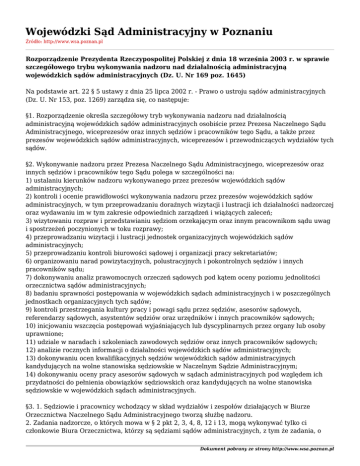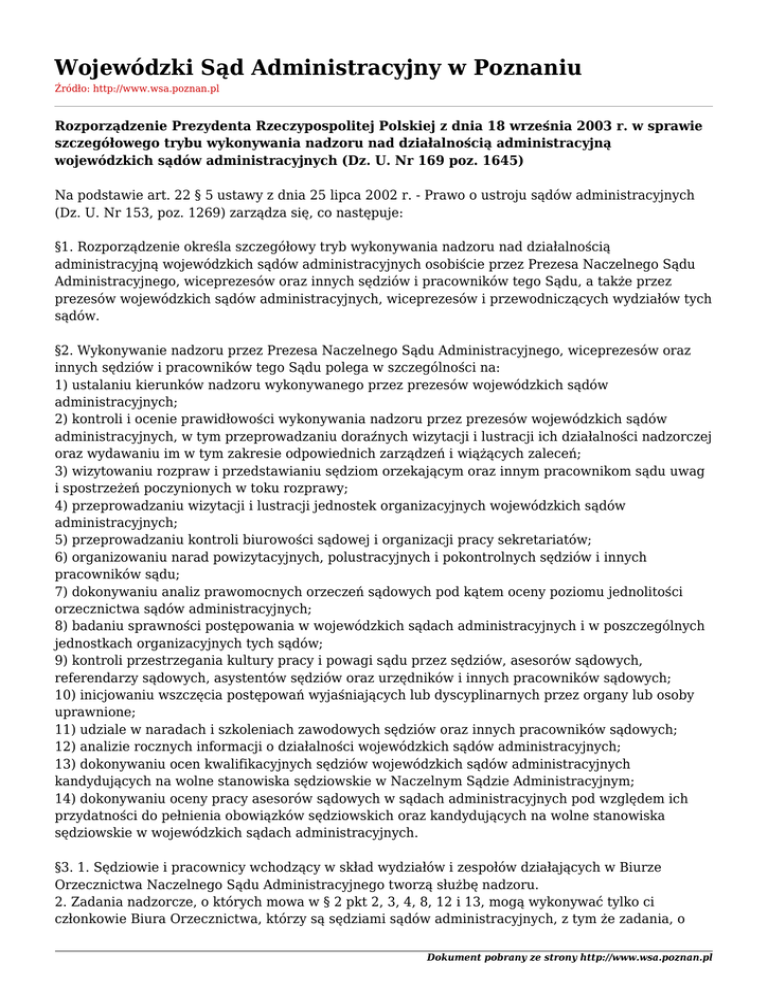 Wojewódzki Sąd Administracyjny w Poznaniu Źródło: http://www.wsa.poznan.pl Rozporządzenie Prezydenta Rzeczypospolitej Polskiej z dnia 18 września 2003 r. w sprawie szczegółowego trybu wykonywania nadzoru nad działalnością administracyjną wojewódzkich sądów administracyjnych (Dz. U. Nr 169 poz. 1645) Na podstawie art. 22 § 5 ustawy z dnia 25 lipca 2002 r. - Prawo o ustroju sądów administracyjnych (Dz. U. Nr 153, poz. 1269) zarządza się, co następuje: §1. Rozporządzenie określa szczegółowy tryb wykonywania nadzoru nad działalnością administracyjną wojewódzkich sądów administracyjnych osobiście przez Prezesa Naczelnego Sądu Administracyjnego, wiceprezesów oraz innych sędziów i pracowników tego Sądu, a także przez prezesów wojewódzkich sądów administracyjnych, wiceprezesów i przewodniczących wydziałów tych sądów. §2. Wykonywanie nadzoru przez Prezesa Naczelnego Sądu Administracyjnego, wiceprezesów oraz innych sędziów i pracowników tego Sądu polega w szczególności na: 1) ustalaniu kierunków nadzoru wykonywanego przez prezesów wojewódzkich sądów administracyjnych; 2) kontroli i ocenie prawidłowości wykonywania nadzoru przez prezesów wojewódzkich sądów administracyjnych, w tym przeprowadzaniu doraźnych wizytacji i lustracji ich działalności nadzorczej oraz wydawaniu im w tym zakresie odpowiednich zarządzeń i wiążących zaleceń; 3) wizytowaniu rozpraw i przedstawianiu sędziom orzekającym oraz innym pracownikom sądu uwag i spostrzeżeń poczynionych w toku rozprawy; 4) przeprowadzaniu wizytacji i lustracji jednostek organizacyjnych wojewódzkich sądów administracyjnych; 5) przeprowadzaniu kontroli biurowości sądowej i organizacji pracy sekretariatów; 6) organizowaniu narad powizytacyjnych, polustracyjnych i pokontrolnych sędziów i innych pracowników sądu; 7) dokonywaniu analiz prawomocnych orzeczeń sądowych pod kątem oceny poziomu jednolitości orzecznictwa sądów administracyjnych; 8) badaniu sprawności postępowania w wojewódzkich sądach administracyjnych i w poszczególnych jednostkach organizacyjnych tych sądów; 9) kontroli przestrzegania kultury pracy i powagi sądu przez sędziów, asesorów sądowych, referendarzy sądowych, asystentów sędziów oraz urzędników i innych pracowników sądowych; 10) inicjowaniu wszczęcia postępowań wyjaśniających lub dyscyplinarnych przez organy lub osoby uprawnione; 11) udziale w naradach i szkoleniach zawodowych sędziów oraz innych pracowników sądowych; 12) analizie rocznych informacji o działalności wojewódzkich sądów administracyjnych; 13) dokonywaniu ocen kwalifikacyjnych sędziów wojewódzkich sądów administracyjnych kandydujących na wolne stanowiska sędziowskie w Naczelnym Sądzie Administracyjnym; 14) dokonywaniu oceny pracy asesorów sądowych w sądach administracyjnych pod względem ich przydatności do pełnienia obowiązków sędziowskich oraz kandydujących na wolne stanowiska sędziowskie w wojewódzkich sądach administracyjnych. §3. 1. Sędziowie i pracownicy wchodzący w skład wydziałów i zespołów działających w Biurze Orzecznictwa Naczelnego Sądu Administracyjnego tworzą służbę nadzoru. 2. Zadania nadzorcze, o których mowa w § 2 pkt 2, 3, 4, 8, 12 i 13, mogą wykonywać tylko ci członkowie Biura Orzecznictwa, którzy są sędziami sądów administracyjnych, z tym że zadania, o Dokument pobrany ze strony http://www.wsa.poznan.pl których mowa w pkt 2 - tylko sędziowie Naczelnego Sądu Administracyjnego. 3. Prezes Naczelnego Sądu Administracyjnego może upoważnić dyrektora lub zastępcę dyrektora Biura Orzecznictwa do podpisywania pism dotyczących nadzoru, o którym mowa w § 2. §4. Wizytacje jednostek organizacyjnych wojewódzkich sądów administracyjnych powinny być przeprowadzane nie rzadziej niż raz na cztery lata. §5. 1. W toku wizytacji bada się w szczególności: obciążenie sędziów stosownie do wpływu i liczby spraw załatwionych oraz stan zaległości, sprawność postępowania sądowego, w tym przygotowanie posiedzeń, wykonywanie czynności w toku postępowania międzyinstancyjnego, w tym terminowość sporządzania uzasadnień oraz wykonywanie czynności po uprawomocnieniu się orzeczenia, a także poziom jednolitości orzecznictwa w wizytowanym sądzie na tle orzecznictwa innych sądów administracyjnych, a zwłaszcza Naczelnego Sądu Administracyjnego. 2. Czynności wizytacyjne kończą się naradą powizytacyjną z udziałem sędziów wizytowanej jednostki organizacyjnej wojewódzkiego sądu administracyjnego. §6. 1. Z przebiegu wizytacji sporządza się sprawozdanie zawierające w szczególności dokonane ustalenia i ocenę pracy wizytowanego sądu lub jego poszczególnych jednostek organizacyjnych, w tym skuteczność wnoszonych środków odwoławczych, wskazanie uchybień oraz ewentualne wnioski o wytknięcie naruszeń obowiązków służbowych, albo o wszczęcie postępowań wyjaśniających lub dyscyplinarnych, a w razie potrzeby także wnioski o wystąpienie o podjęcie uchwały wyjaśniającej przepisy prawne lub o unieważnienie prawomocnego orzeczenia. 2. Sprawozdanie z wizytacji wraz z projektem zarządzeń powizytacyjnych przedstawia się Prezesowi Naczelnego Sądu Administracyjnego za pośrednictwem dyrektora Biura Orzecznictwa tego Sądu najpóźniej w terminie 30 dni od zakończenia wizytacji. §7. 1. Prezes Naczelnego Sądu Administracyjnego przekazuje prezesowi wizytowanego sądu sprawozdanie z wizytacji i na jego podstawie wydaje zarządzenia powizytacyjne, ustalając termin ich wykonania, a w razie potrzeby inicjuje działania dyscyplinujące. 2. Prezes wojewódzkiego sądu administracyjnego zwołuje - jeżeli uzasadniają to wnioski powizytacyjne - w terminie jednego miesiąca od dnia otrzymania protokołu z wizytacji - naradę w celu omówienia wyników wizytacji, z udziałem wiceprezesa (wiceprezesów), przewodniczących wydziałów, sędziów, asesor