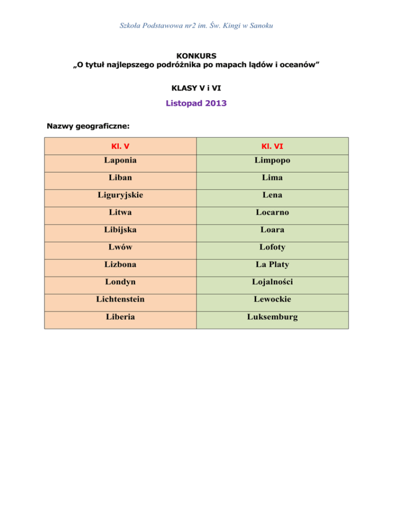 Szkoła Podstawowa nr2 im. Św. Kingi w Sanoku KONKURS „O tytuł najlepszego podróżnika po mapach lądów i oceanów” KLASY V i VI Listopad 2013 Nazwy geograficzne: Kl. V Kl. VI Laponia Limpopo Liban Lima Liguryjskie Lena Litwa Locarno Libijska Loara Lwów Lofoty Lizbona La Platy Londyn Lojalności Lichtenstein Lewockie Liberia Luksemburg