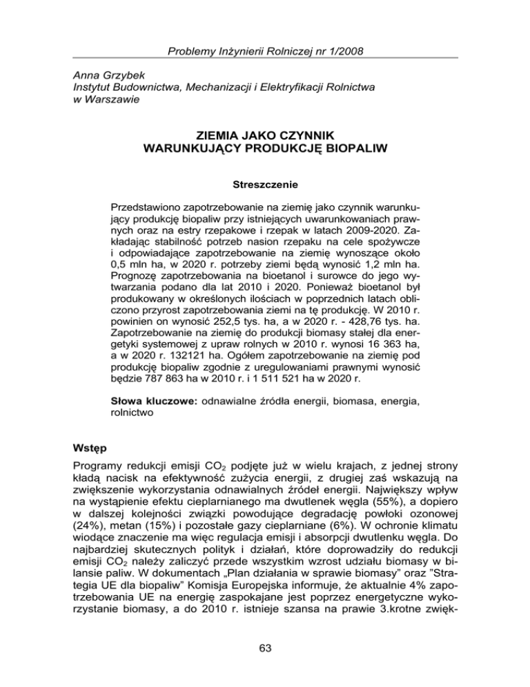 Problemy Inżynierii Rolniczej nr 1/2008 Anna Grzybek Instytut Budownictwa, Mechanizacji i Elektryfikacji Rolnictwa w Warszawie ZIEMIA JAKO CZYNNIK WARUNKUJĄCY PRODUKCJĘ BIOPALIW Streszczenie Przedstawiono zapotrzebowanie na ziemię jako czynnik warunkujący produkcję biopaliw przy istniejących uwarunkowaniach prawnych oraz na estry rzepakowe i rzepak w latach 2009-2020. Zakładając stabilność potrzeb nasion rzepaku na cele spożywcze i odpowiadające zapotrzebowanie na ziemię wynoszące około 0,5 mln ha, w 2020 r. potrzeby ziemi będą wynosić 1,2 mln ha. Prognozę zapotrzebowania na bioetanol i surowce do jego wytwarzania podano dla lat 2010 i 2020. Ponieważ bioetanol był produkowany w określonych ilościach w poprzednich latach obliczono przyrost zapotrzebowania ziemi na tę produkcję. W 2010 r. powinien on wynosić 252,5 tys. ha, a w 2020 r. - 428,76 tys. ha. Zapotrzebowanie na ziemię do produkcji biomasy stałej dla energetyki systemowej z upraw rolnych w 2010 r. wynosi 16 363 ha, a w 2020 r. 132121 ha. Ogółem zapotrzebowanie na ziemię pod produkcję biopaliw zgodnie z uregulowaniami prawnymi wynosić będzie 787 863 ha w 2010 r. i 1 511 521 ha w 2020 r. Słowa kluczowe: odnawialne źródła energii, biomasa, energia, rolnictwo Wstęp Programy redukcji emisji CO2 podjęte już w wielu krajach, z jednej strony kładą nacisk na efektywność zużycia energii, z drugiej zaś wskazują na zwiększenie wykorzystania odnawialnych źródeł energii. Największy wpływ na wystąpienie efektu cieplarnianego ma dwutlenek węgla (55%), a dopiero w dalszej kolejności związki powodujące degradację powłoki ozonowej (24%), metan (15%) i pozostałe gazy cieplarniane (6%). W ochronie klimatu wiodące znaczenie ma więc regulacja emisji i absorpcji dwutlenku węgla. Do najbardziej skutecznych polityk i działań, które doprowadziły do redukcji emisji CO2 należy zaliczyć przede wszystkim wzrost udziału biomasy w bilansie paliw. W dokumentach „Plan działania w sprawie biomasy” oraz ”Strategia UE dla biopaliw” Komisja Europejska informuje, że aktualnie 4% zapotrzebowania UE na energię zaspokajane jest poprzez energetyczne wykorzystanie biomasy, a do 2010 r. istnieje szansa na prawie 3.krotne zwięk- 63 Anna Grzybek szenie udziału biomasy w pokrywaniu potrzeb energetycznych UE w porównaniu do 2003 r. Na posiedzeniach Rady Europy, w dniach 8–9 marca 2007 r., przesądzono konieczność osiągnięcia 20% udziału energii ze źródeł odnawialnych w całej Unii Europejskiej oraz minimum 10% udziału biopaliw w każdym z państw do 2020 r. Celem pracy jest określenie zapotrzebowania na ziemię pod biomasę pochodzącą z upraw rolnych w aspekcie istniejących uwarunkowań prawnych i potrzeb żywnościowych. Zakres pracy dotyczy zapotrzebowania na ziemię pod produkcję biomasy na biopaliwa pierwszej generacji, w tym stałe i ciekłe. Przy produkcji bioetanolu nie uwzględniono nowych technologii otrzymywania bioetanolu z roślin ligno-celulozowych, aktualnie te technologie nie są dojrzałe i pracują w instalacjach modelowych. Materiał i metody Obliczenia ilości potrzebnej biomasy na cele energetyczne dokonano na podstawie istniejących i obowiązujących dokumentów prawnych. W 2007 r. został opracowany i przyjęty przez Radę Ministrów „Wieloletni program promocji biopaliw lub innych paliw odnawialnych na lata 2008-2014, stanowi on wykonanie art. 37 ustawy z dnia 25 sierpnia 2006 r. o biokomponentach i biopaliwach ciekłych. Wieloletni program promocji biopaliw na lata 20082014 przedstawia mechanizmy wsparcia dla produkcji biokomponentów w zakresie systemu podatkowego, a szczególnie zwolnienia od podatku akcyzowego, podatku dochodowego od osób prawnych, zwolnienia z opłaty paliwowej. Biorąc pod uwagę wartości brzegowe minimalnego udziału biokomponentów w rynku paliw transportowych, przewiduje się, że ścieżka dochodzenia do tych wielkości w Polsce w latach 2008-2014, jako Narodowy Cel Wskaźnikowy, kształtuje się jak pokazano na wykresie (rys. 1). 12% 10% 8% 6% 4% 2,30% 2% 3,45% 4,60% 7,55% 6,65% 7,10% 6,20% 5,75% 8,35% 9,15% 10% 0% 2007 2008 2009 2010 2011 2012 2013 2014 2016 2018 2020 Lata Źródło: Opracowanie na podstawie „Wieloletniego programu promocji biopaliw lub innych paliw odnawialnych na lata 2008-2014, dalej opracowanie własne Rys. 1. Narodowy Cel Wskaźnikowy Fig. 1. National Indicatory Project to be realized 64 Ziemia jako czynnik... Po 2014 r. założono i przedstawiono na wykresie proporcjonalną ścieżkę dojścia do uzyskania 10% biopaliw w 2020 r. w ogólnej ilości paliw ciekłych ciekłych w ciągu roku kalendarzowego w transporcie wg wartości energetycznej. W 2008 r. wartość Narodowego Celu Wskaźnikowego wynosi 3,45% (rys. 1). Po 2014 r., tj. okresie, kiedy nie ma określonego celu wskaźnikowego zaproponowano proporcjonalny przyrost NCW do 10% w 2020 r. (nowe propozycje UE). W celu określenia produkcji i spożycia rzepaku oraz powierzchni jego uprawy w kolejnych latach wykorzystano materiały GUS. Posłużyły one również do określenia powierzchni pod uprawy roślin wysokoskrobiowych z przeznaczeniem na bioetanol. Ilość biopaliw stałych na potrzeby produkcji energii elektrycznej została określona w Rozporządzeniu Ministra Gospodarki, wydawanym w kolejnych latach. Zgodnie z Rozporządzeniem Ministra Gospodarki z dnia 19 grudnia 2005 r. w sprawie szczegółowego zakresu obowiązków uzyskania i przedstawienia do umorzenia świadectw pochodzenia, uiszczenia opłaty zastępczej oraz zakupu energii elektrycznej i ciepła wytworzonych w odnawialnych źródłach energii podano, że w przypadku elektrowni lub elektrociepłowni (cytuję „jednostki wytwórczej, albo układu hybrydowego”), w którym spalana jest biomasa, w źródłach o mocy wyższej niż 5 MW, do energii wytworzonej w odnawialnych źródłach energii zalicza się energię elektryczną lub ciepło, o ile udział wagowy biomasy pochodzącej