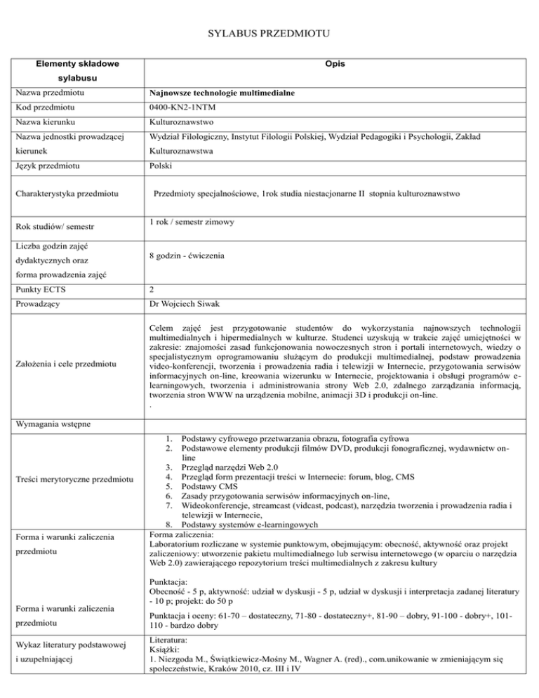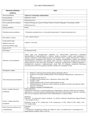 SYLABUS PRZEDMIOTU Elementy składowe Opis sylabusu Nazwa przedmiotu Najnowsze technologie multimedialne Kod przedmiotu 0400-KN2-1NTM Nazwa kierunku Kulturoznawstwo Nazwa jednostki prowadzącej Wydział Filologiczny, Instytut Filologii Polskiej, Wydział Pedagogiki i Psychologii, Zakład kierunek Kulturoznawstwa Język przedmiotu Polski Charakterystyka przedmiotu Rok studiów/ semestr Przedmioty specjalnościowe, 1rok studia niestacjonarne II stopnia kulturoznawstwo 1 rok / semestr zimowy Liczba godzin zajęć dydaktycznych oraz 8 godzin - ćwiczenia forma prowadzenia zajęć Punkty ECTS 2 Prowadzący Dr Wojciech Siwak Założenia i cele przedmiotu Celem zajęć jest przygotowanie studentów do wykorzystania najnowszych technologii multimedialnych i hipermedialnych w kulturze. Studenci uzyskują w trakcie zajęć umiejętności w zakresie: znajomości zasad funkcjonowania nowoczesnych stron i portali internetowych, wiedzy o specjalistycznym oprogramowaniu służącym do produkcji multimedialnej, podstaw prowadzenia video-konferencji, tworzenia i prowadzenia radia i telewizji w Internecie, przygotowania serwisów informacyjnych on-line, kreowania wizerunku w Internecie, projektowania i obsługi programów elearningowych, tworzenia i administrowania strony Web 2.0, zdalnego zarządzania informacją, tworzenia stron WWW na urządzenia mobilne, animacji 3D i produkcji on-line. . Wymagania wstępne Treści merytoryczne przedmiotu Forma i warunki zaliczenia przedmiotu Forma i warunki zaliczenia przedmiotu Wykaz literatury podstawowej i uzupełniającej 1. Podstawy cyfrowego przetwarzania obrazu, fotografia cyfrowa 2. Podstawowe elementy produkcji filmów DVD, produkcji fonograficznej, wydawnictw online 3. Przegląd narzędzi Web 2.0 4. Przegląd form prezentacji treści w Internecie: forum, blog, CMS 5. Podstawy CMS 6. Zasady przygotowania serwisów informacyjnych on-line, 7. Wideokonferencje, streamcast (vidcast, podcast), narzędzia tworzenia i prowadzenia radia i telewizji w Internecie, 8. Podstawy systemów e-learningowych Forma zaliczenia: Laboratorium rozliczane w systemie punktowym, obejmującym: obecność, aktywność oraz projekt zaliczeniowy: utworzenie pakietu multimedialnego lub serwisu internetowego (w oparciu o narzędzia Web 2.0) zawierającego repozytorium treści multimedialnych z zakresu kultury Punktacja: Obecność - 5 p, aktywność: udział w dyskusji - 5 p, udział w dyskusji i interpretacja zadanej literatury - 10 p; projekt: do 50 p Punktacja i oceny: 61-70 – dostateczny, 71-80 - dostateczny+, 81-90 – dobry, 91-100 - dobry+, 101110 - bardzo dobry Literatura: Książki: 1. Niezgoda M., Świątkiewicz-Mośny M., Wagner A. (red)., com.unikowanie w zmieniającym się społeczeństwie, Kraków 2010, cz. III i IV 2. Olszański L., Dziennikarstwo internetowe, WAiP, Warszawa 2006, rozdz. 1, 4, 6, 7 3. Manovich L., Język nowych mediów,WAiP. Warszawa 2006, rozdz. Czym są nowe media Internet: Blog Kultura 2.0, http://kultura20.blog.polityka.pl/ ………………………………. podpis osoby składającej sylabus